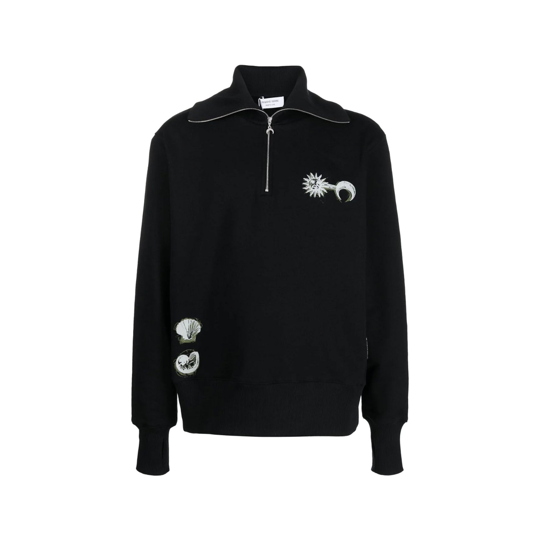 無地のアイテムが多いハーフジップセーターですが、少しエッジの効いたアイテムが欲しいという時におすすめなのが「マリーン・セル(Marine Serre)」のもの。フロントにブランドのアイコニックな三日月、バックにも大きめのグラフィックプリントがあしらわれています。オーガニックコットン100%の素材なので、肌触りもグッド。