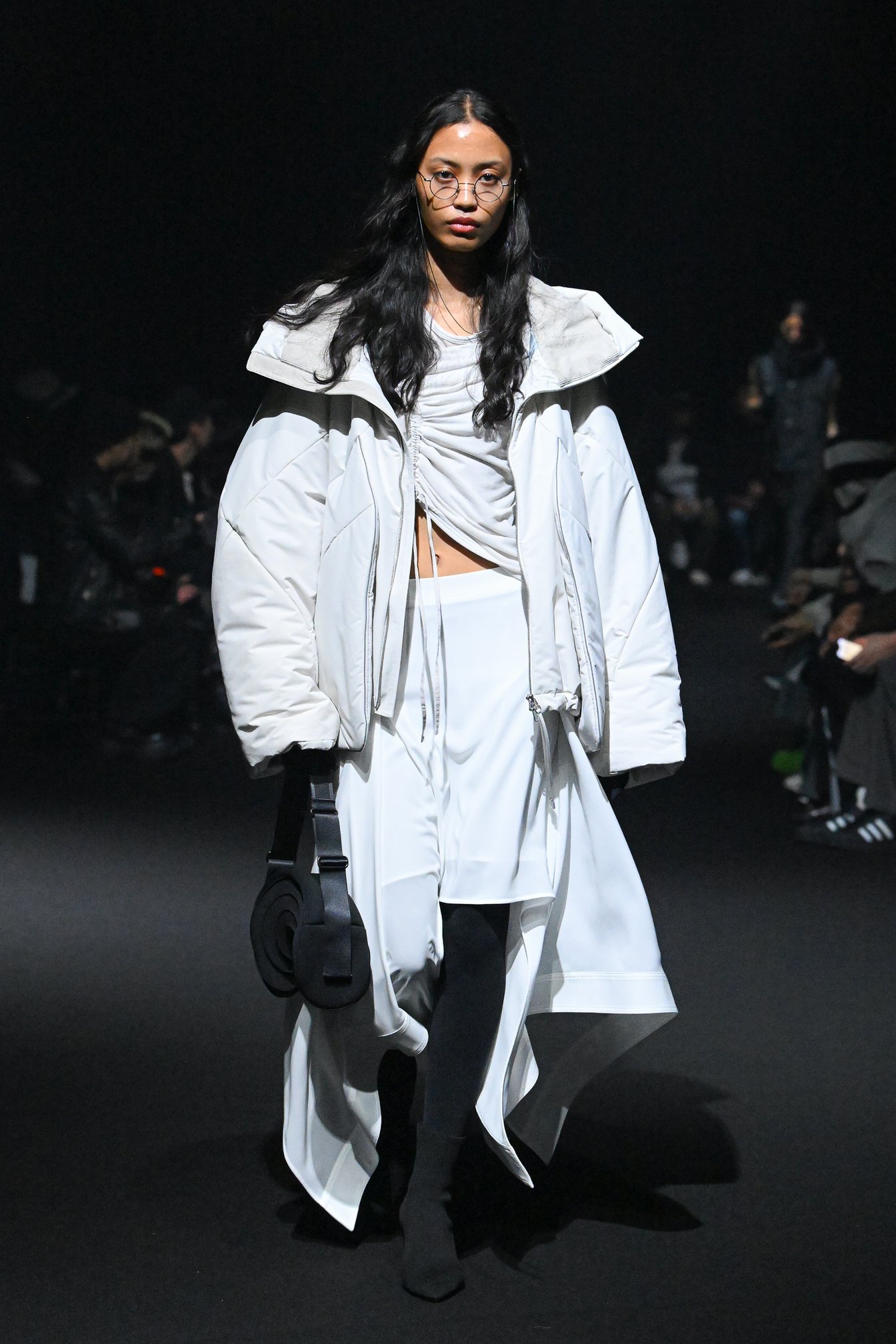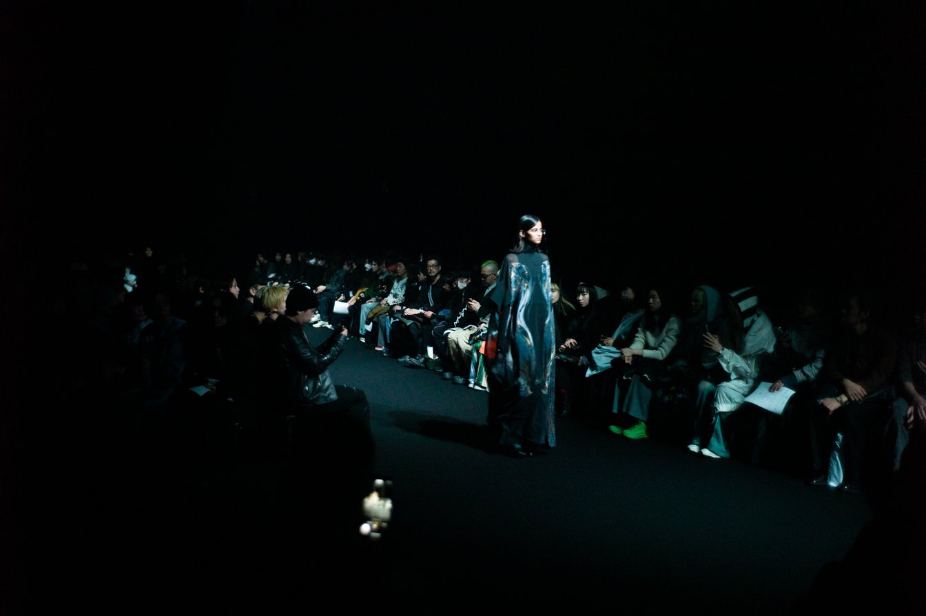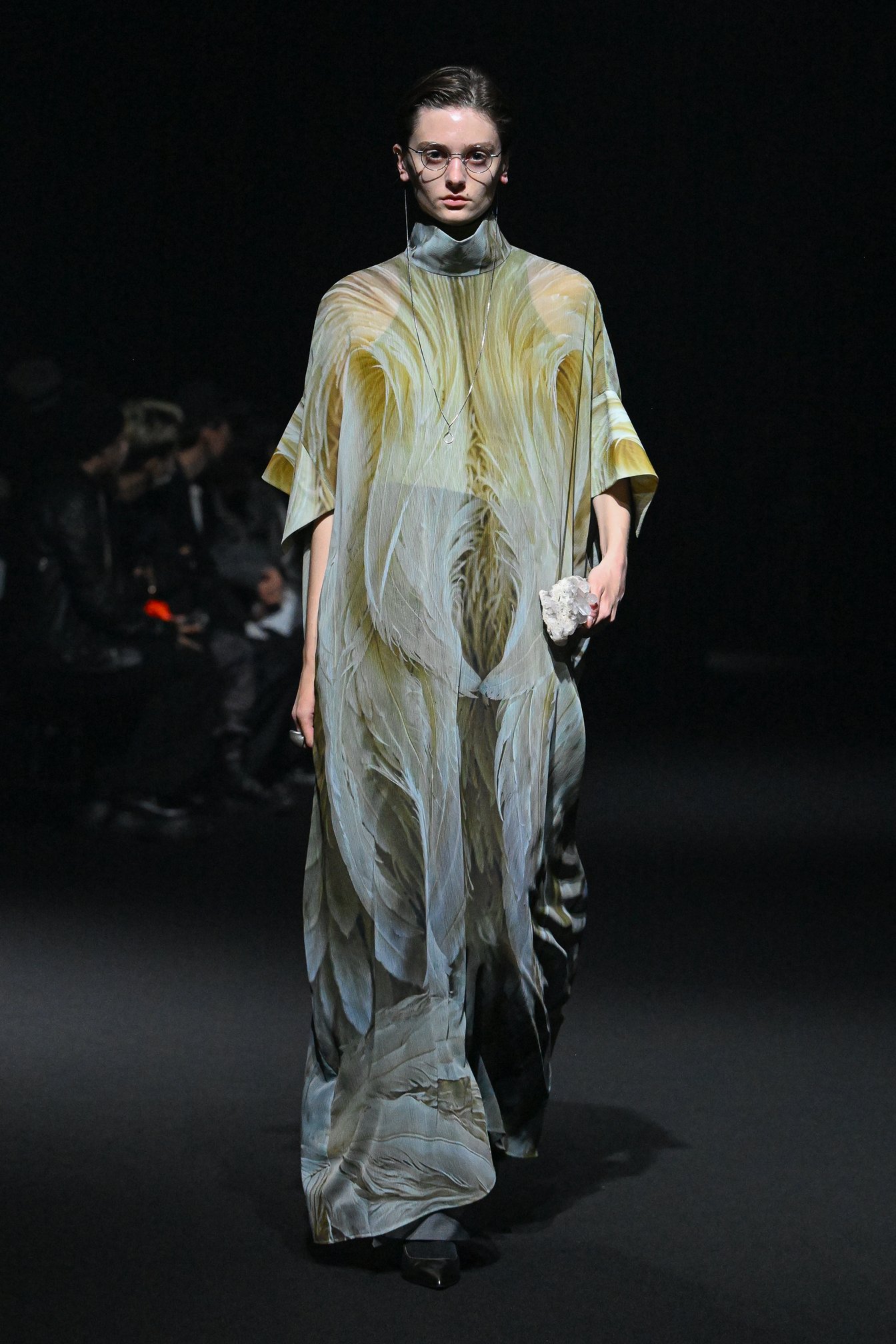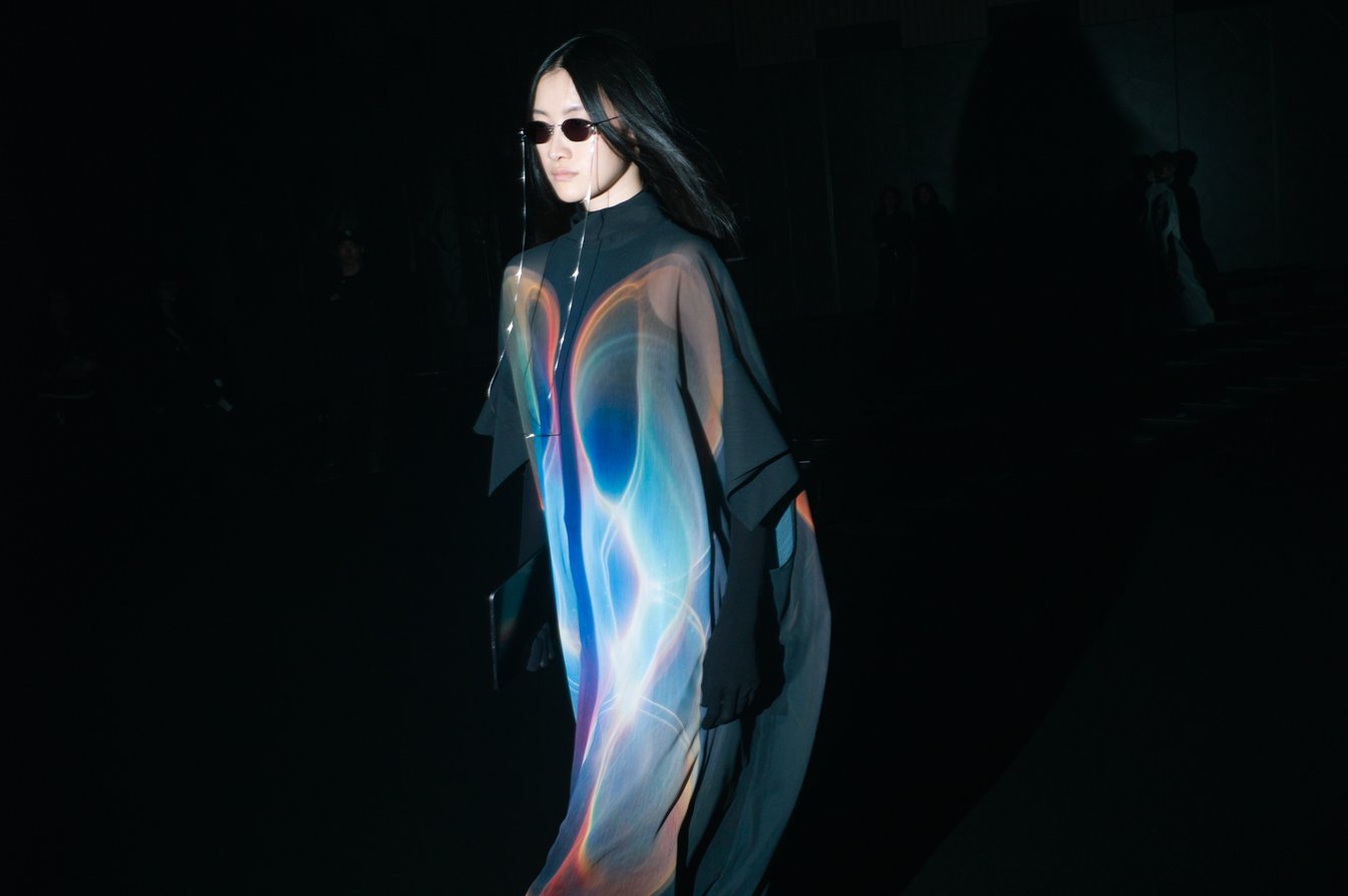 これまで静止したルック画像のなかで、なにか揺れや動きの間にあるようなグラフィックデザインやシルエットを描き出していたハトラにとって、今回は動的な状態、まさに出発点からランウェイという通過点を歩き、戻っていくリミナルな状態を立体的に見せるのは初めての機会だった。これまでのハトラのコレクションを凝縮させたような象徴的なルックが次々と螺旋状のランウェイを通り過ぎる。秋冬シーズンだが、軽やかなシフォン素材のドレスやメッシュ素材のガウンとパンツに肌の露出が多かったのは、あえて生身の人間が見せる妖艶さを引き出すためだったように感じた。正直なところあまりのまとまりの良さに、過去のコレクションアイテムも混ぜながらでもより多くのルックを見たいと思う物足りなさもあったが、逆を言えば今回のショーのアイデアとして「走馬灯」を意識していたという長見が想定していた時間の流れ方だったのかもしれない。