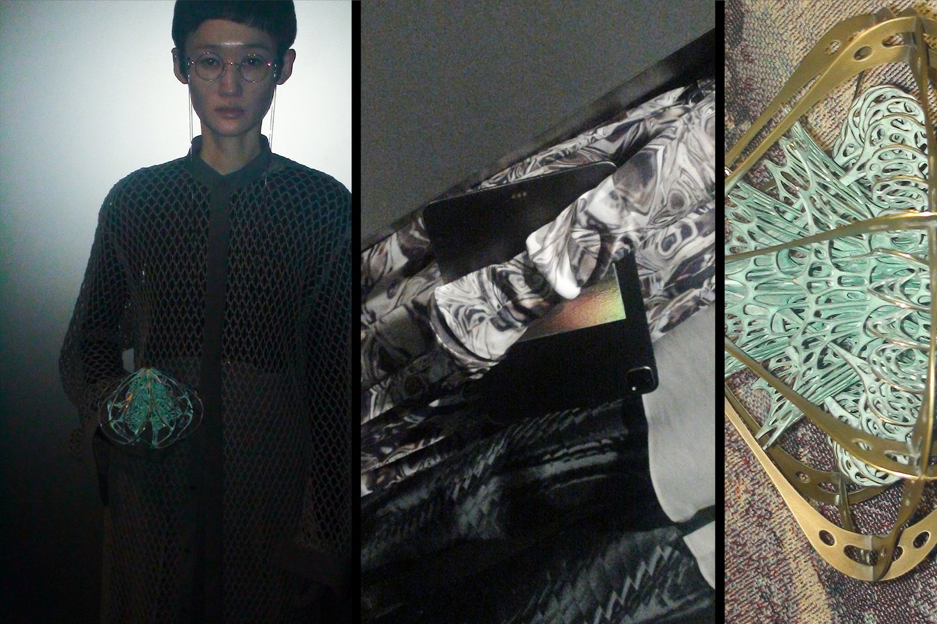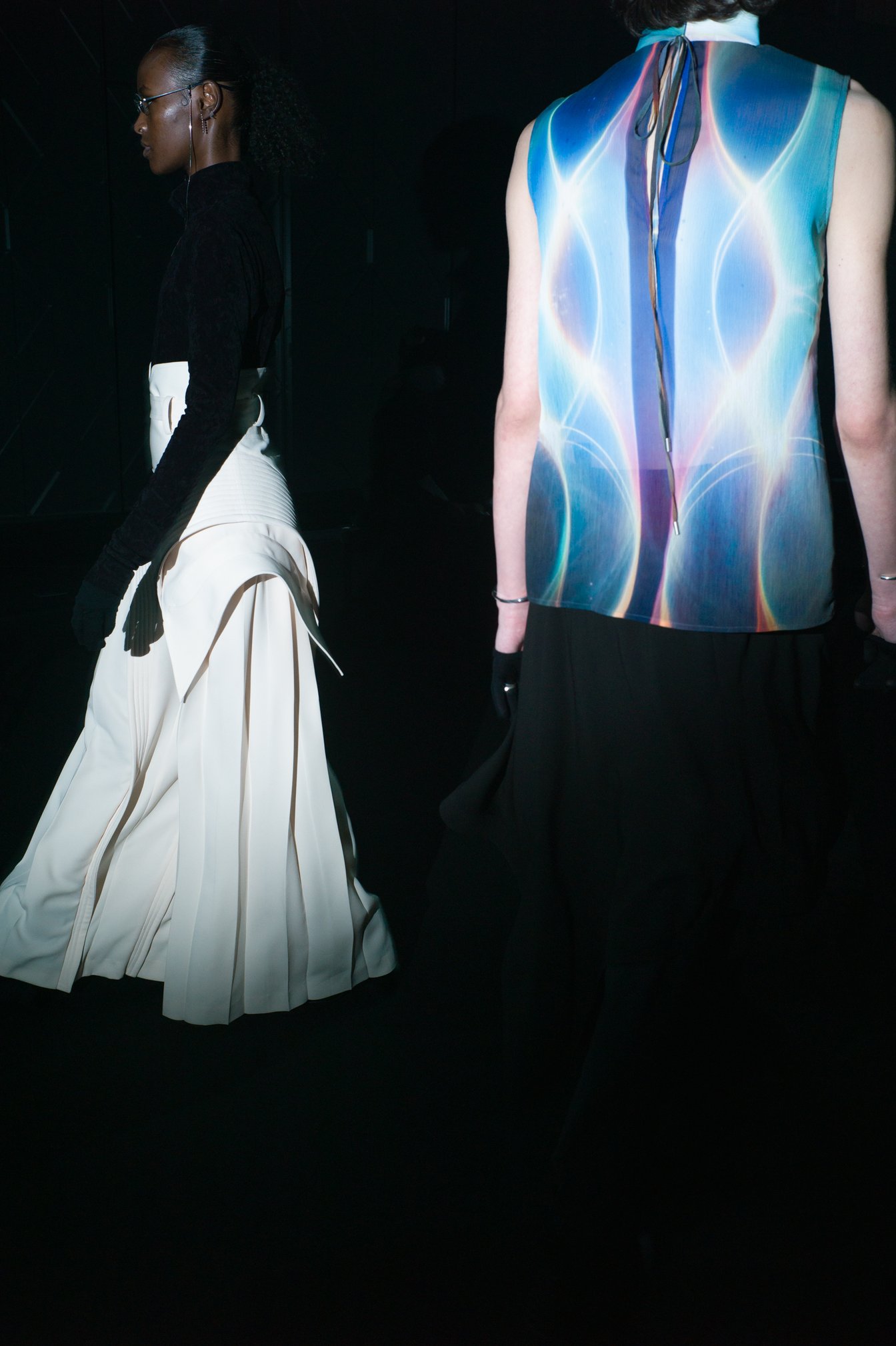 ショーの翌日そんなことを反芻しながら、公開されたショーの記録画像を見ると驚きがあった。暗闇の中からぼんやりと浮かび上がるモデルの顔と露出部分、目がくらむような地球の景色が流れ込んだグラフィック柄のドレス、そしてブラックカラーのアイテムや余白は背景と同化し、よりグラフィックの揺れや輝き、終盤に登場した構築的なパンツのシルエットがトロンプルイユのように映っていた。このビジュアルまで計算したのかは定かだが、「WALKER」がつくられるまでの15年間にわたるハトラの抜かりない審美眼が光っていた。
