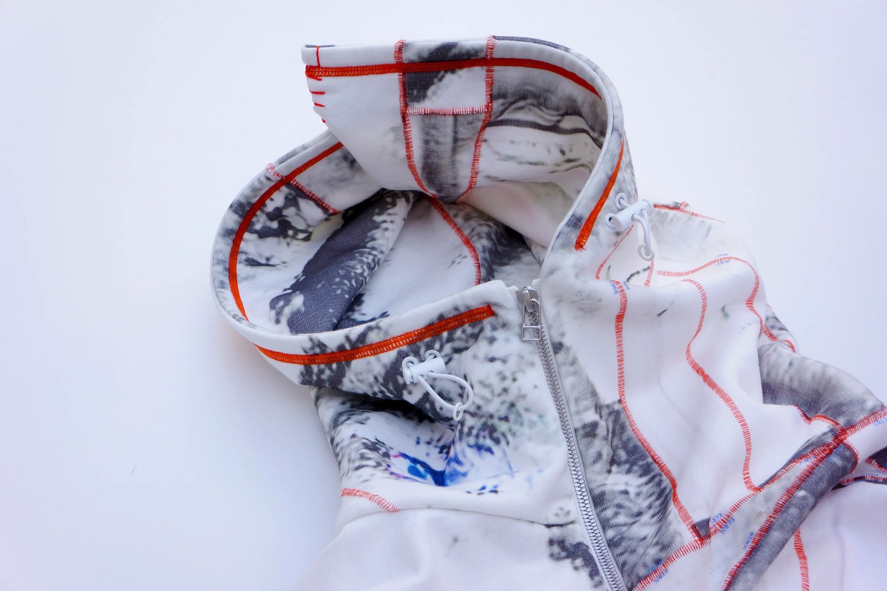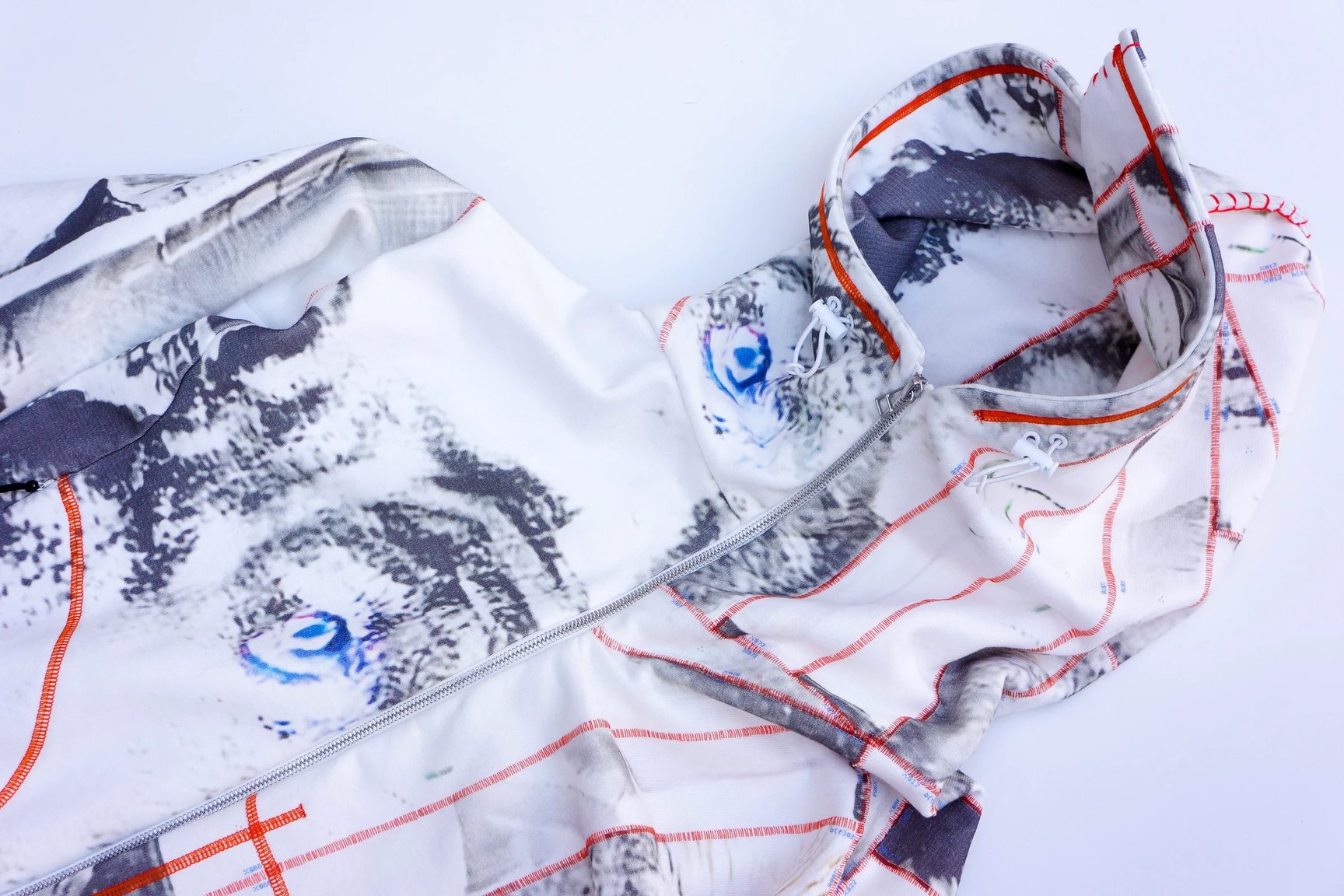「AUBIK」についてもうひとつ重要なのは、新しい「線」の創出である。もともと「AUBIK」の核としてあったのは、おそらくSynfluxのアルゴリズミック・クチュール──アルゴリズムを用いて可能な限り廃棄の出ないパターンを探る技術──によって実現された、HATRAのシグネチャーとも言えるフーディーのパターンの再構築であろう。アルゴリズミック・クチュールという技術は、一般的にはゼロウェイストをめざした「効率化」のための技術とされる。実際、それはある側面においては正しい。しかしながら、HATRAがその技術を活用するときには、効率化のみならず──もっと言えば効率化よりも──、通常のパターンメイキングの想像力では生まれえないような「線」を模索するためのもののように思われる。
