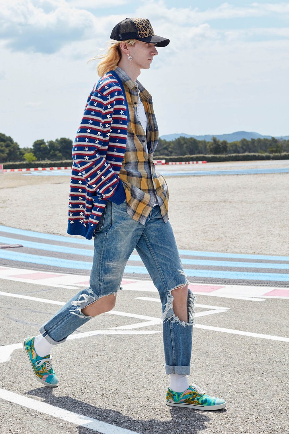 F1フランスグランプリの開催地でもあるポール・リカール・サーキット(Circuit Du Castellet)を歩くモデルたちのスタイルを一目見れば、変貌したことが瞬時にわかる。ルーズなシルエット、カジュアルな素材、色と柄のミックスと、「セリーヌ」で新境地を開拓したと思われたフレンチシックとは完全に一線を画す。