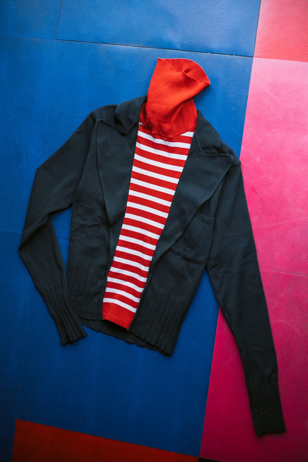 JUNJI:騙し絵のテクニックは昔から散りばめられていましたが、1995年あたりからより騙し絵のアイテムは多くなりました。黒のカーディガンと赤白のボーダーを組み合わせた騙し絵ニットも1997年に購入しました。スパンコールがあしらわれているデニムの騙し絵は2013年春夏コレクションのものなので、継続的に騙し絵のデザインは取り組んでいると言えますね。