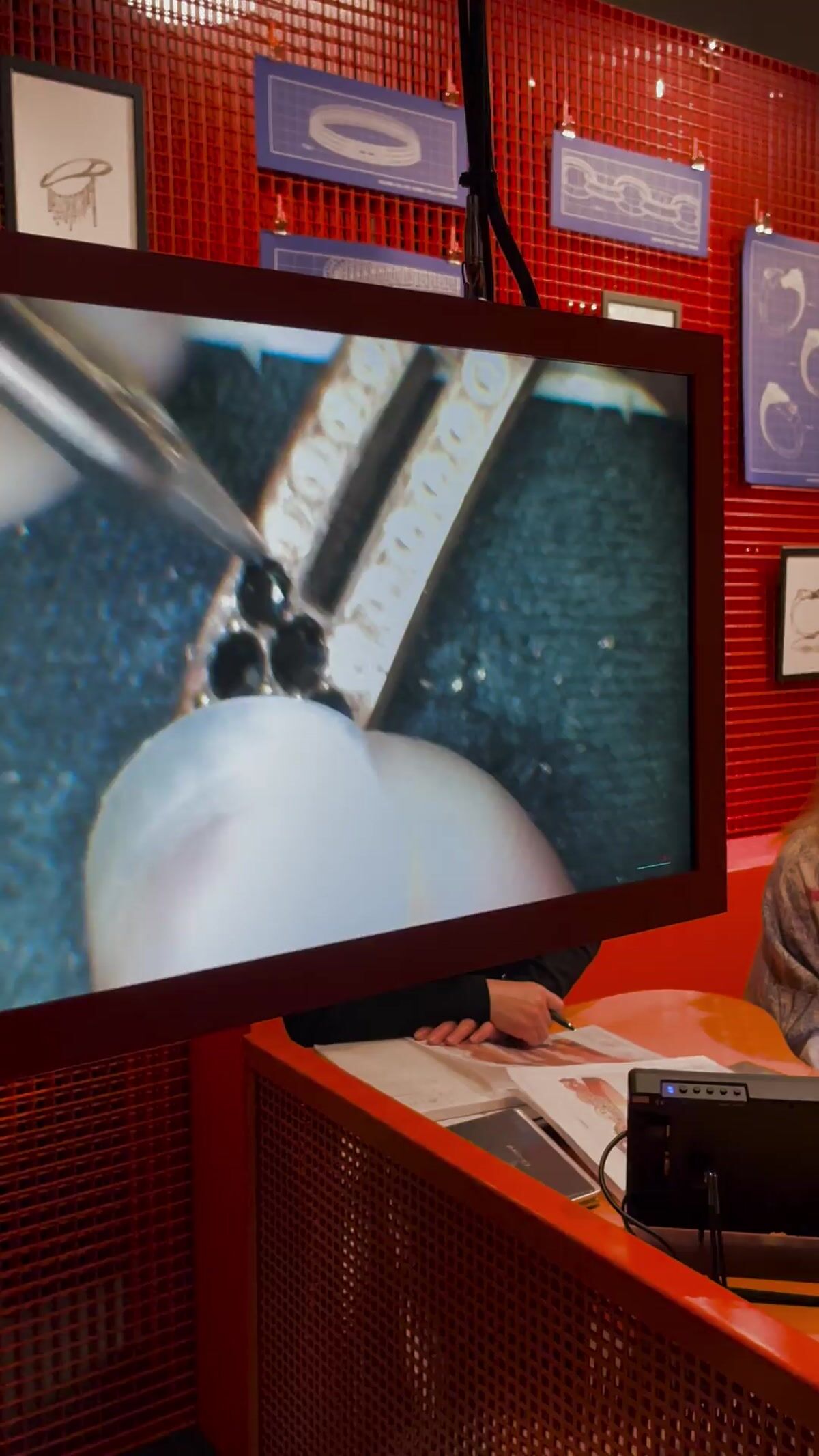 ジュエリー本体に宝石を固定する石留めの技術。綿密な手仕事をモニターを通じて見ることができる。