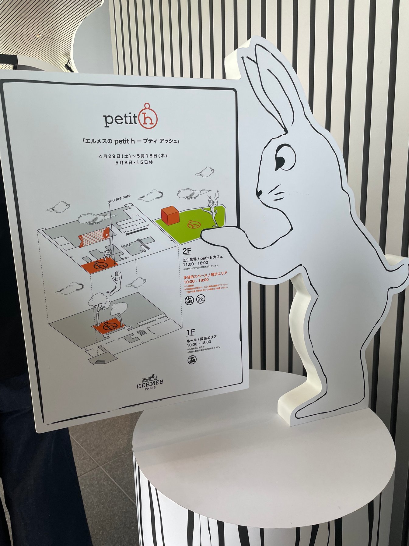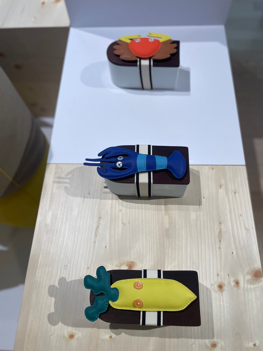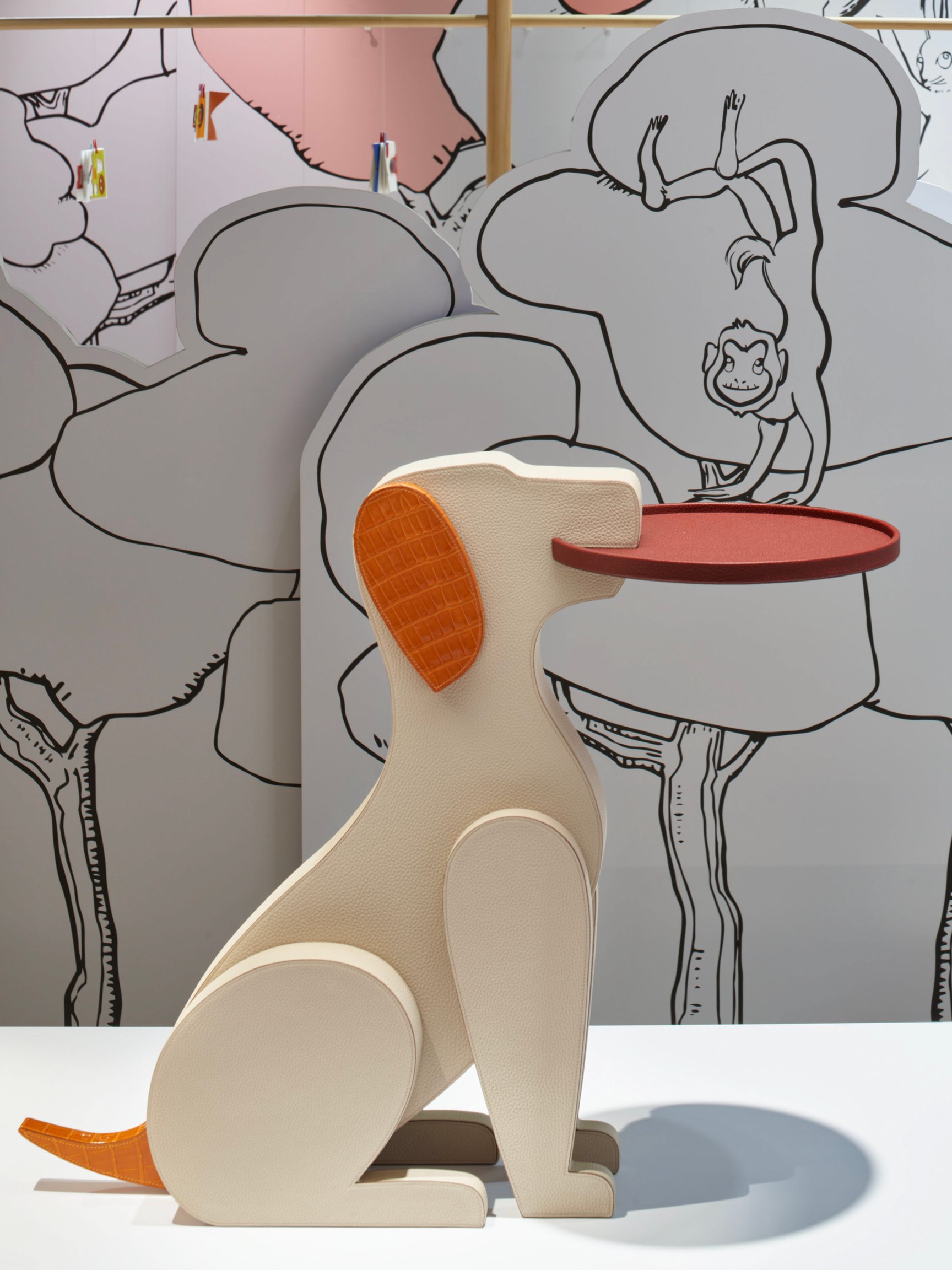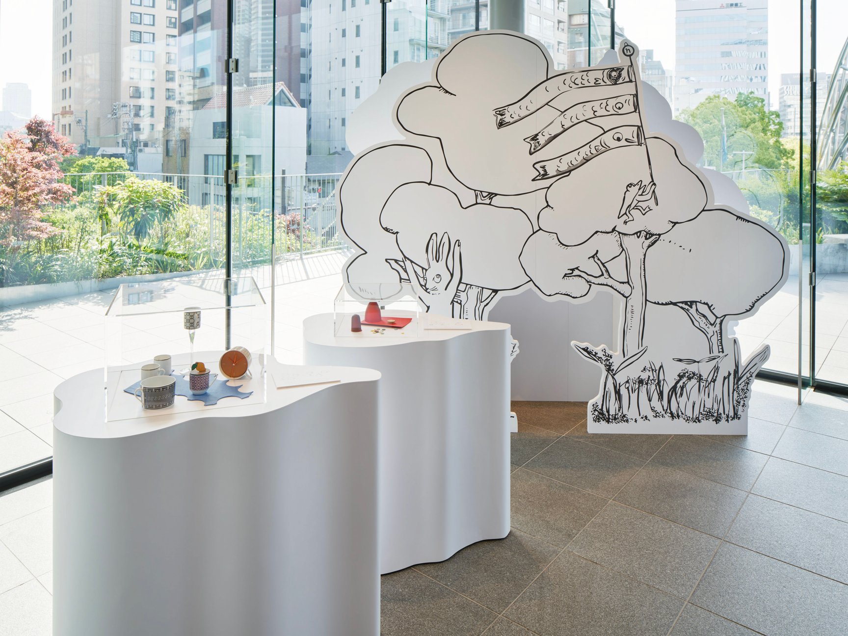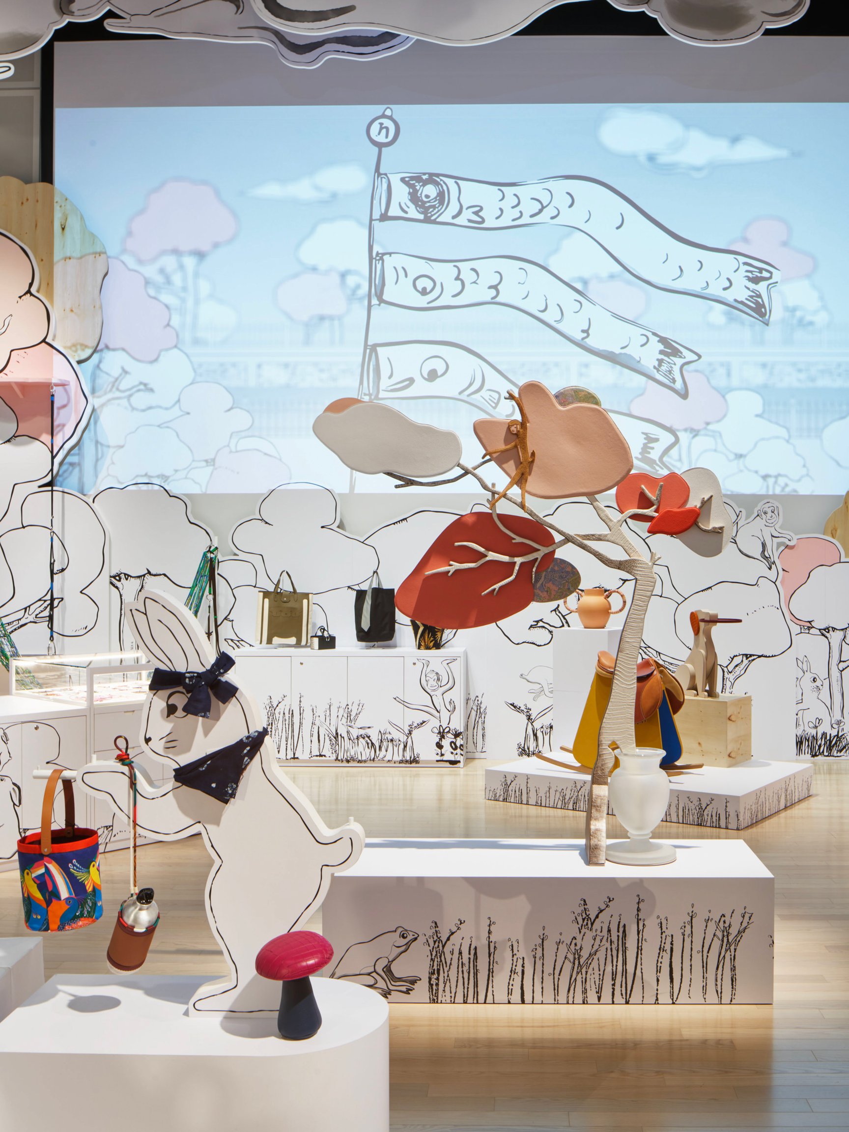 会場となったのは昨年開館した大阪中之島美術館。「petit h」の取り組みや、クリエイションプロセスを体感できる2フロア構成で、空間デザインはこれまでにも同プロジェクトに長く携わってきたアーティストの河原シンスケが手掛けた。12世紀の日本の墨画である「鳥獣戯画」からインスピレーションを得て、自身のアイコンでもあるウサギや猿、蛙、そしてエルメスを象徴する馬といったキャラクターを会場の案内役に、「書割(かきわり)」という歌舞伎などでも使われる舞台芸術の手法を用い、パネルやオブジェなどで、ファンタジックな世界に没入できるような空間に仕上げている。