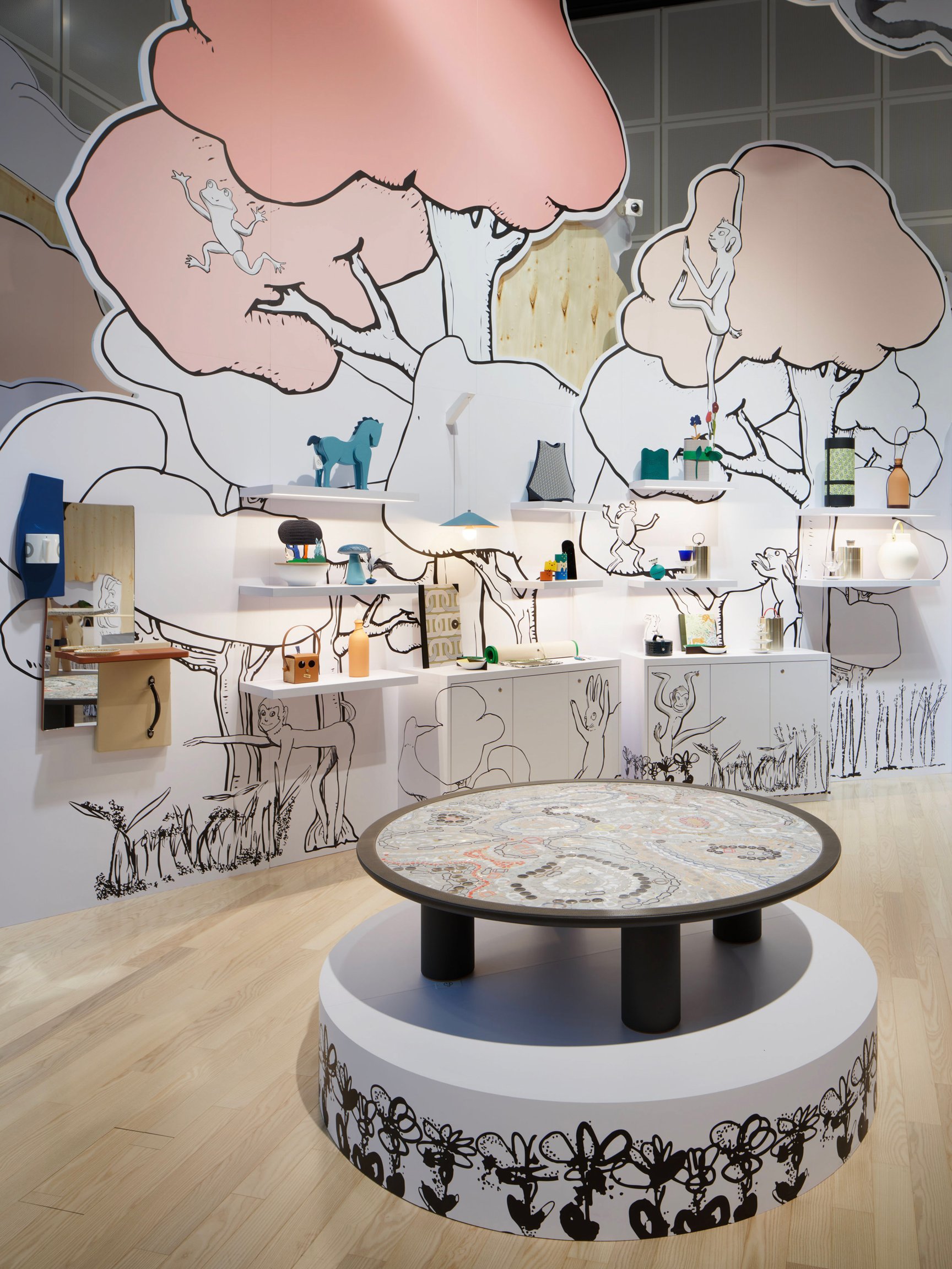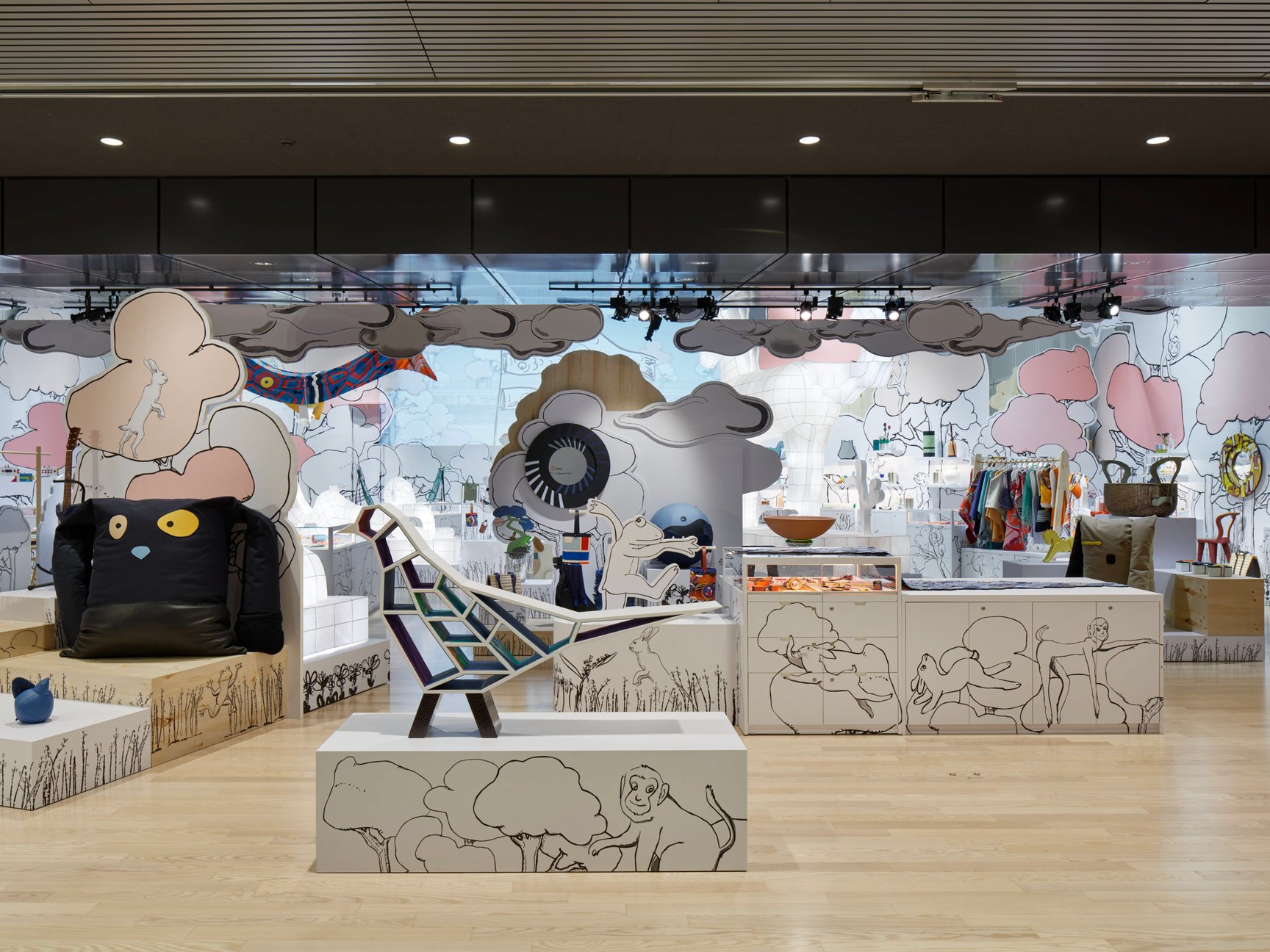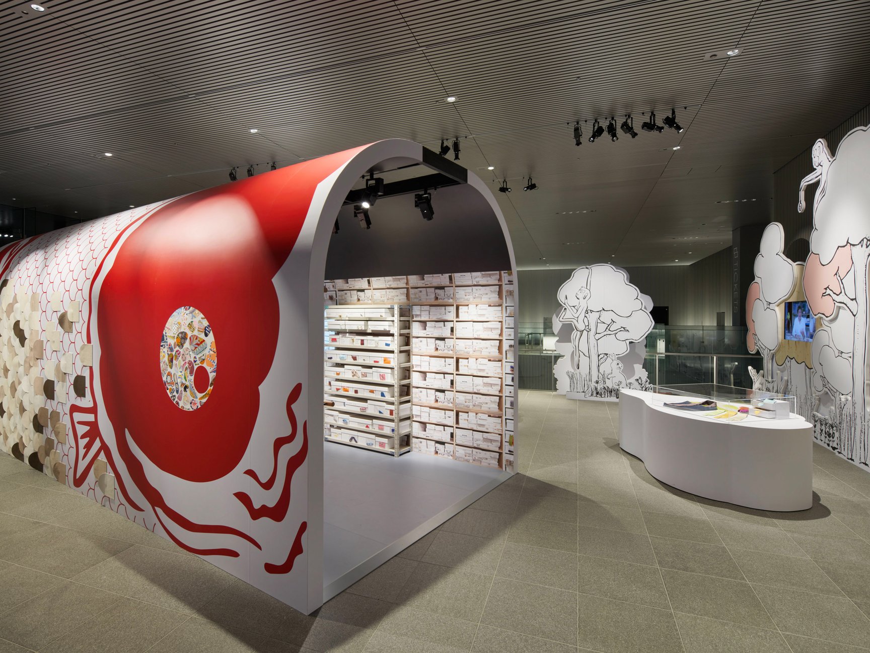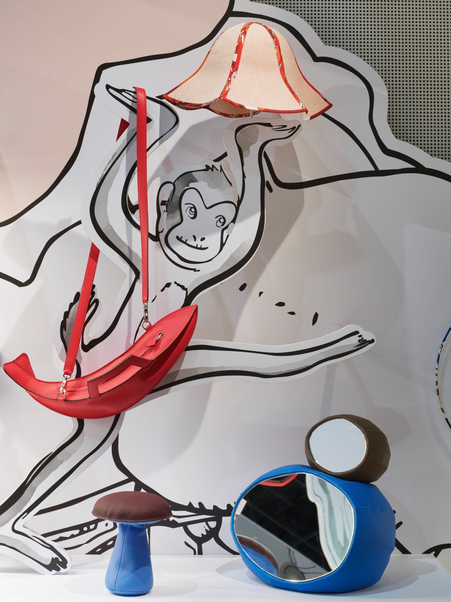 会場となったのは昨年開館した大阪中之島美術館。「petit h」の取り組みや、クリエイションプロセスを体感できる2フロア構成で、空間デザインはこれまでにも同プロジェクトに長く携わってきたアーティストの河原シンスケが手掛けた。12世紀の日本の墨画である「鳥獣戯画」からインスピレーションを得て、自身のアイコンでもあるウサギや猿、蛙、そしてエルメスを象徴する馬といったキャラクターを会場の案内役に、「書割(かきわり)」という歌舞伎などでも使われる舞台芸術の手法を用い、パネルやオブジェなどで、ファンタジックな世界に没入できるような空間に仕上げている。