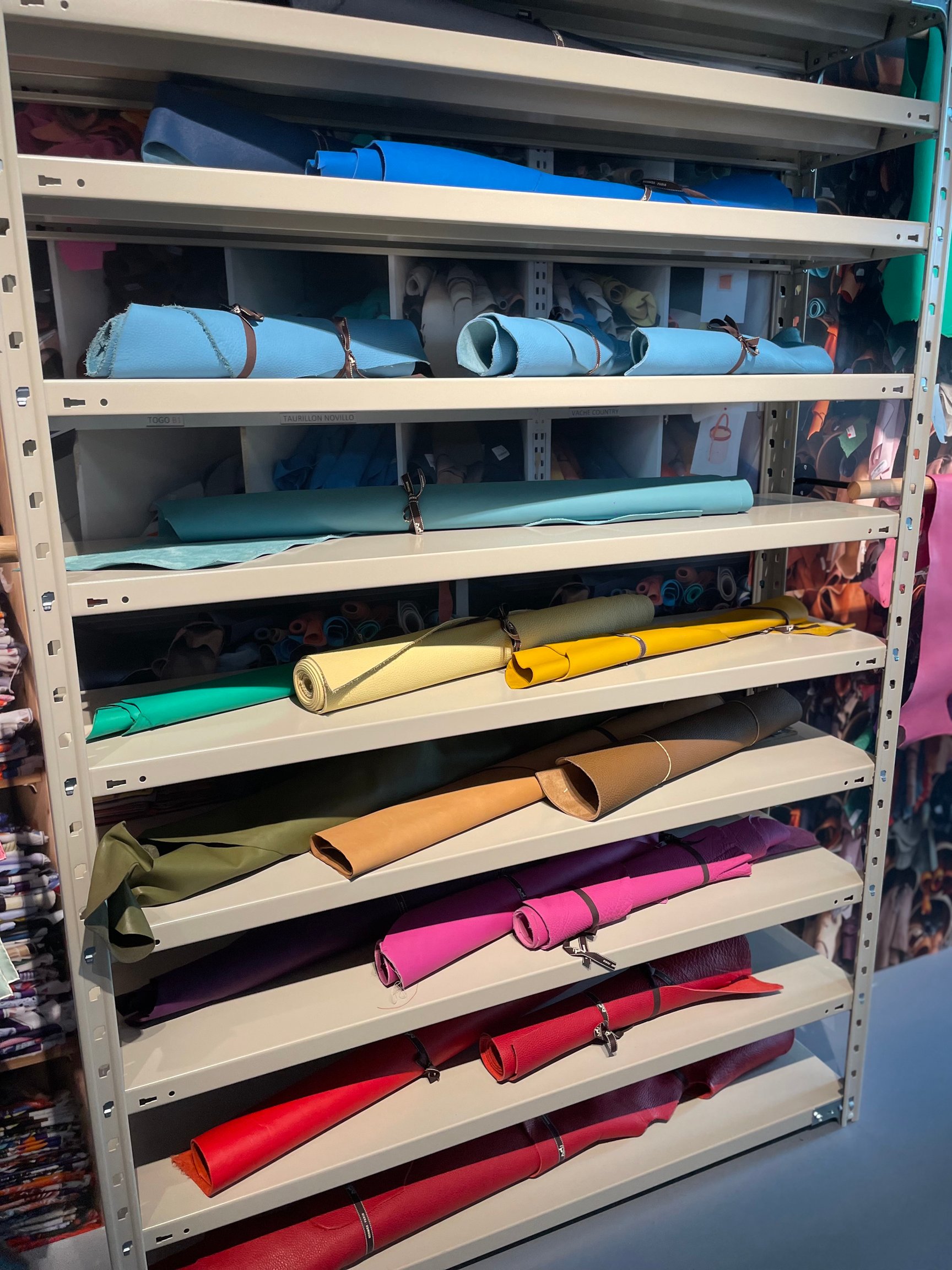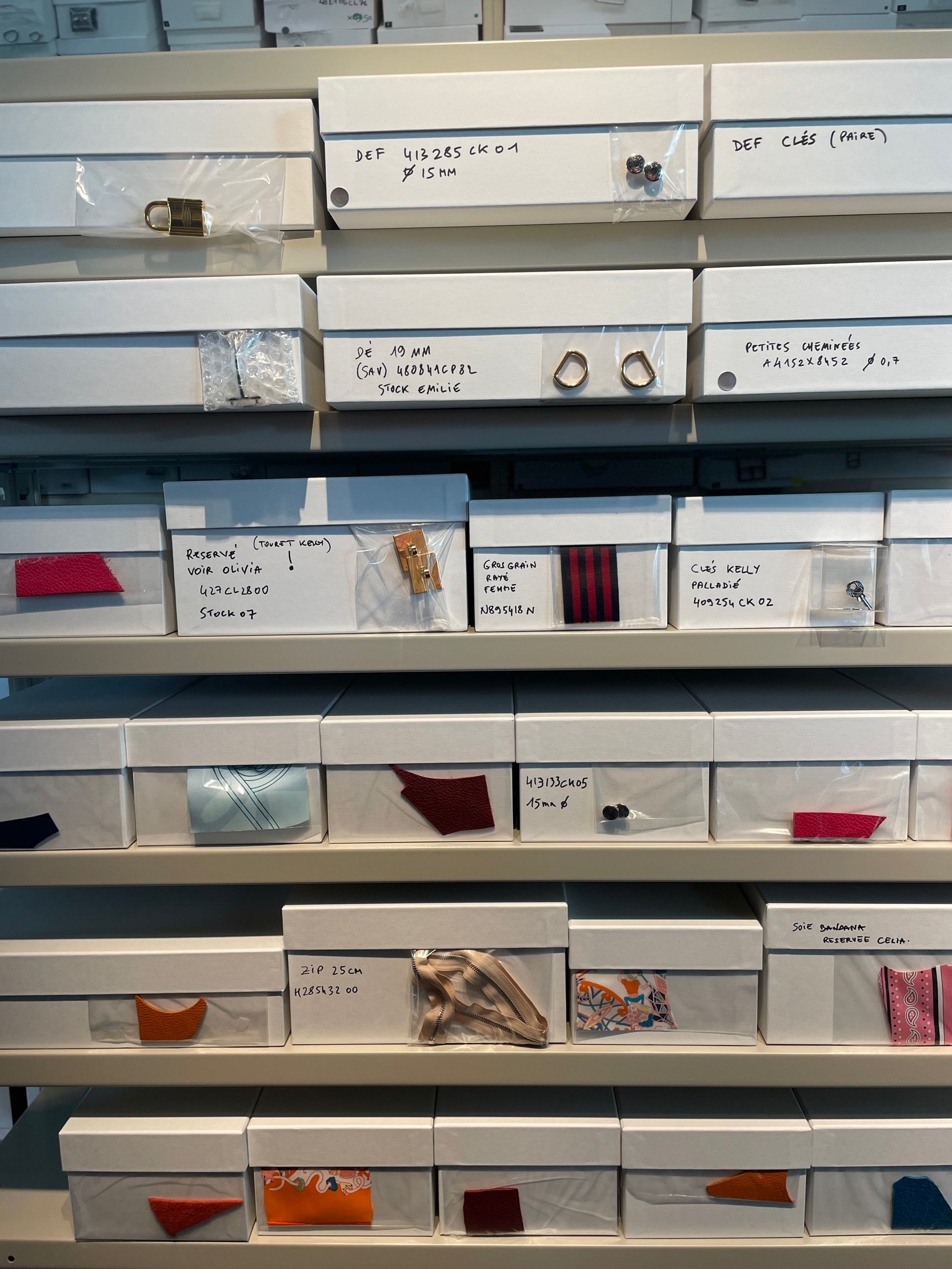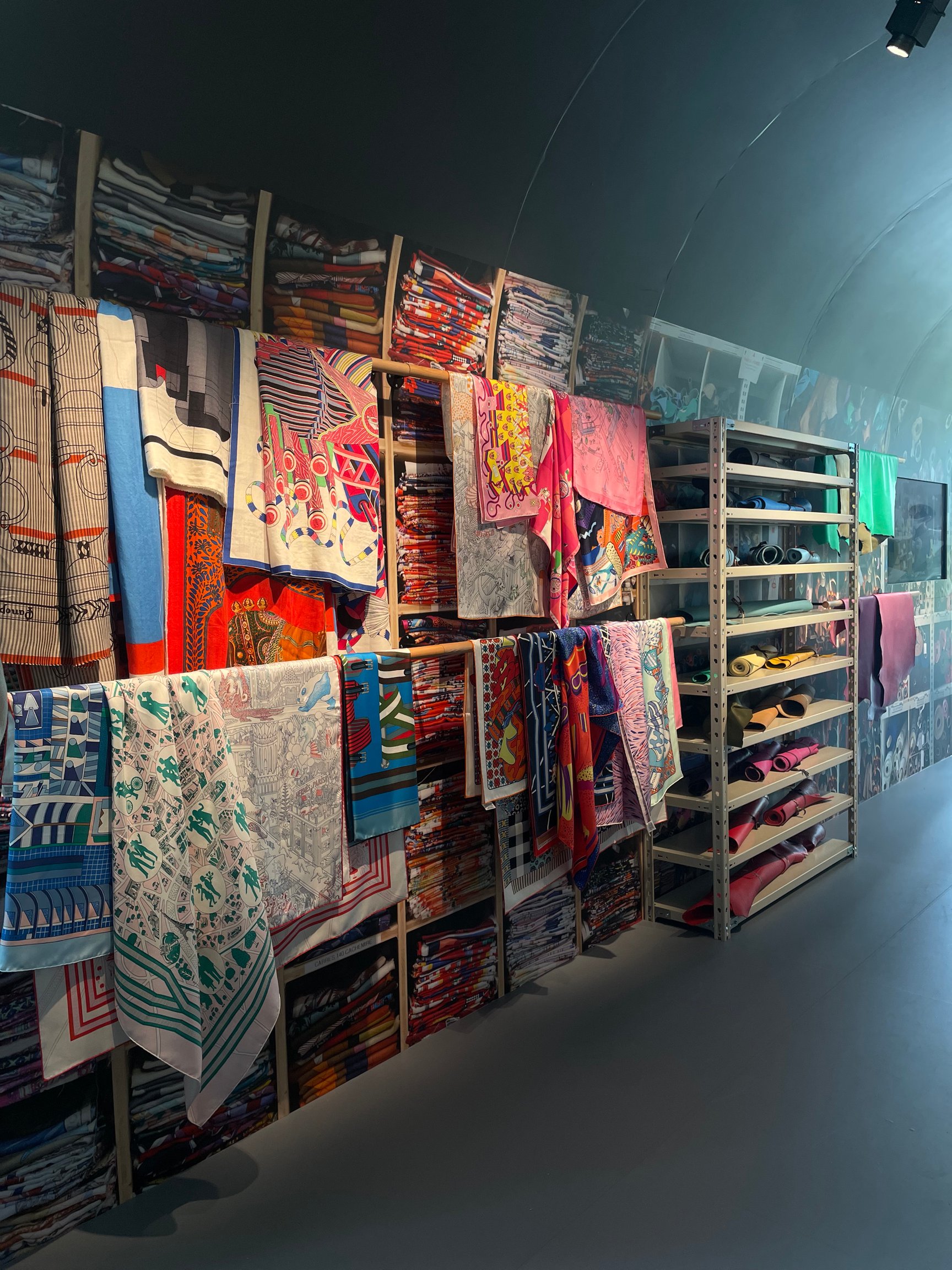 2階の多目的スペースでは、鯉のぼりを模したトンネル空間にpetit hの素材庫を再現。使われなくなったシルクスカーフや、金属パーツ、レザーなどが壁いっぱいに陳列されており、ここから職人やアーティストと対話し、クリエイションのアイデアを膨らませていくという。