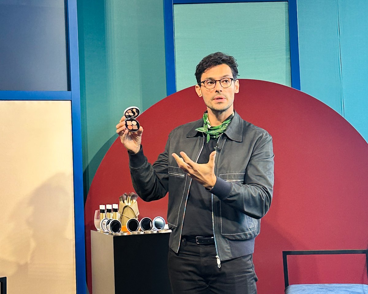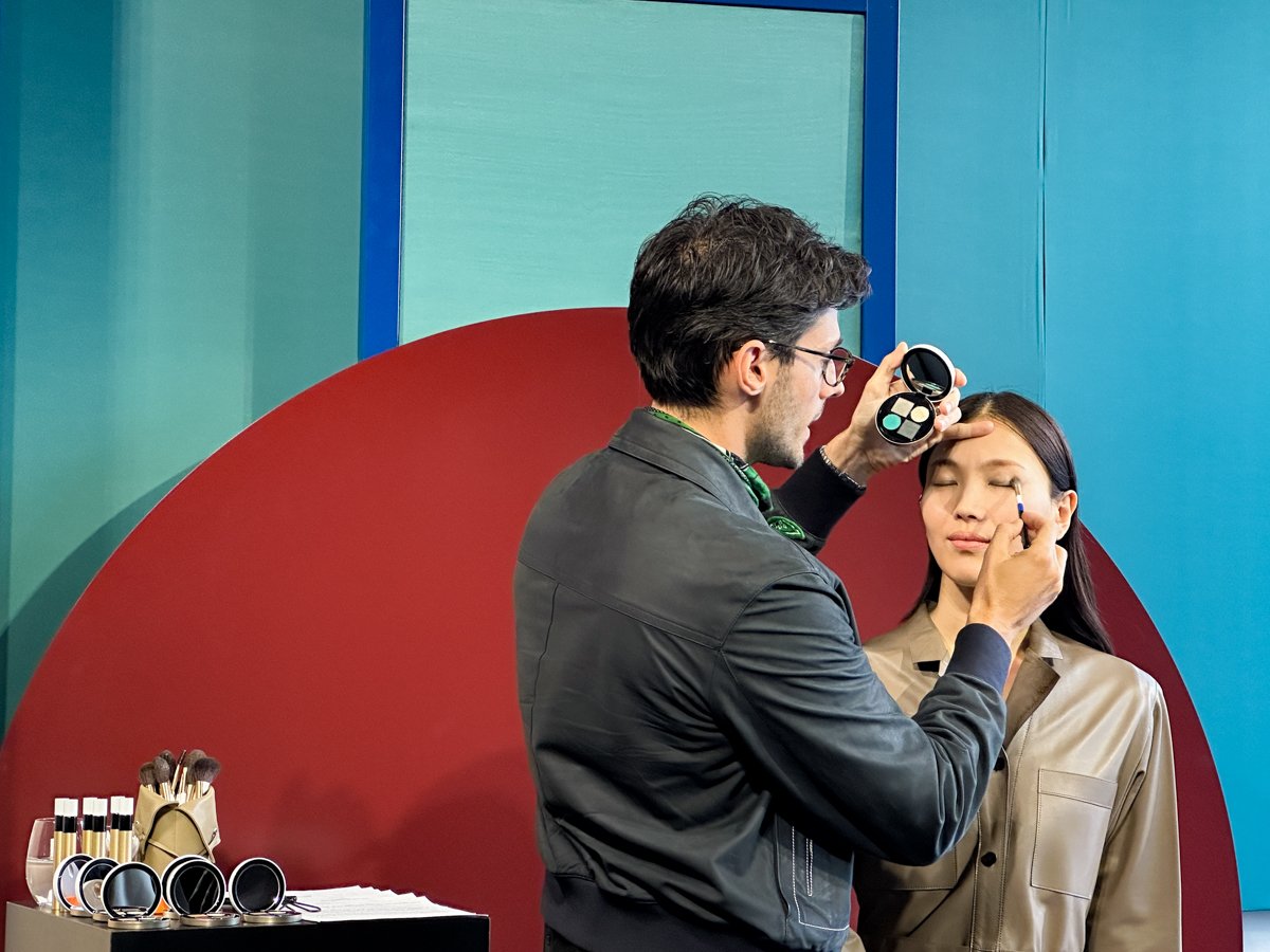 「スクエア型のナチュラルカラーをさっとまぶたに広げるのは、まるで画家がキャンバスのベースを整えるようです。そんな遊び心をくすぐるかのようにアクセントカラーをプラスすれば、サプライズを起こすように多彩なニュアンスが加わります。アクセサリーをまとうように取り入れることもできるのです」とまなざしを彩るカラーパレットのこだわりを語ったピルピリス氏。プレゼンテーションでモデルの目元に軽々と色をのせていく、彼のしなやかな手元の仕草が美しさを増す。