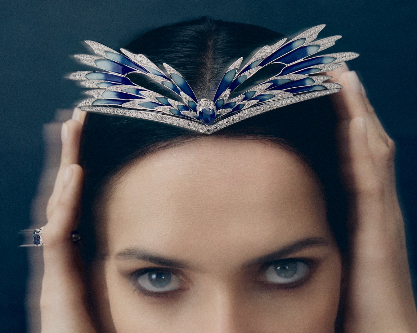 4通りの着用が可能なティアラは、12人の職人が約850時間を費やして完成。グランフーエナメルの翼とペアシェイプカットのサファイア、さらにブリリアントカットのパヴェダイヤモンドが輝くティアラとしてはもちろん、翼のパーツを外すことでミニマルなエグレットシェイプのティアラとして身につけることができる。