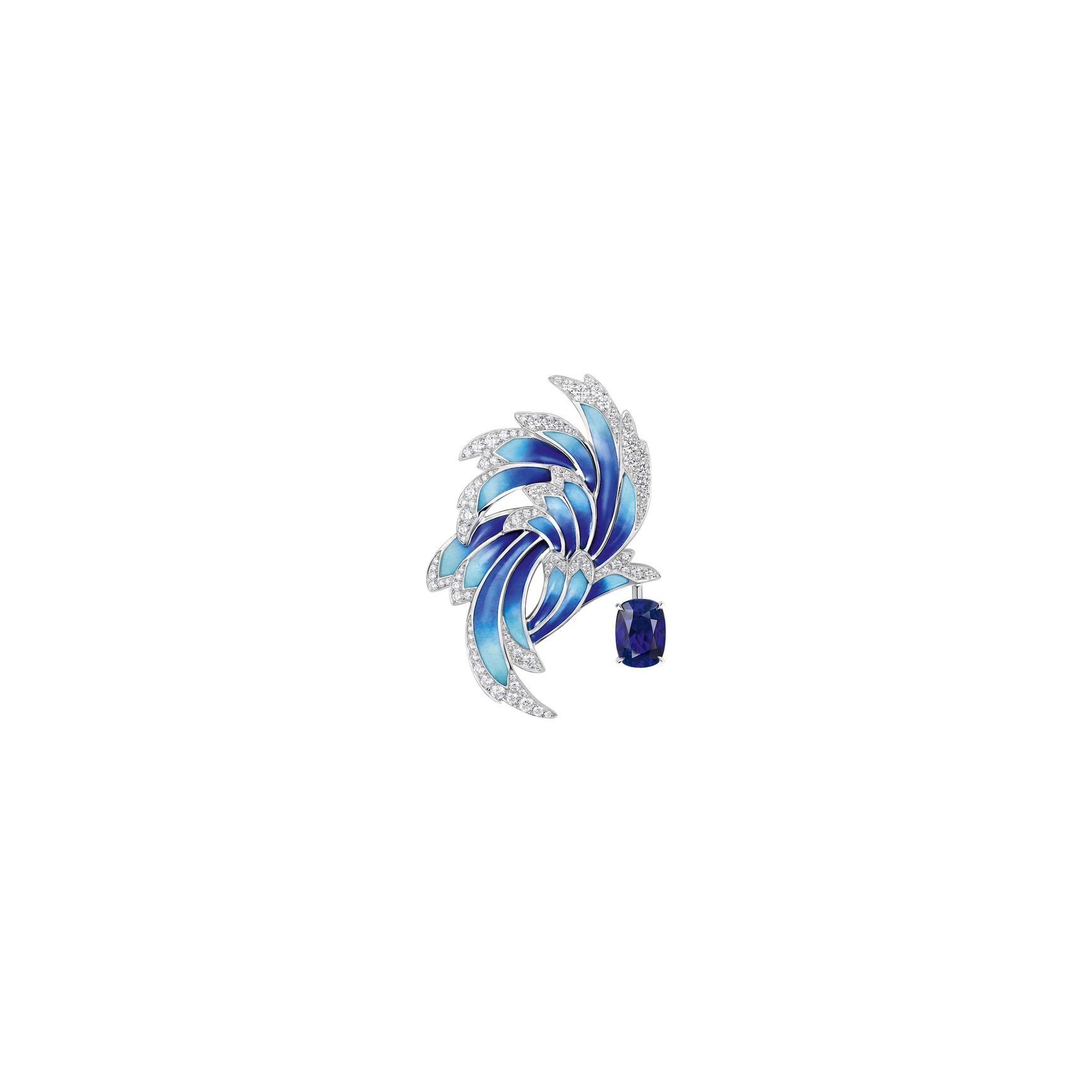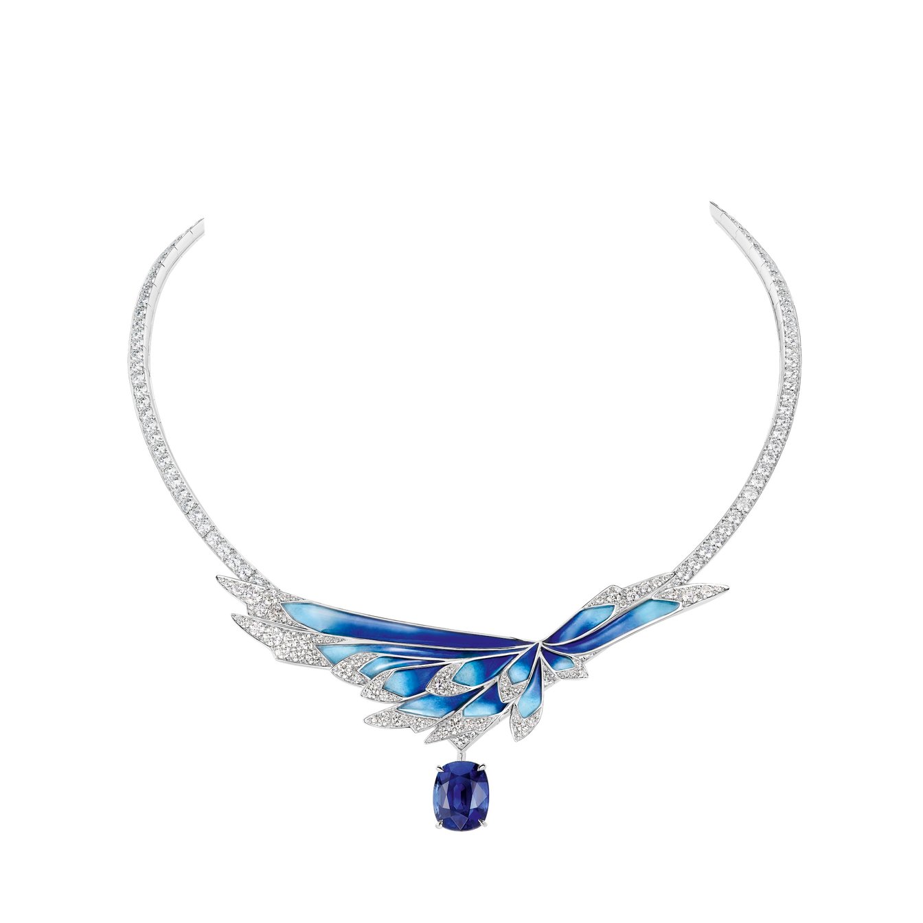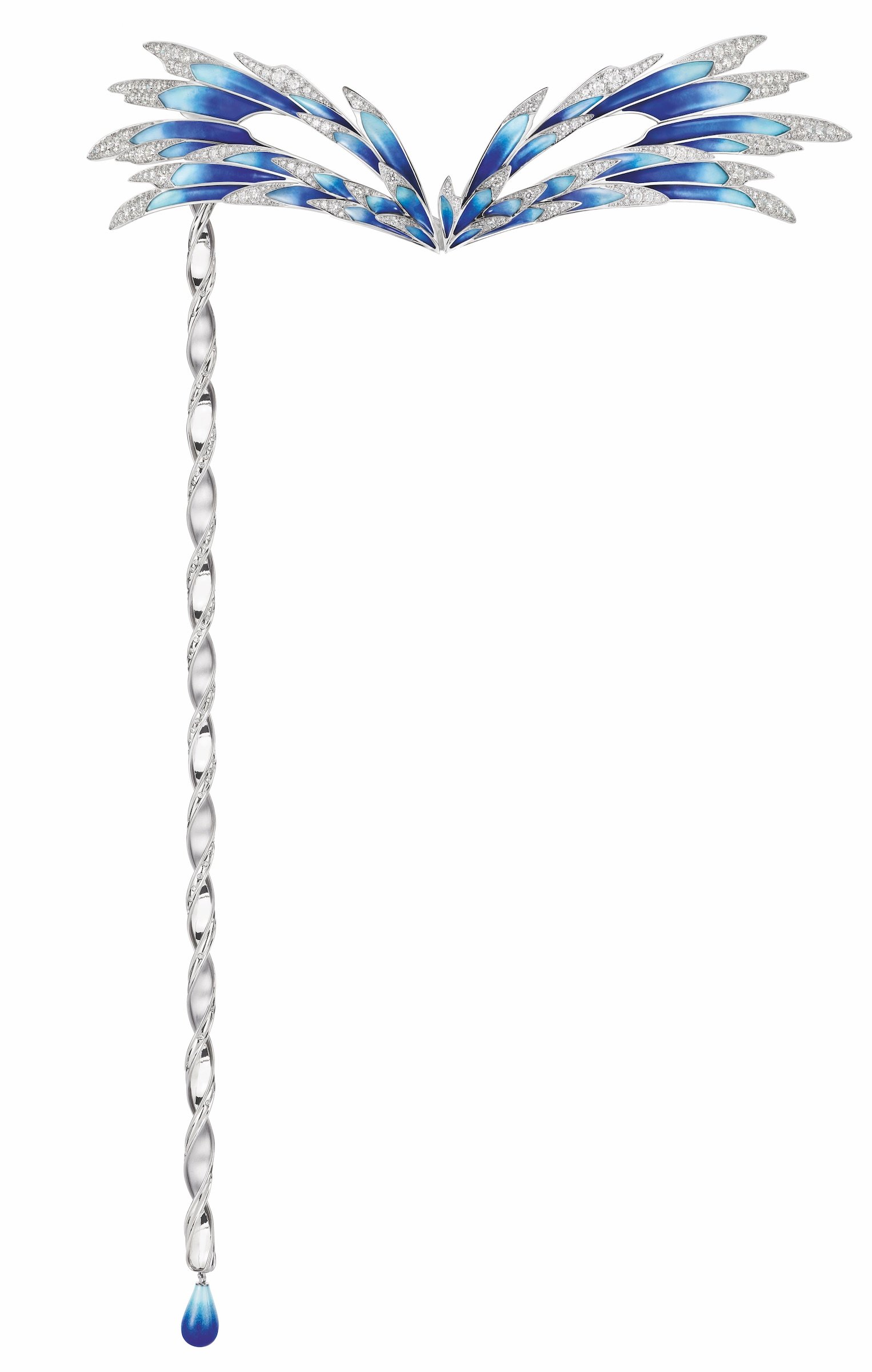 ブルーのグラデーションが美しいグランフーエナメルとダイヤモンドの煌めきが印象的なデザインは、サファイアや翼モチーフを取り外すことで表情が変わり、ブローチとしても身につけることができる。
