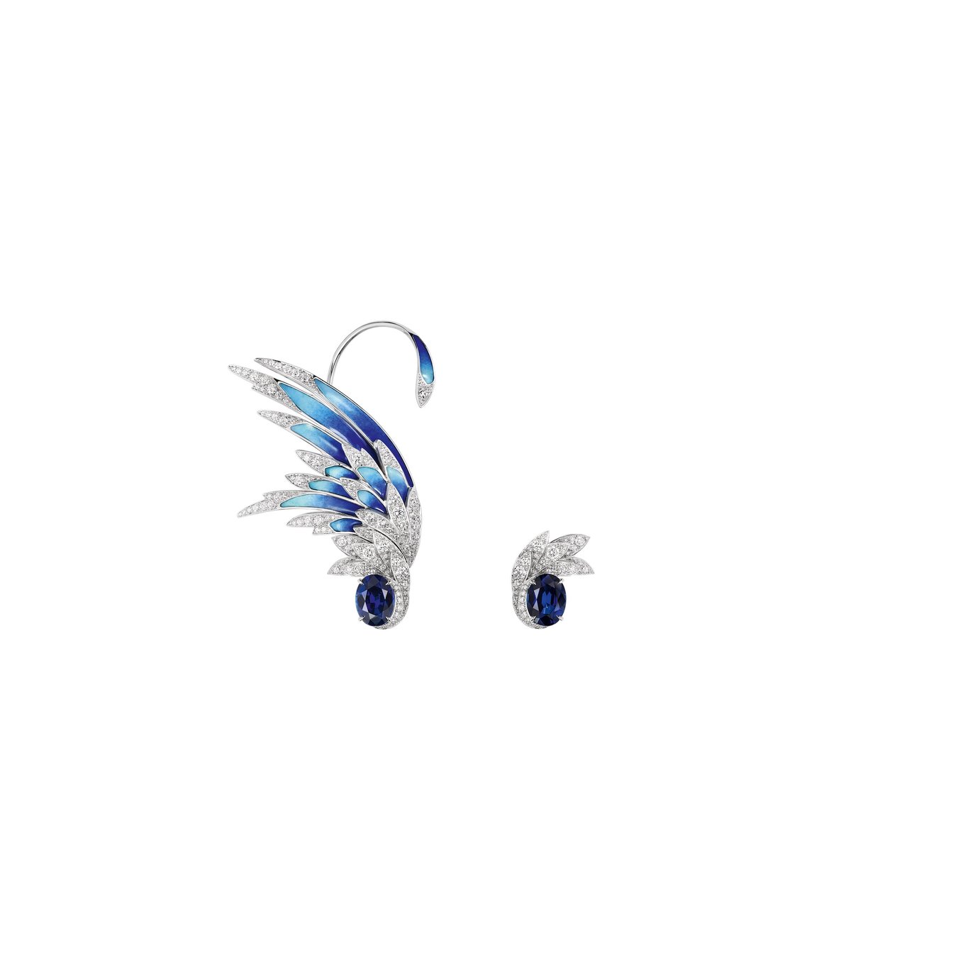 3.84カラットと3.55カラットの2つのオーバルカット マダガスカル産サファイアを中心に、ダイヤモンドと翼があしらわれたアシンメトリーのイヤリング。イヤーカフとしても着用することができる。