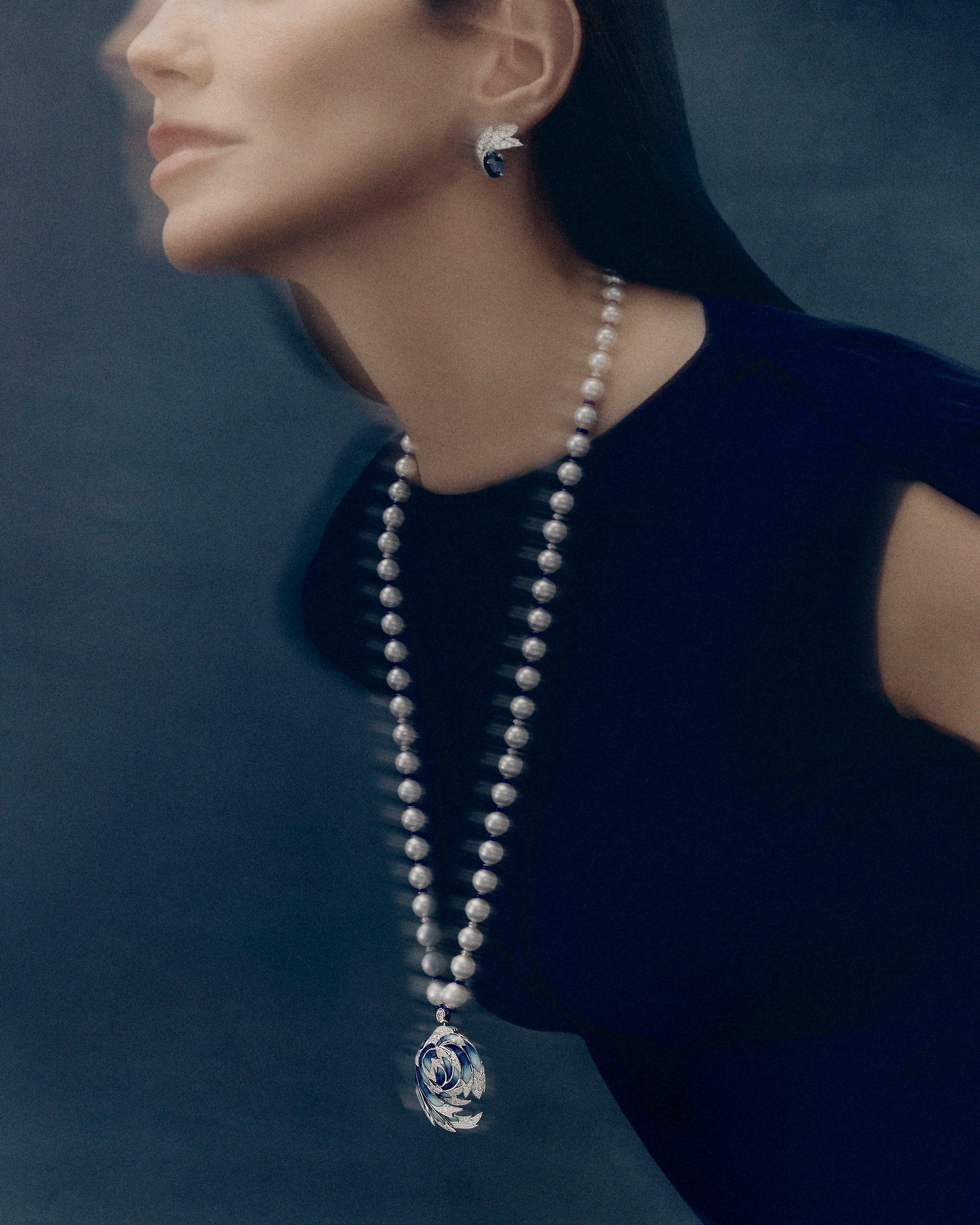 機能性と遊び心を兼ね備えたペンダントウォッチは、グランフーエナメルとダイヤモンドで形作られた翼が、ソダライト(深い青色の天然石)の文字盤を優雅に覆うデザインが特徴。サウスシーパール、ブルーエナメル、ダイヤモンドを組み合わせたロングネックレスにつけられ、胸元で繊細に揺れながら輝く。