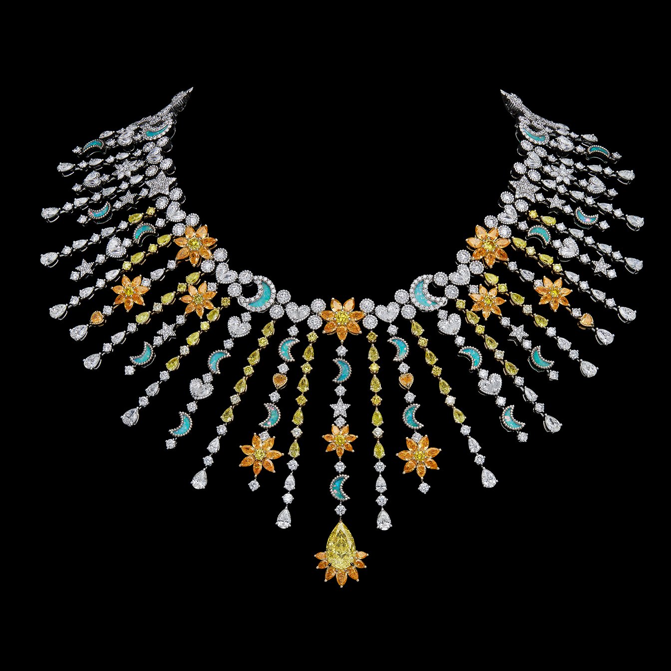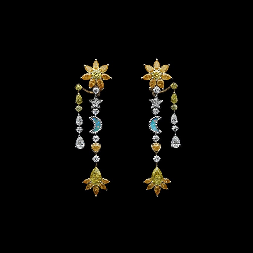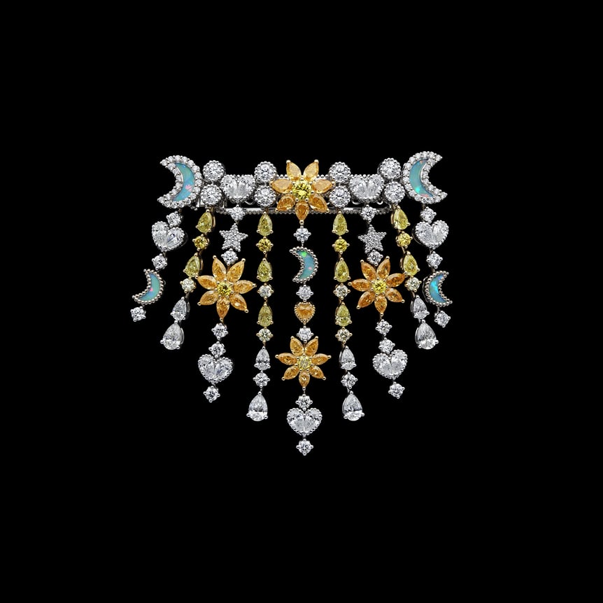 ヴィクトワールがこれまで手掛けてきたアイコニックなブレイド(編み込み)を大胆に再解釈。フリンジがエレガントに揺れ動く57点のピースで構成した。注目は、ムッシュ・ディオールが注いだ占星術への情熱にオマージュを捧げた「Soleil Céleste(天空の太陽)」パリュールだ。ビブネックレスやリング、イヤリング、そしてチョーカーとしても楽しめるブレスレットは、イエローダイヤモンドの星や、ターコイズを重ねたブラックオパールの月をあしらい、フリンジ状に連ねたデザイン。ブローチは、ヘアアクセサリーとしてもまとうことができる。