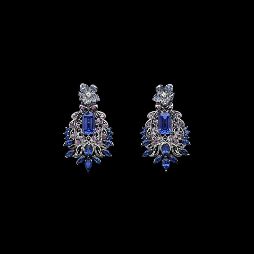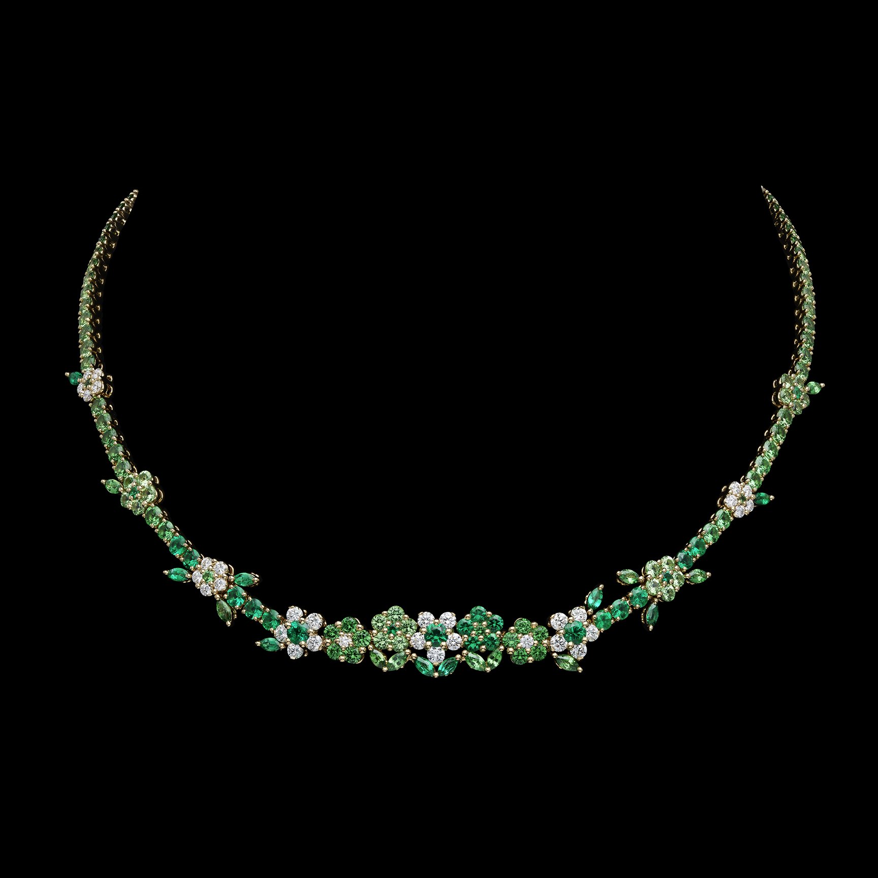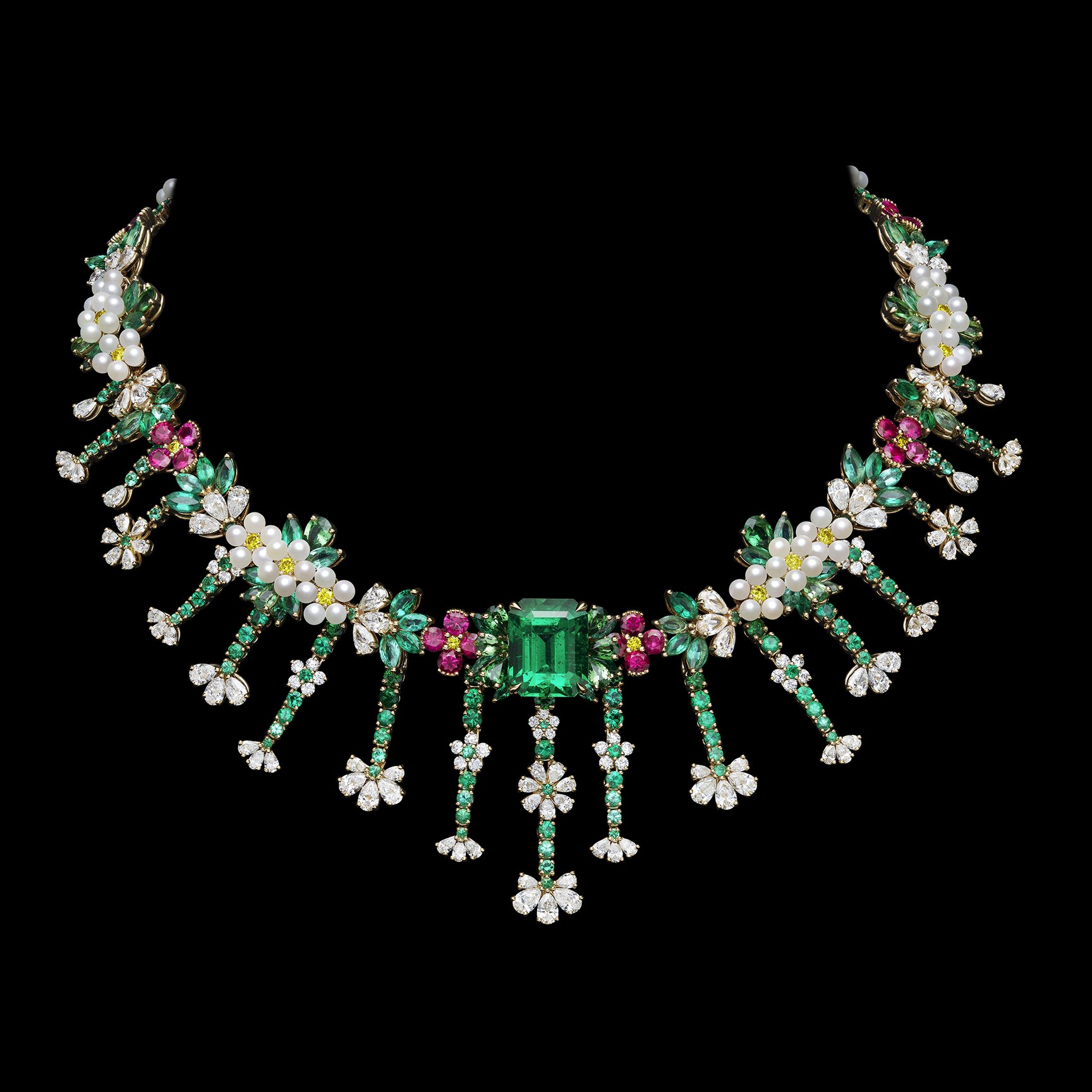フランス語で「色とりどりの庭園」を意味する「Jardins Multicolores」は、さまざまな花々が可憐に咲き誇るネックレスやイヤリングを、ブライトグリーンとパウダーピンクという2つのカラーシェードで表現。高い基準で選び抜かれた最上級の宝石と、アトリエのサヴォワールフェール、卓越した職人技によって詩情的に描かれている。