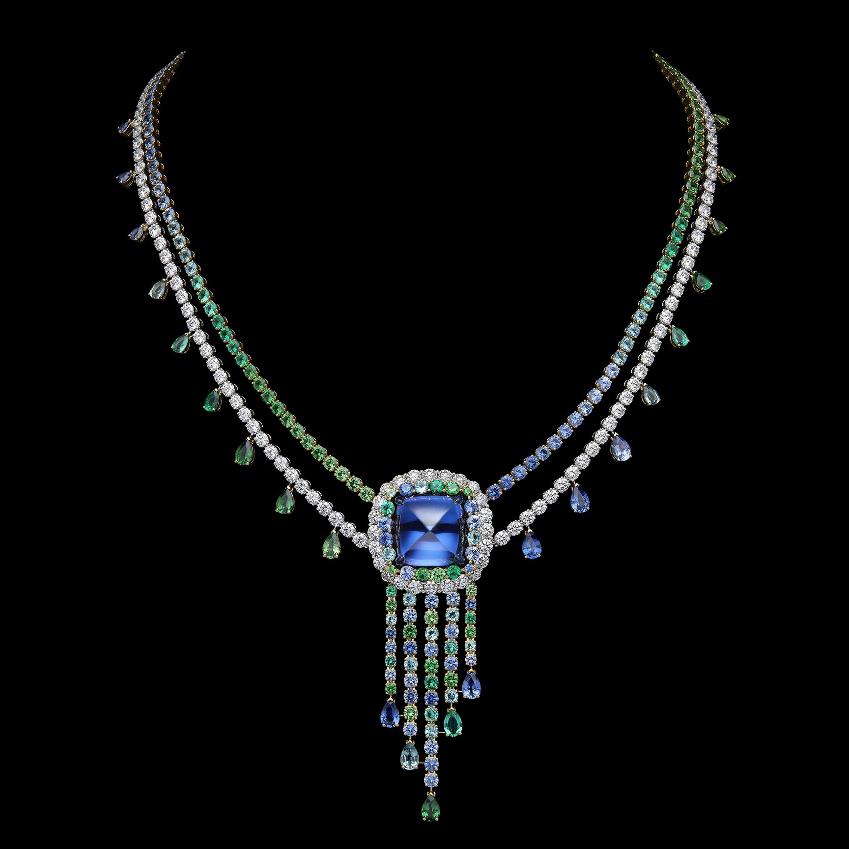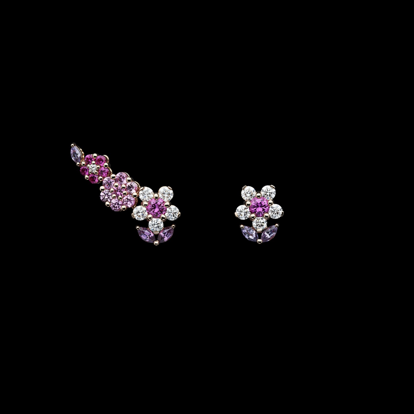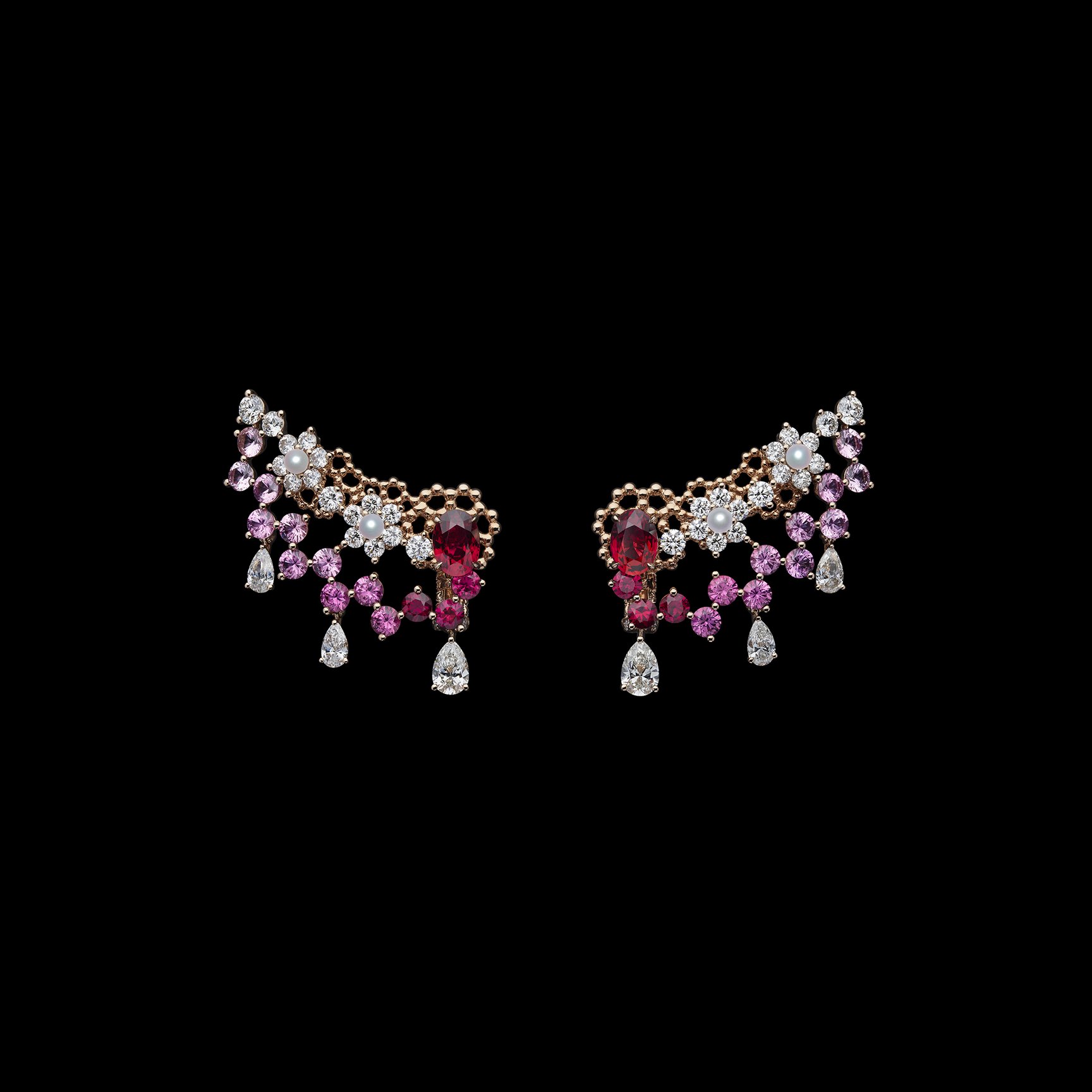 フランス語で「色とりどりの庭園」を意味する「Jardins Multicolores」は、さまざまな花々が可憐に咲き誇るネックレスやイヤリングを、ブライトグリーンとパウダーピンクという2つのカラーシェードで表現。高い基準で選び抜かれた最上級の宝石と、アトリエのサヴォワールフェール、卓越した職人技によって詩情的に描かれている。