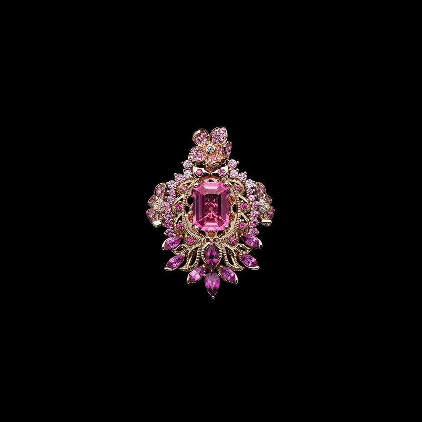 この二つのカラーシェードは「Dearest Dior」へ継続。タンザナイトを組み合わせることで深みを増し、ミステリアスに輝く。そしてコレクションの最後を飾るのは、6.50カラットのピンク スピネルがあしらわれたリング。センターストーンを囲むように花々をあしらったデザインは、まるで一輪の花のよう。メゾンのエスプリを体現するマスターピースに、ヴィクトワールの色彩感覚が詰まっている。