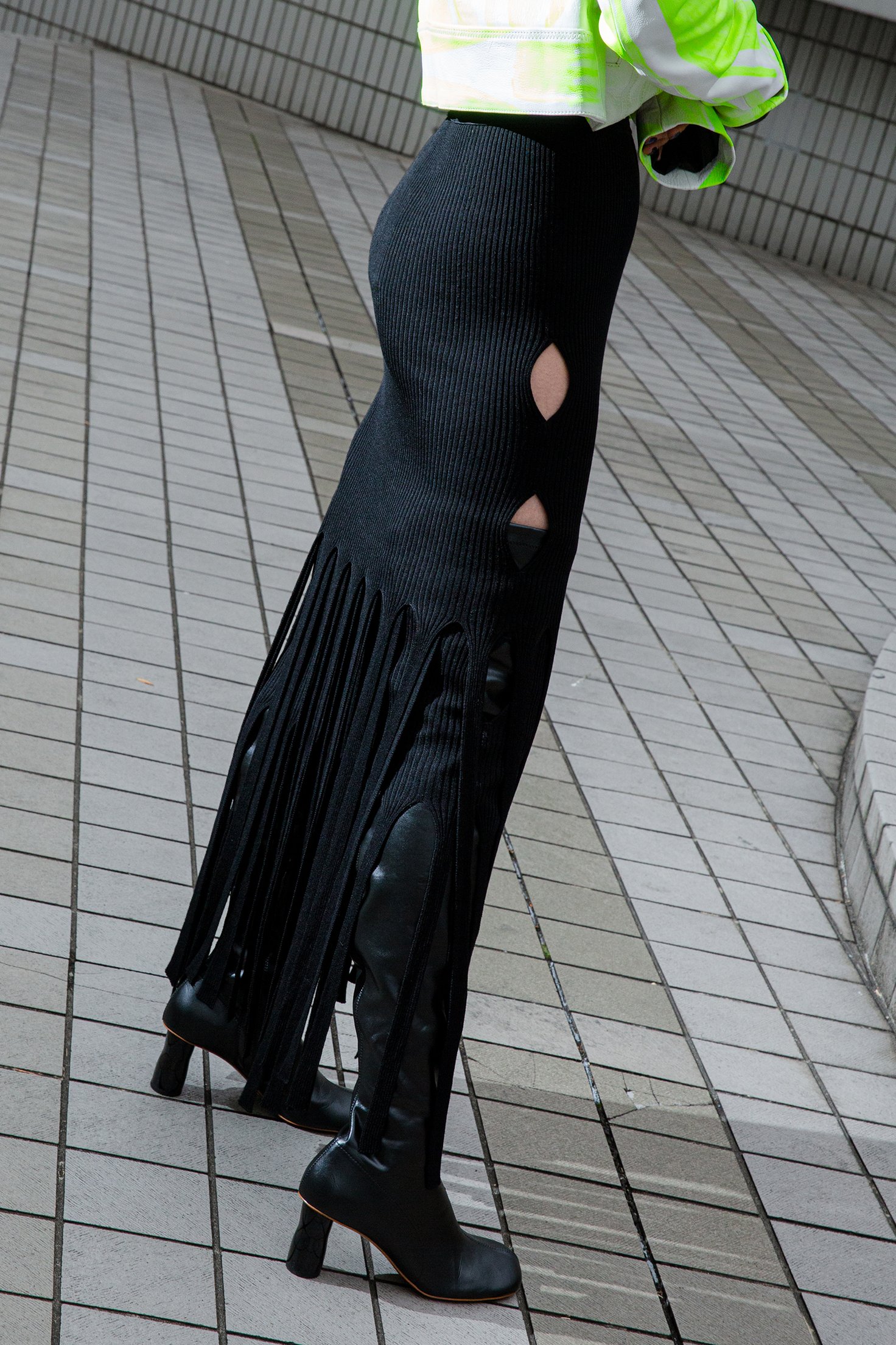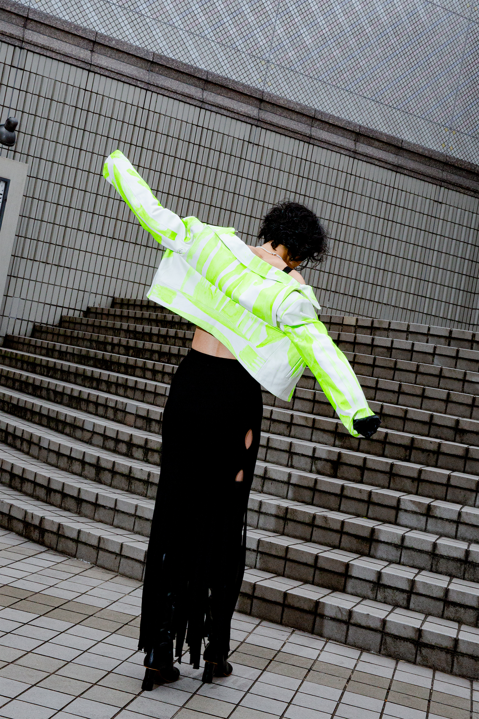 ボディコンシャスなリブニットのトップスの対になるのは大胆なサイドのデザインでサイハイブーツが映える同素材のスカート。目が覚めるようなネオンカラーでペイントされたレザージャケットはボトムスのボディラインを引き立ててくれるクロップド丈。私という人間を賛美するアティチュードをまとって。