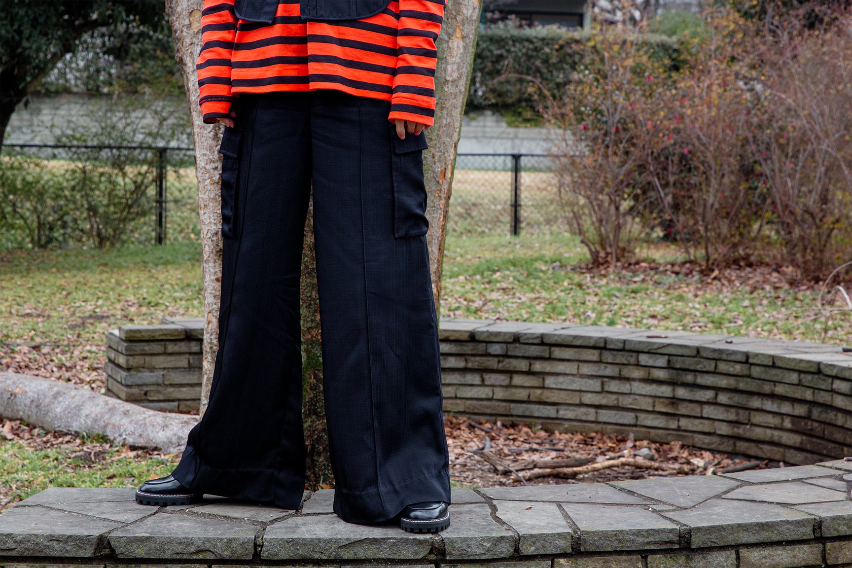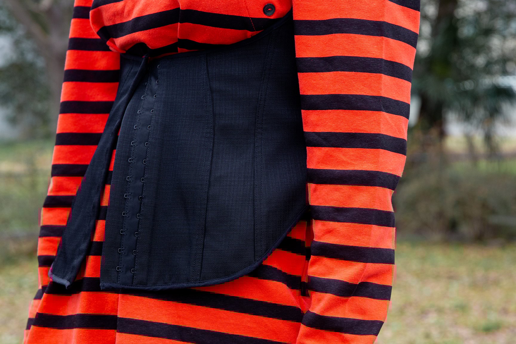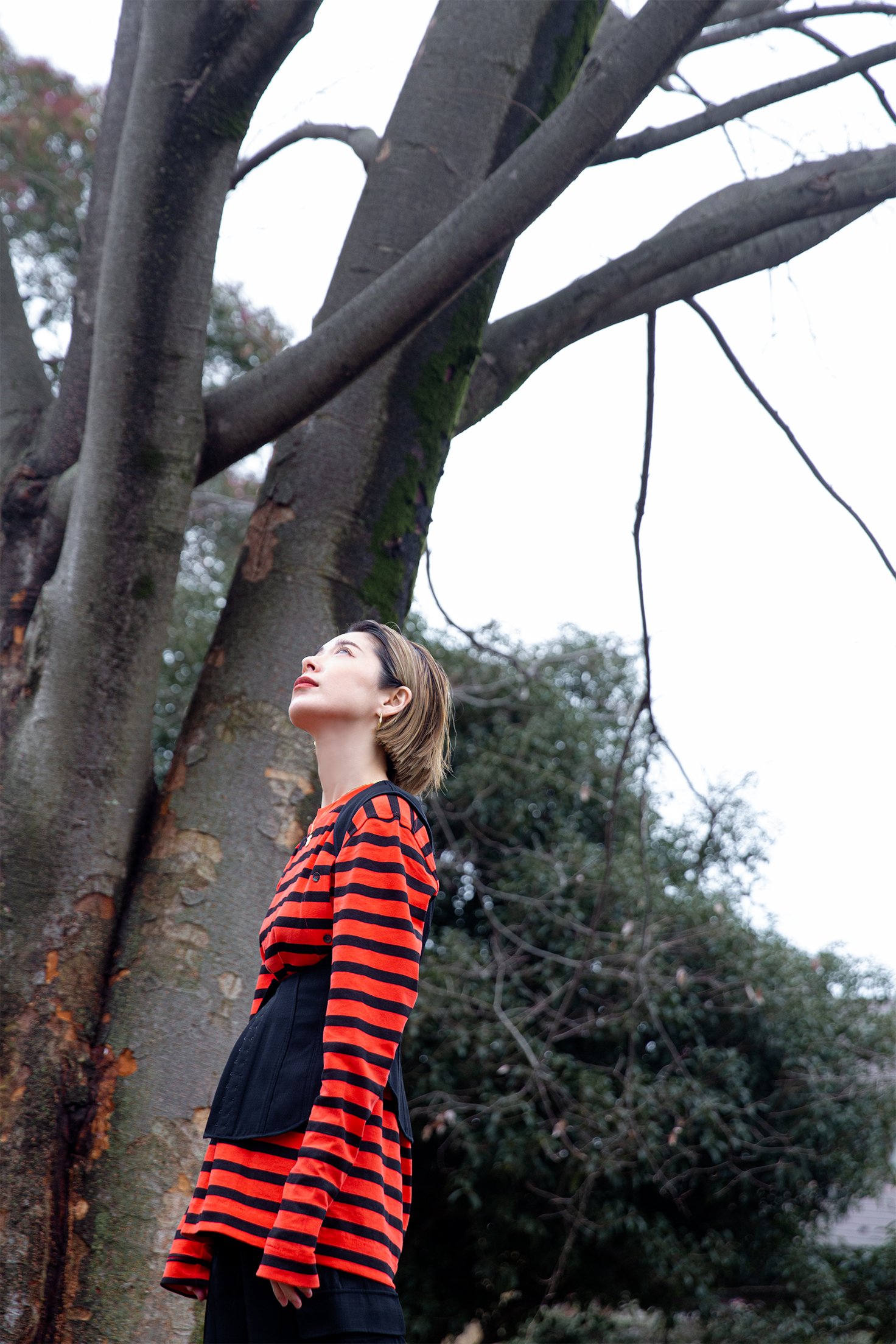 アームホールのボタンの取り外しでスリーブの取り外しが可能なジャージー素材のオーバーサイズボーダーシャツは、上品な光沢をまとうワイドパンツと合わせて。ルーズなスタイリングにアクセントを添えるのはフェミニンだけど力強さを与えてくれるパンツと同素材のコルセットベスト。丸くなりがちな背筋を少し伸ばせば、いつもの風景も違って見える。