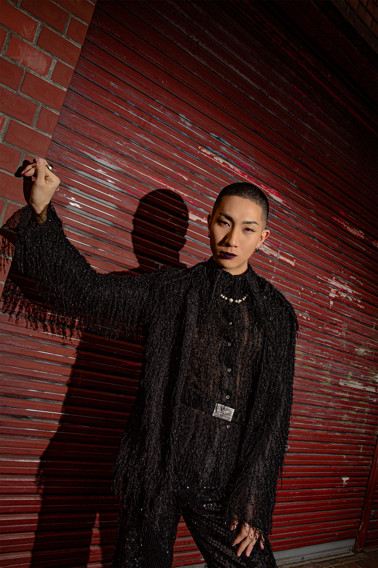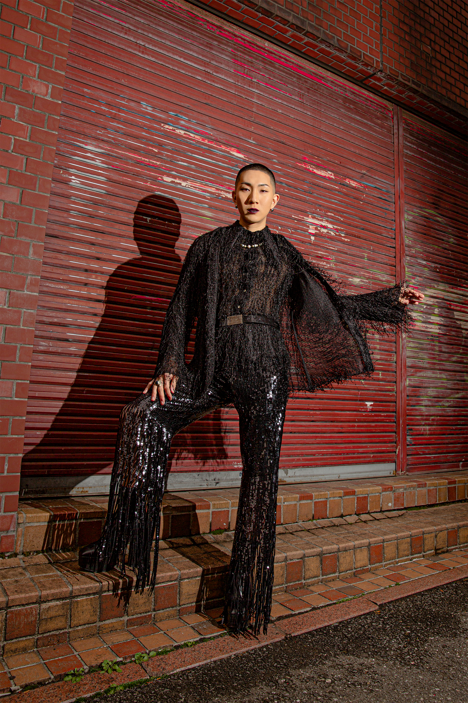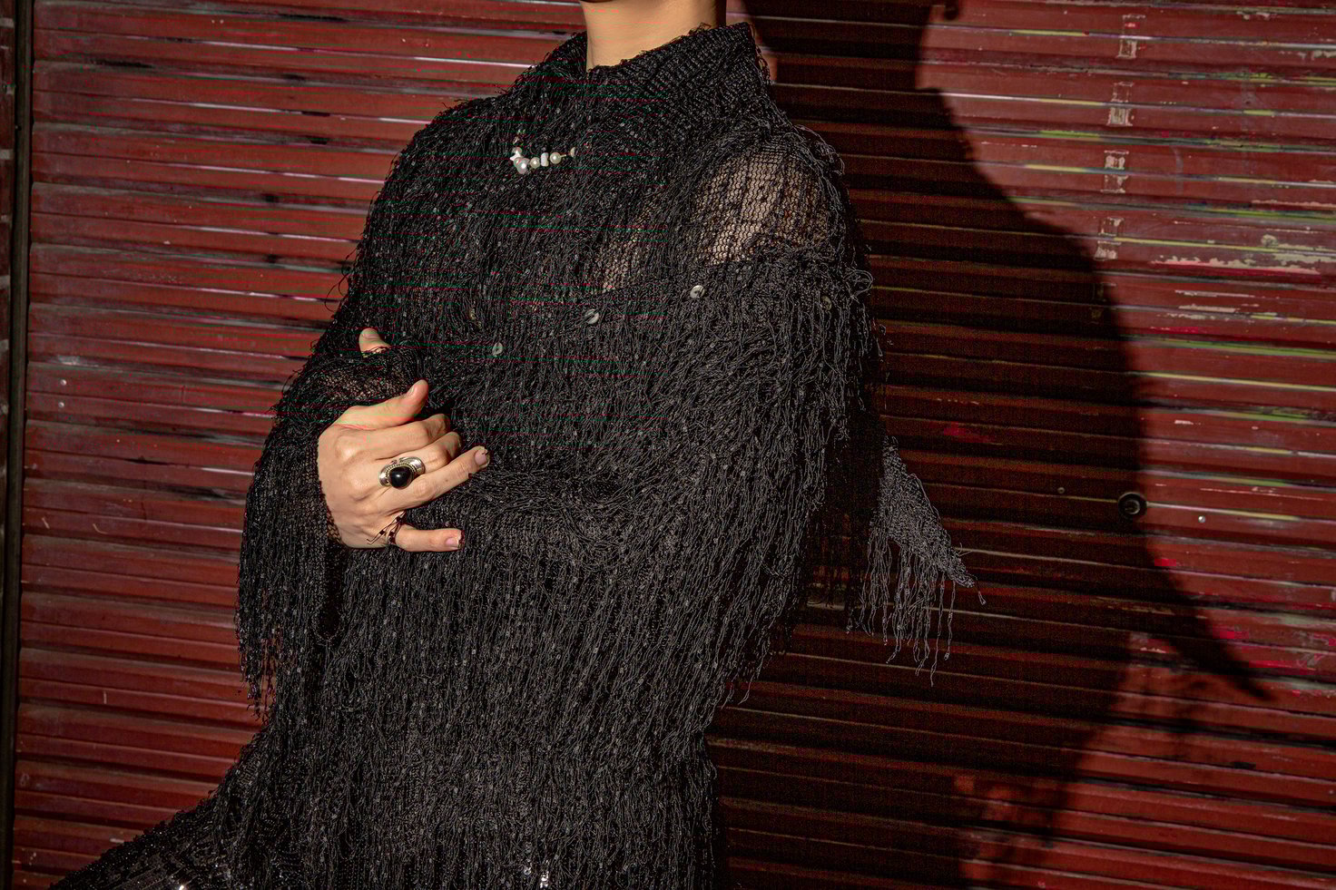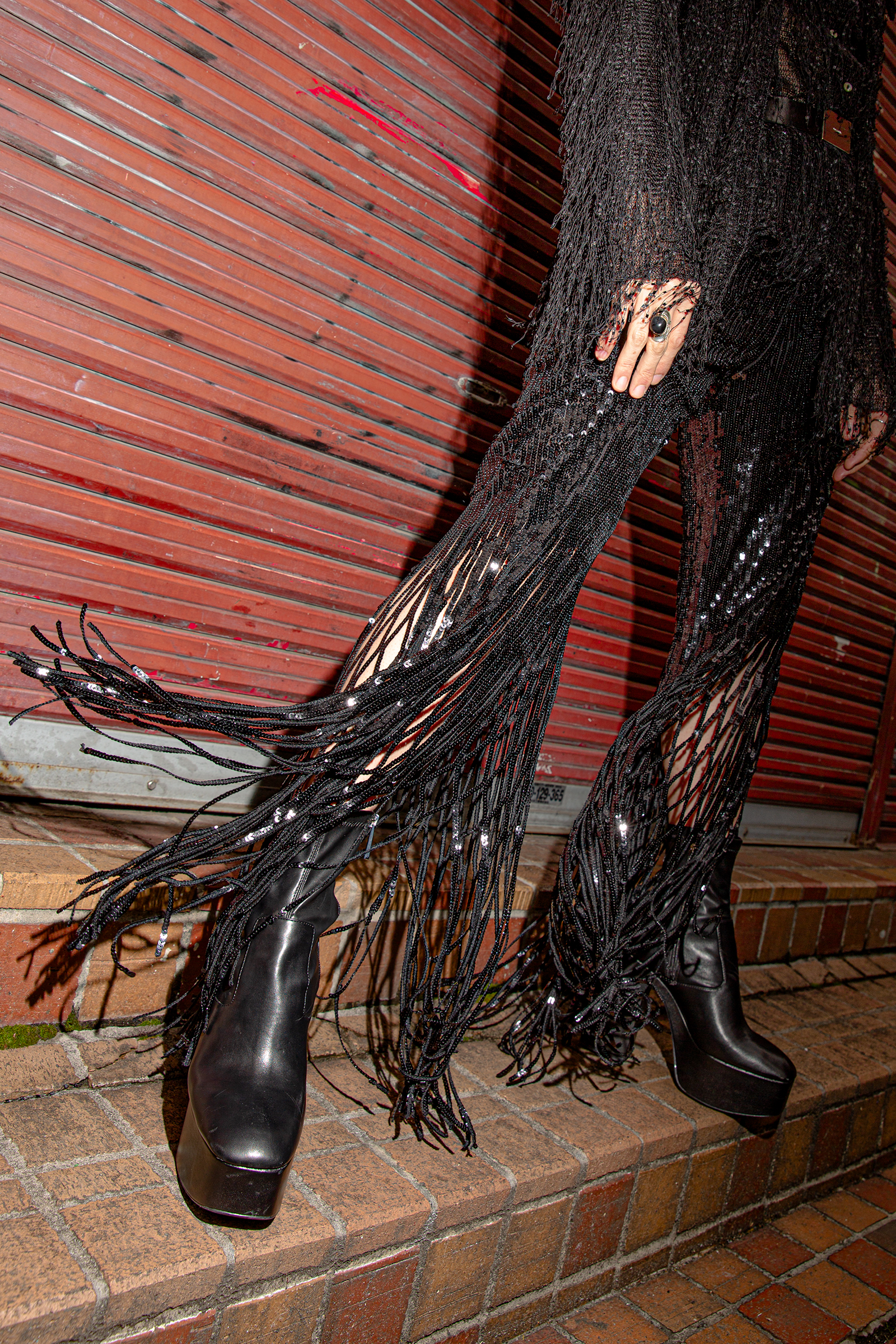 繊細な網目で透け感のあるシャツは大胆にインナーと羽織りという2枚使いで。フリンジディテールやポインテッドカラーから覗くパール、ボトムスのスパングルがソリッドなブラックコーデに質感をプラス。他人の色に染まらない無限に広がる自分だけのスタイルを探して。