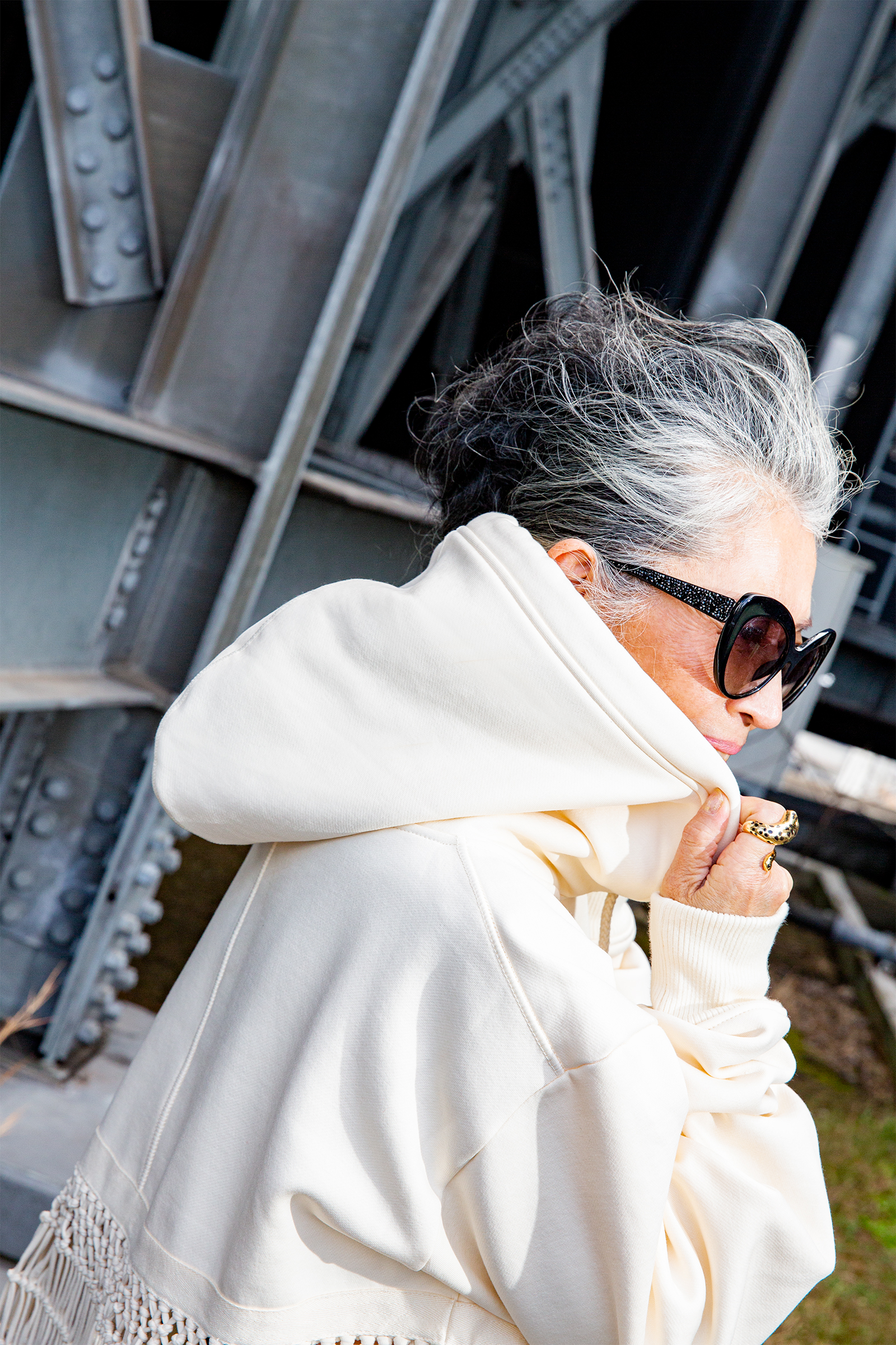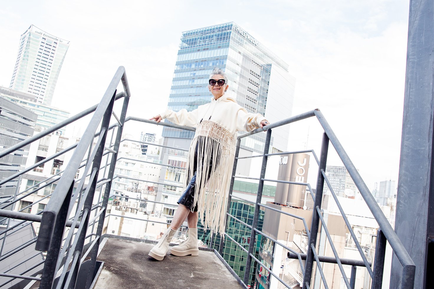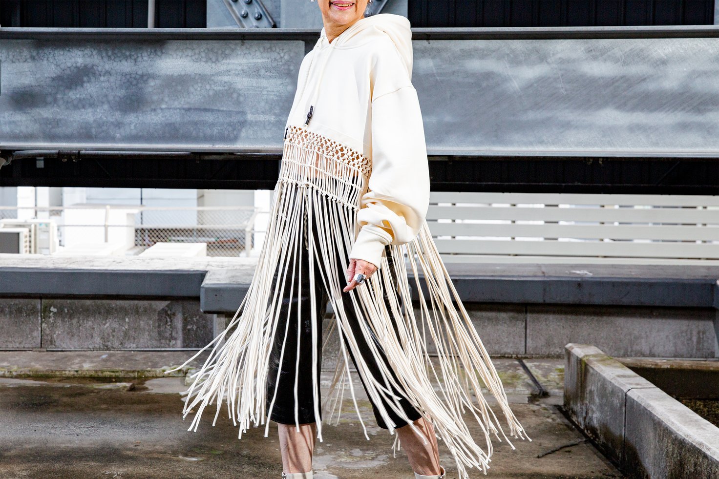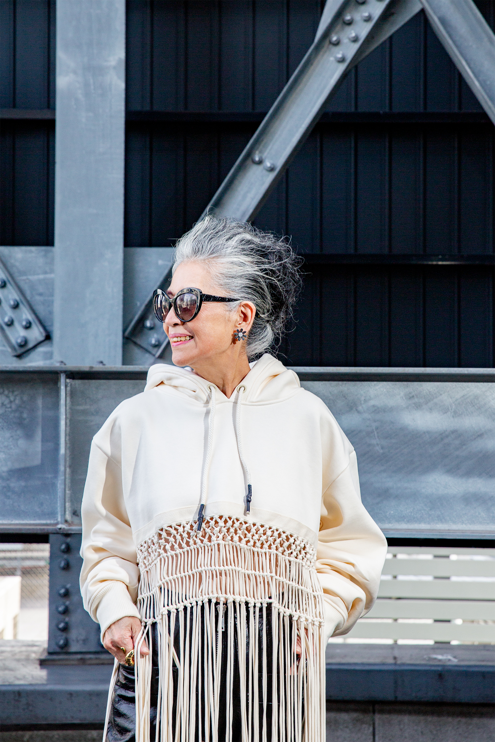 白と黒のツートンコーディネートはマクラメのフリンジディテールが揺れるクロップド丈のフードとレザーのカプリパンツを合わせた上下のバランスが肝。いくつになっても持ち続けていたいのは挑戦を恐れないロックな精神とファッションへの好奇心。