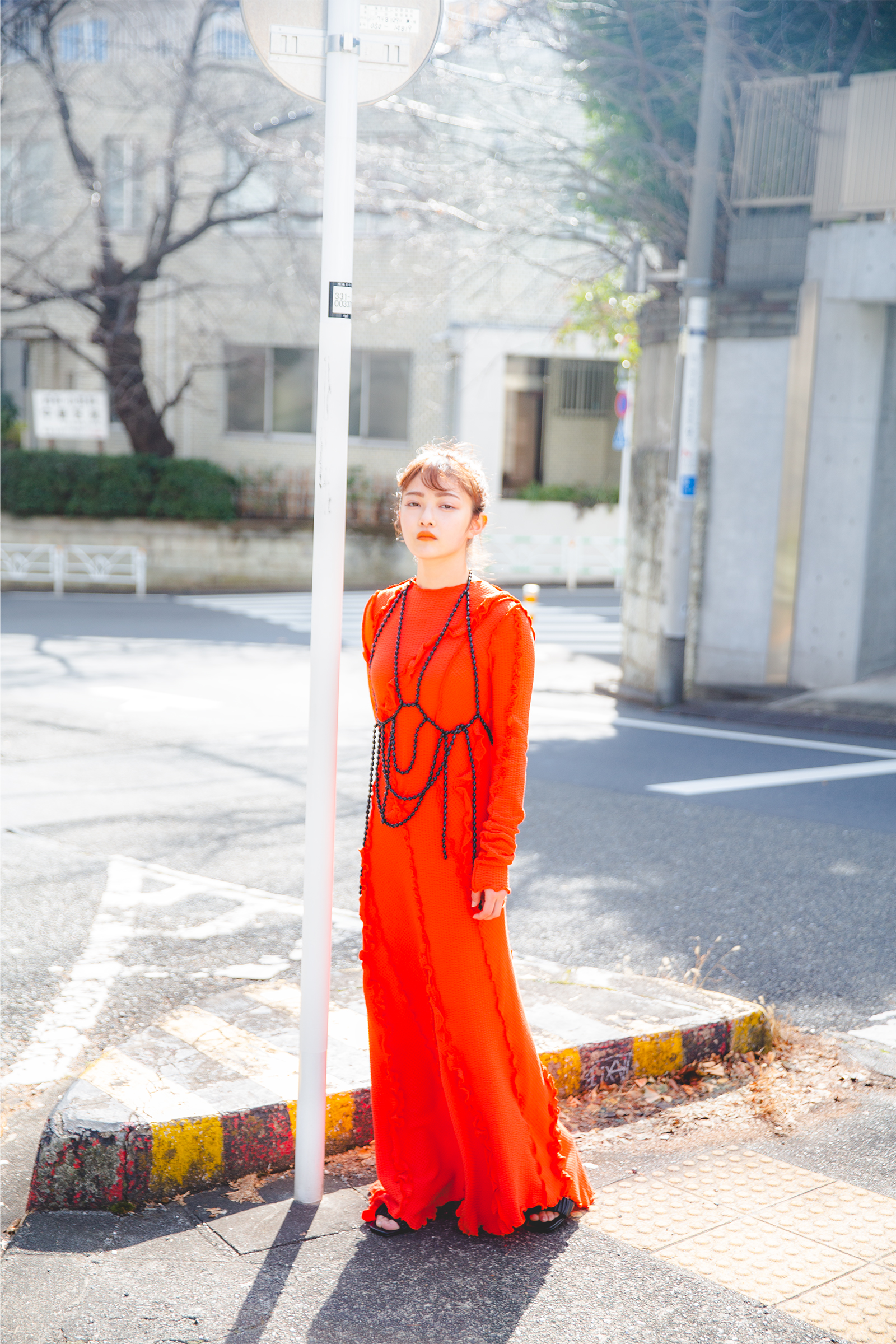 鮮やかなオレンジカラーのロングワンピースはギャザーが寄ったソフトなフリルが心躍るデザイン。絵画の描線のように体をなぞるボディチェーンは中に着たいつものシャツやトップスにスパイスを与えてくれるドレスアップツール。新しい自分に出会う度、胸が高鳴る。