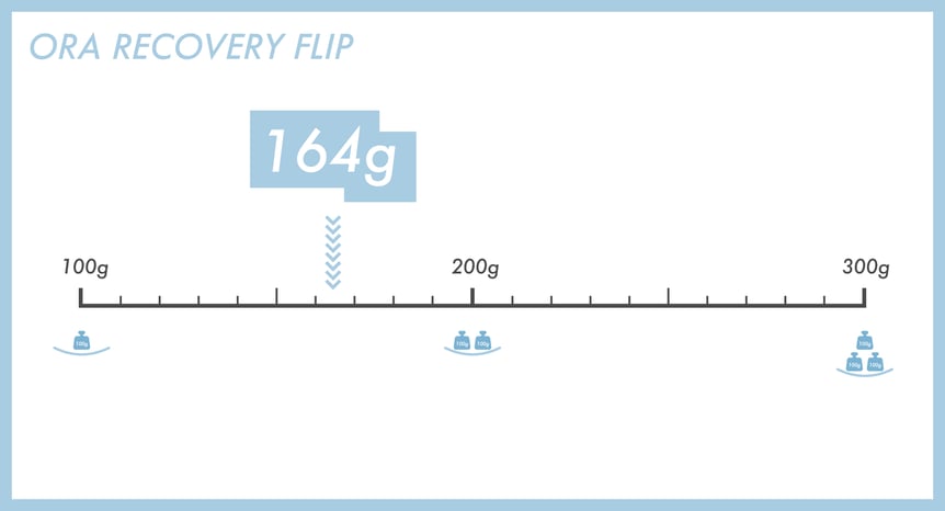 重さは、オラ ラックスが208gで、オラ リカバリーフリップが164g(27cm/片足あたり)。オラ ラックスはアッパーの面積が多いことから、リカバリーフリップよりも約40g重いという結果になりましたが、実際の着用感には大きな違いはありませんでした。