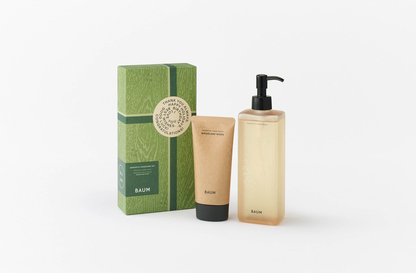 「バウム」初のギフトセットは、ハンドクリームとハンドウォッシュ。「樹木の恵みを召し上がれ」をテーマに、緑の木目をイメージしたパッケージで登場します。