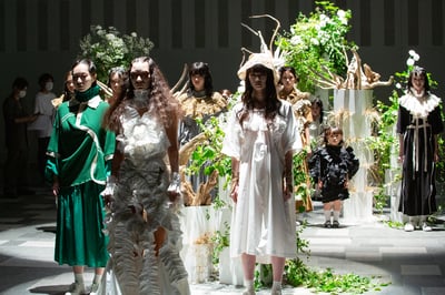 石田萌が手掛けるドレスブランド「ホウガ(HOUGA)」が、2022年春夏コレクションを初のランウェイショー形式で発表した。会場となった表参道ヒルズのホールには、積み重ねた白い箱に、バラやカスミソウなどの草花をダイナミックに活けたオブジェを設置。BGMとして、虫の音が微かに聞こえるなど、優雅さと開放感を併せ持つ避暑地のような情景を演出した。