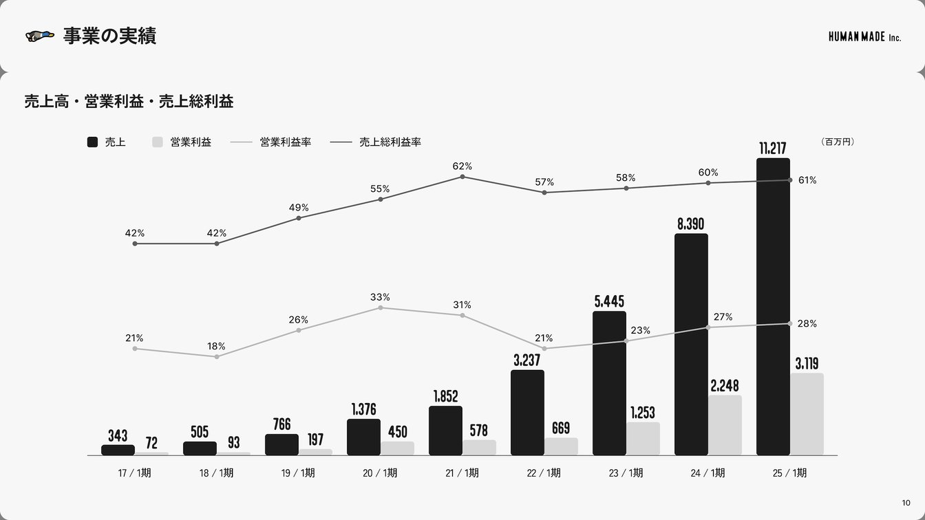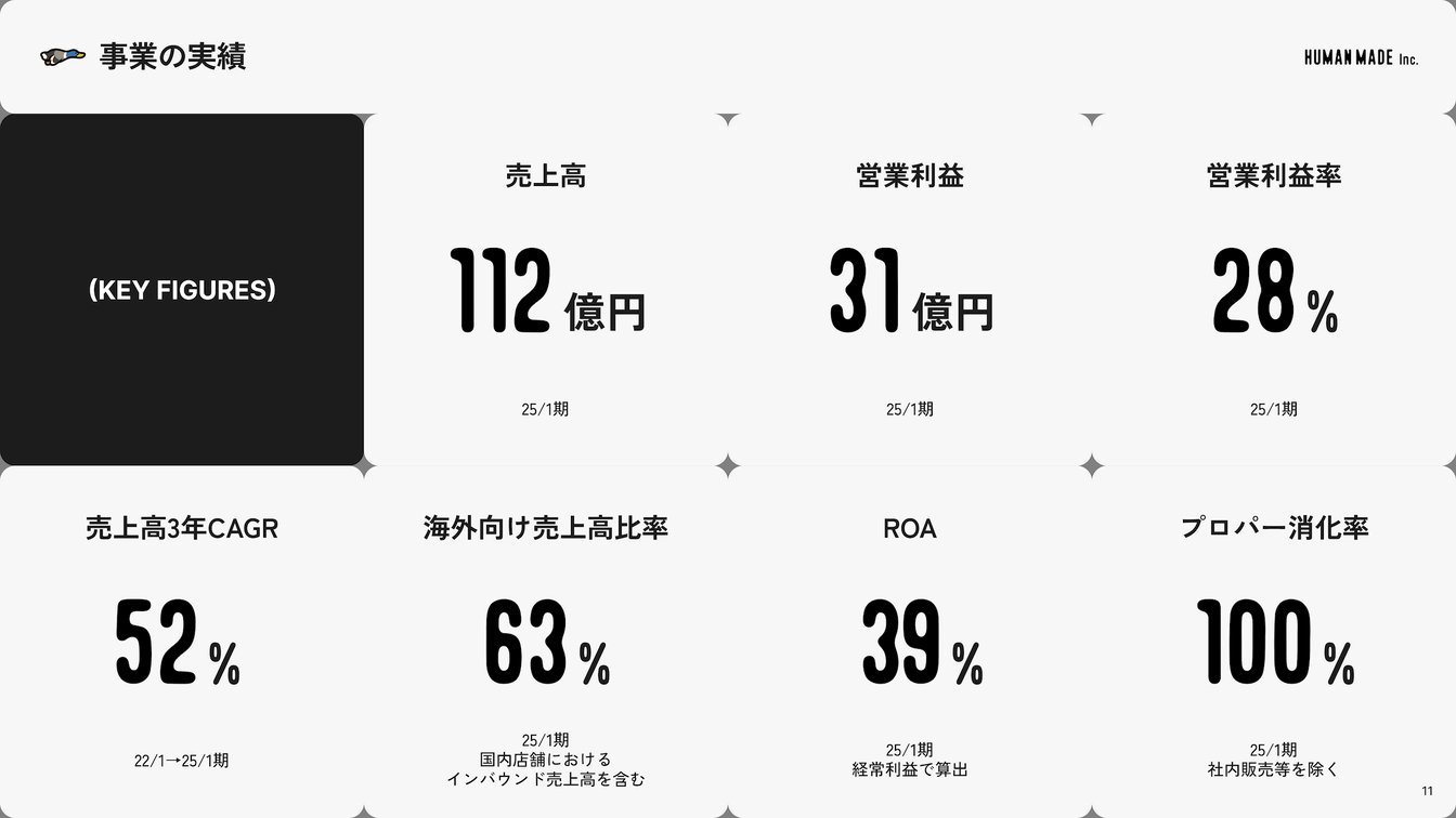 売上でいうと2025年1月期で112億、営業利益31億、営業利益率が28%。僕が入社した頃の2021年1月期の売上が18億だったので、4年で約6倍に伸びてきています。その9割以上がHUMAN MADEブランドの売上。クリエイティブとビジネスが両輪となり、結果として数字に結びついてきたと言えるのではないかと思います。