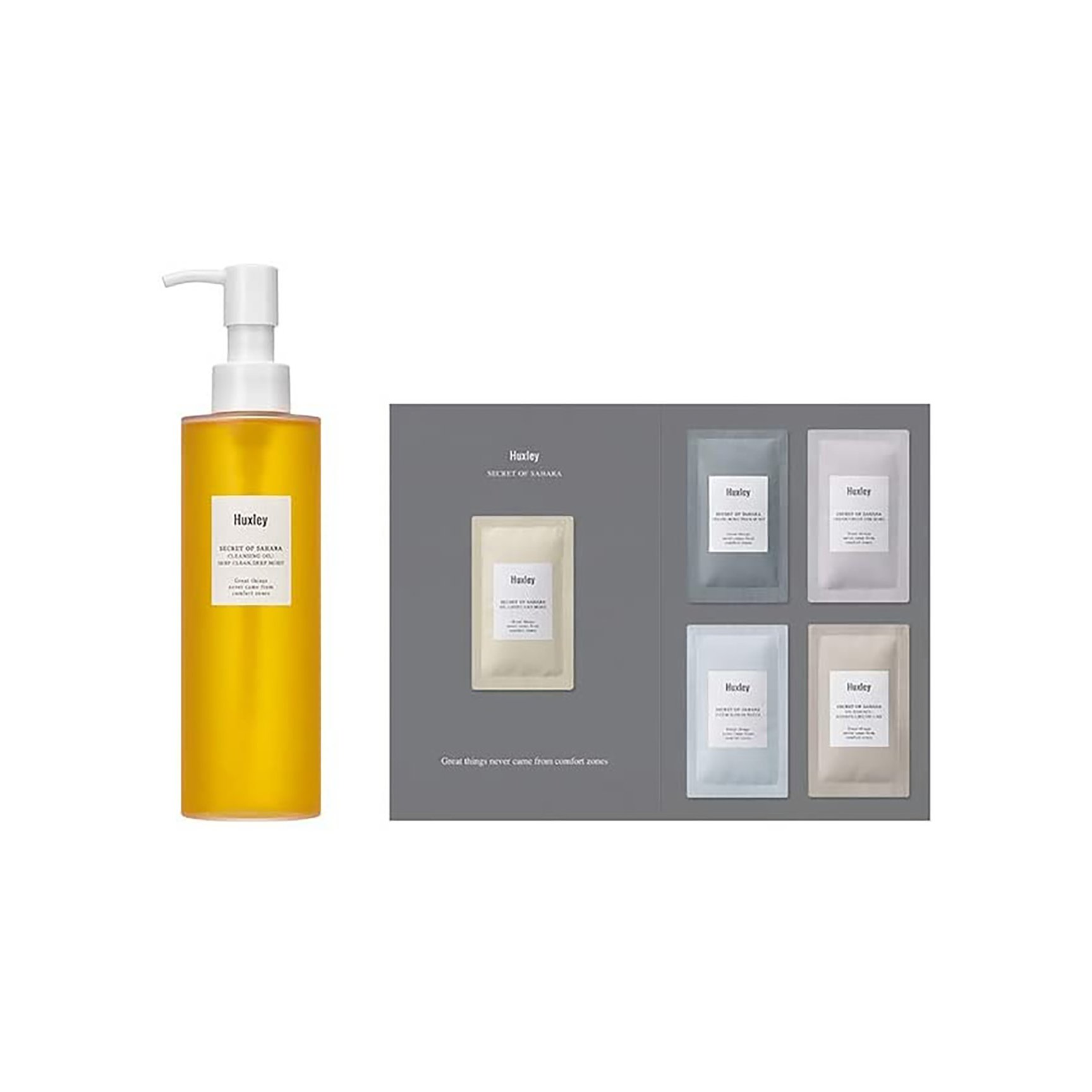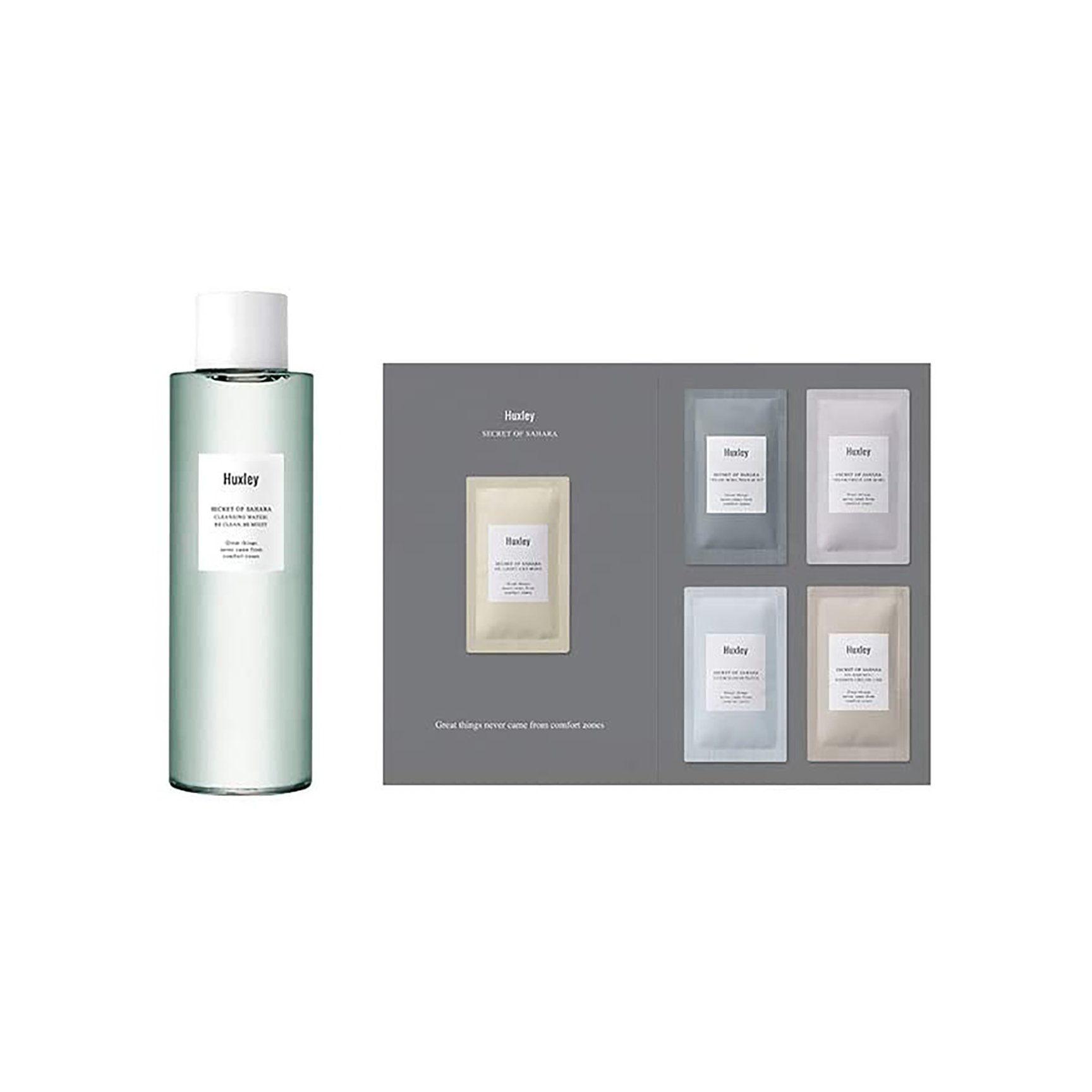 さっぱりとした使い心地でメイクや肌の汚れを優しく取り除いてくれるクレンジングウォーター。肌への刺激を抑えたマイルドな処方で保湿力もばっちりです。「ハクスリー」の人気アイテム5種類をお試しできるサンプルサシェも付属します。
