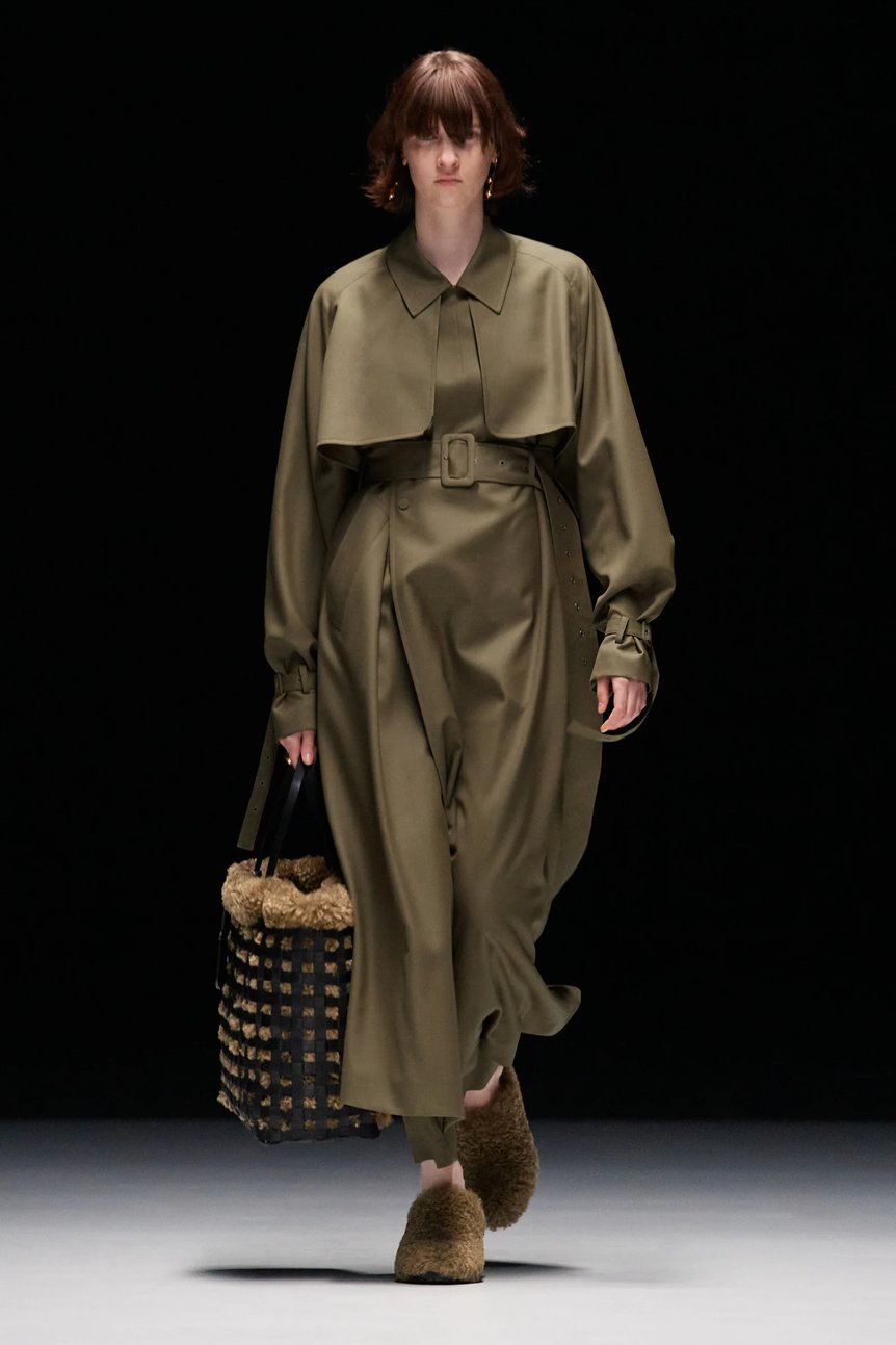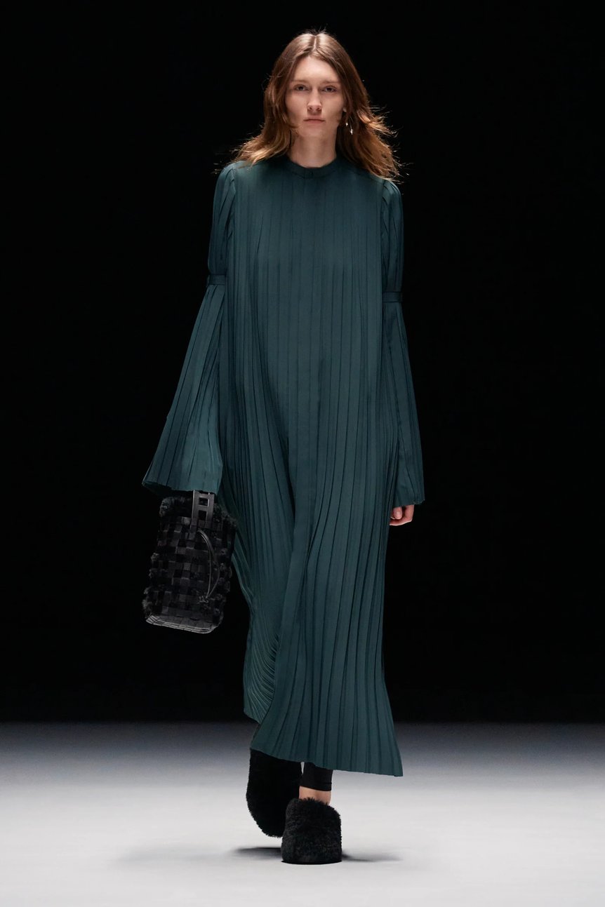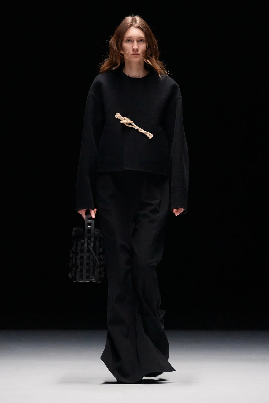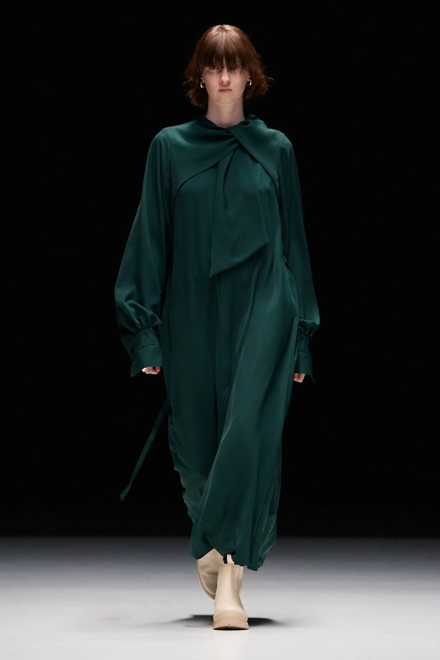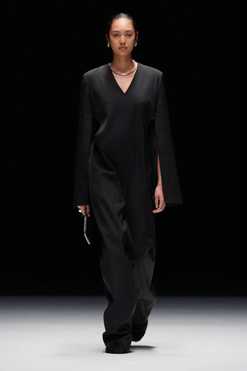 さまざまな素材とデザインで登場したジャンプスーツは、光沢のあるドローコードを絞りワイドボトムスのシルエットに緩急を。ロングドレスにも同様のテクニックで、袖が大きく広がるドラマティックなラインを作り出した。