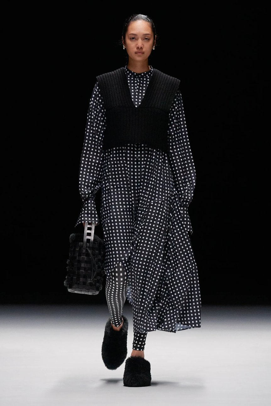さらに23年秋冬らしいディテールとして目を引いたのは、ドラマティックなボウタイを筆頭にしたリボンやテープ使いのテクニック。