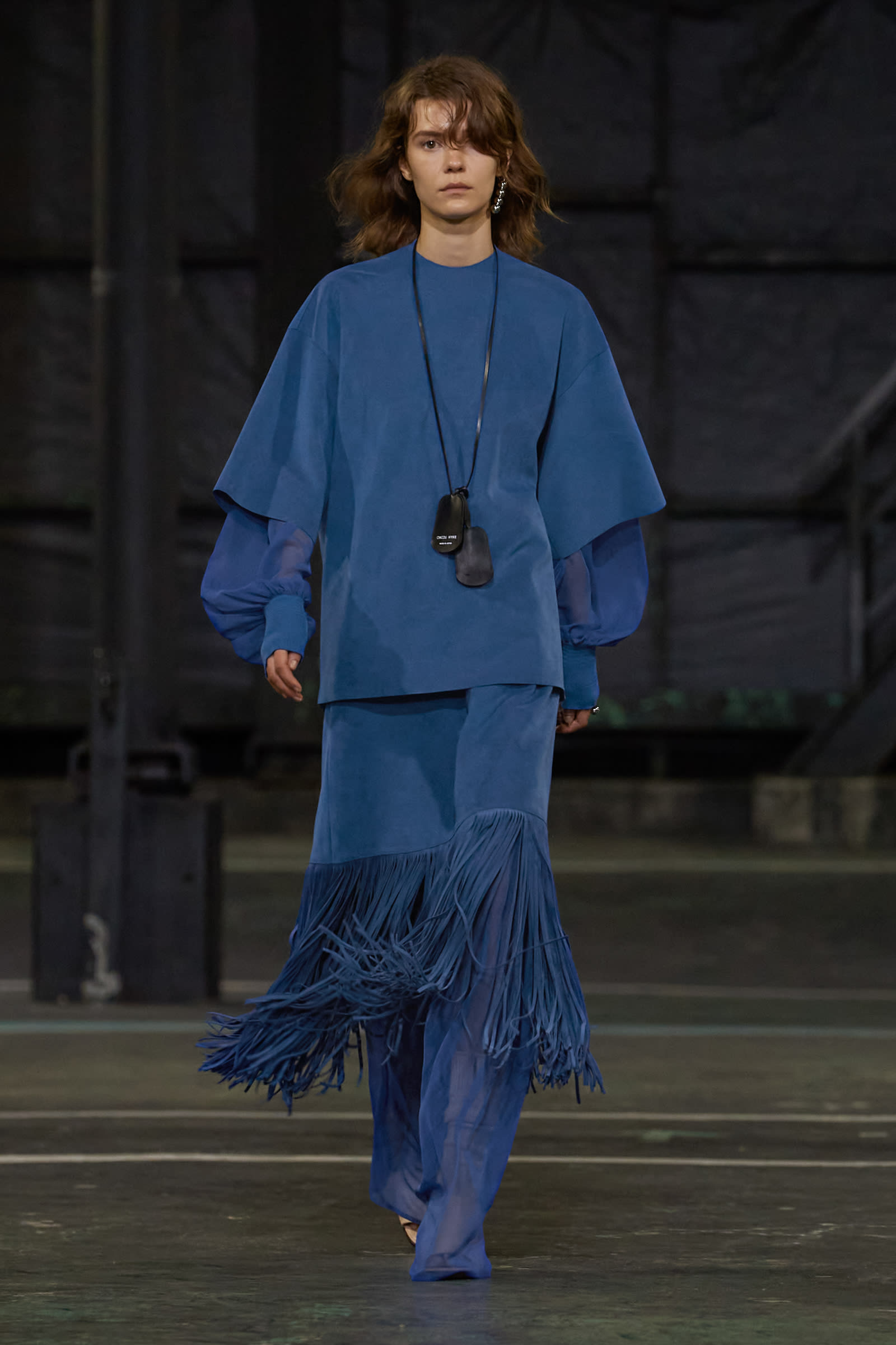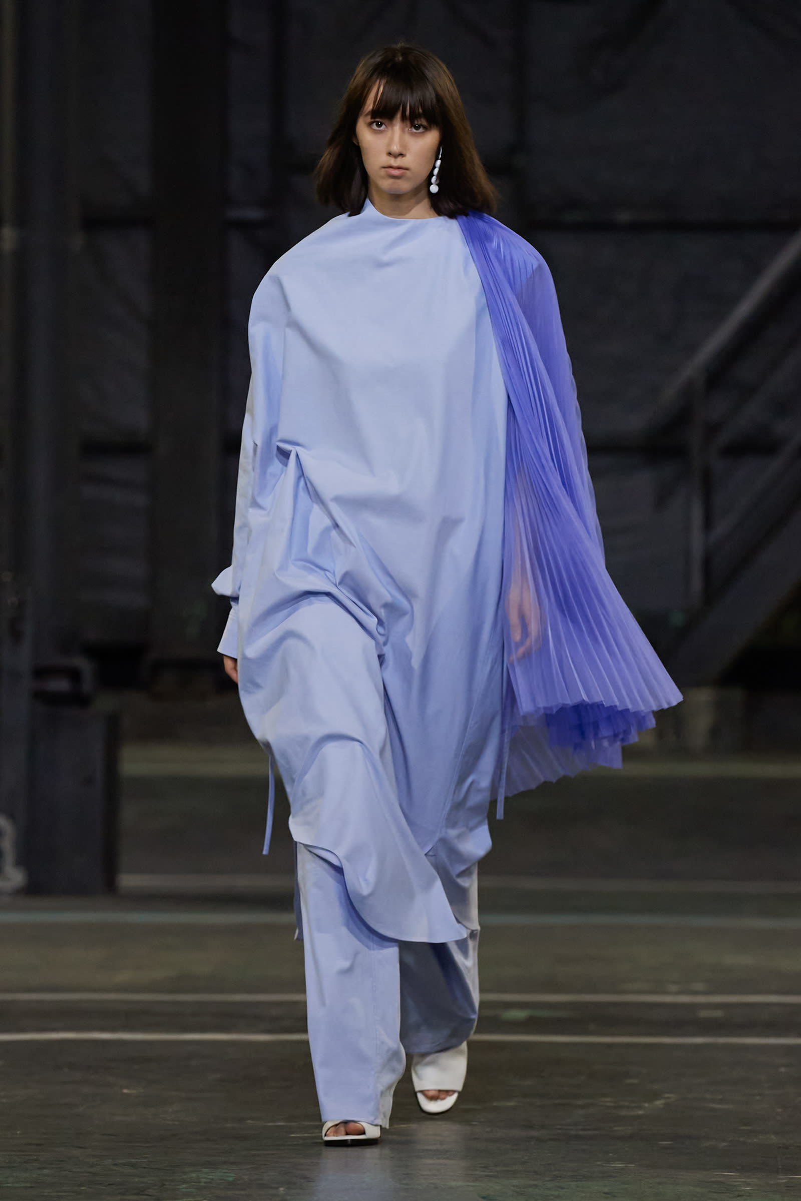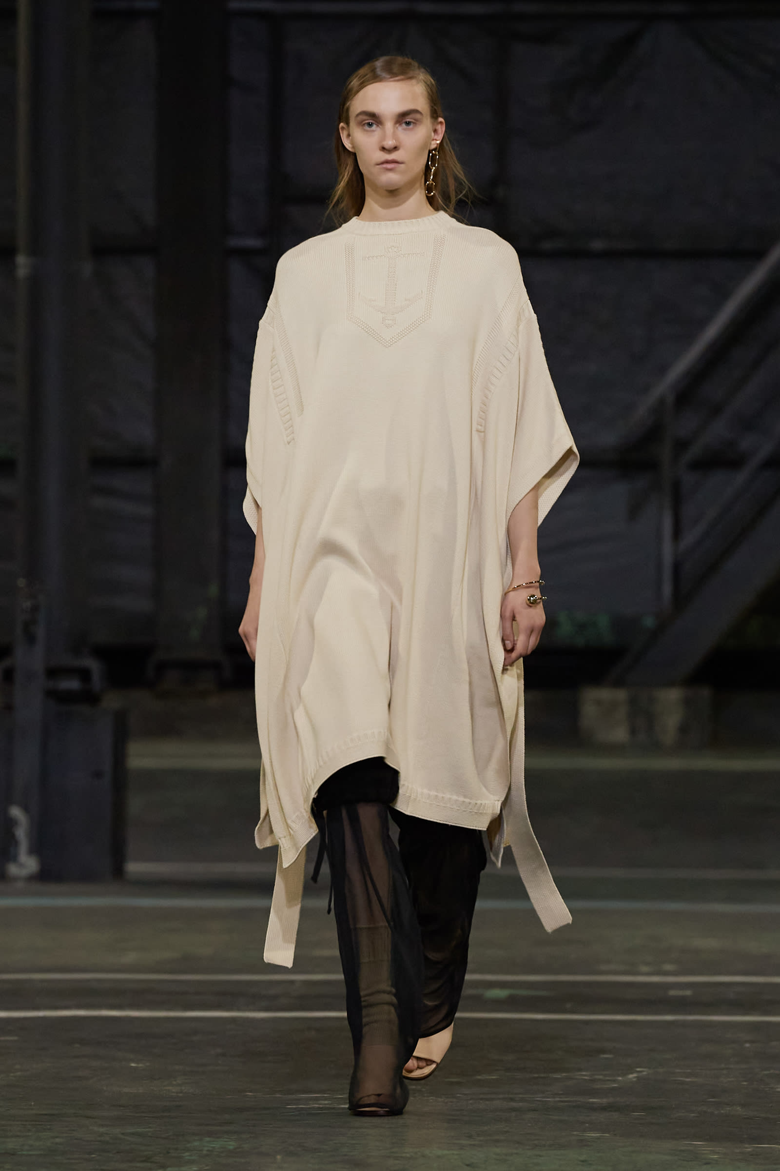 今シーズンも、王立海軍(ROYAL NAVY)のベンタイルスモックやアーマーベスト、メディカルガウン、ガンジーセーターといった、ミリタリーや古着に精通したデザイナーならではのインスピレーションソースを、独自の感性で再構築。テクニカルな機能素材やフェミニンなシフォン素材、鮮やかなブルーなどのカラーを差し込むことで、唯一無二のスタイルを作り上げた。