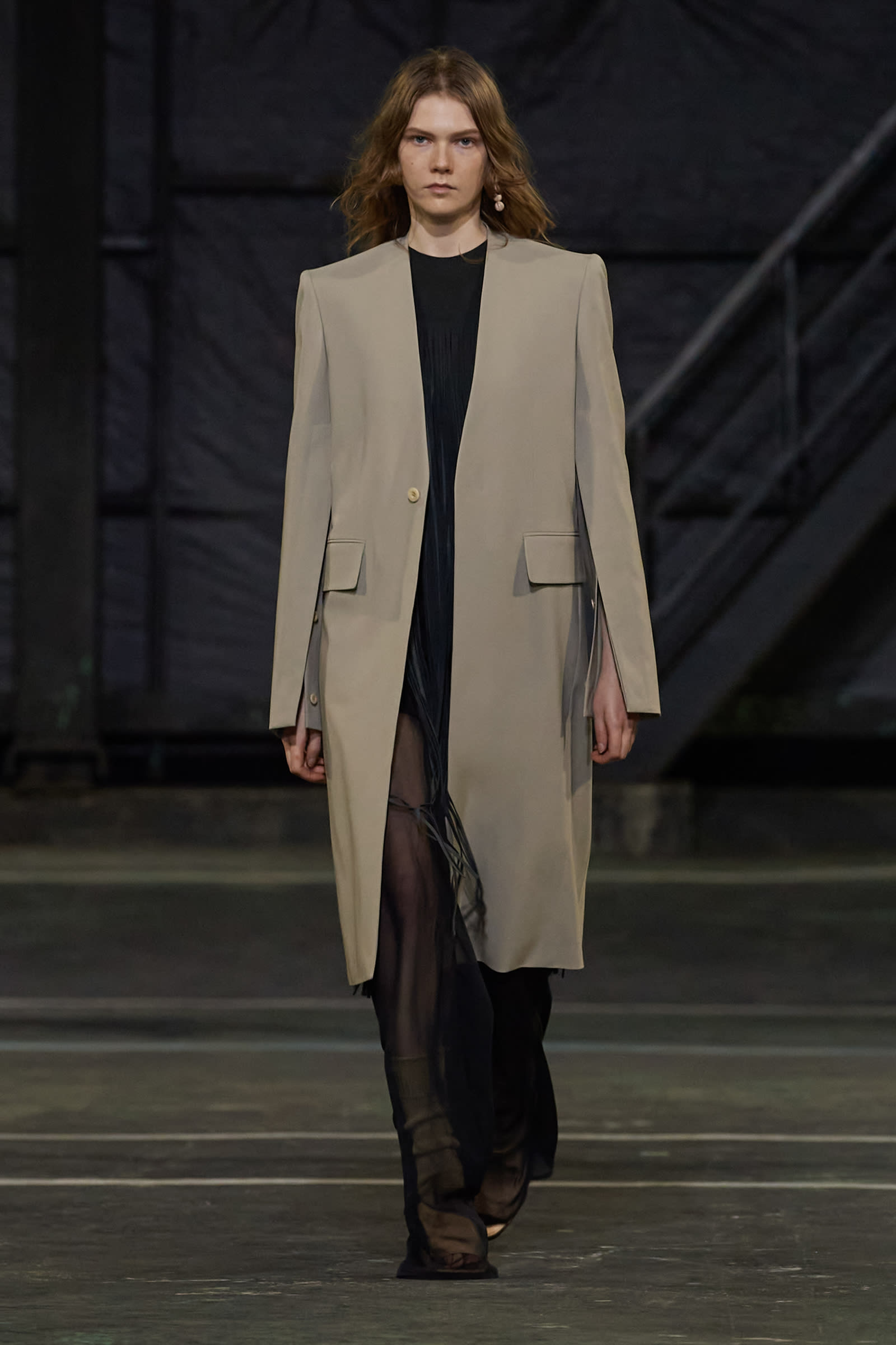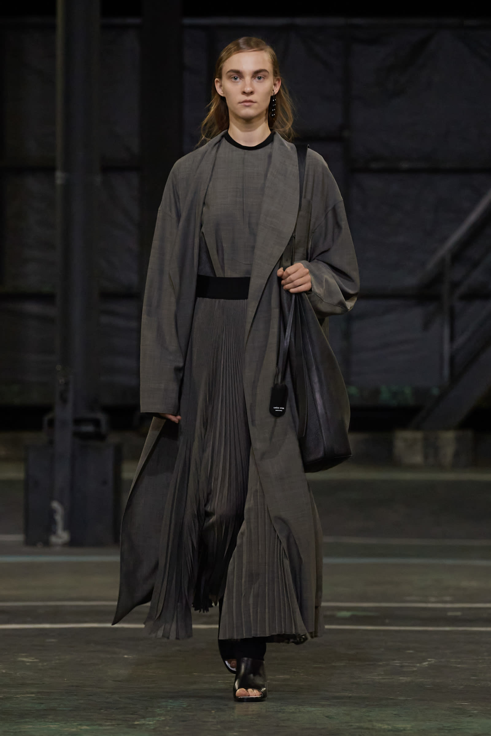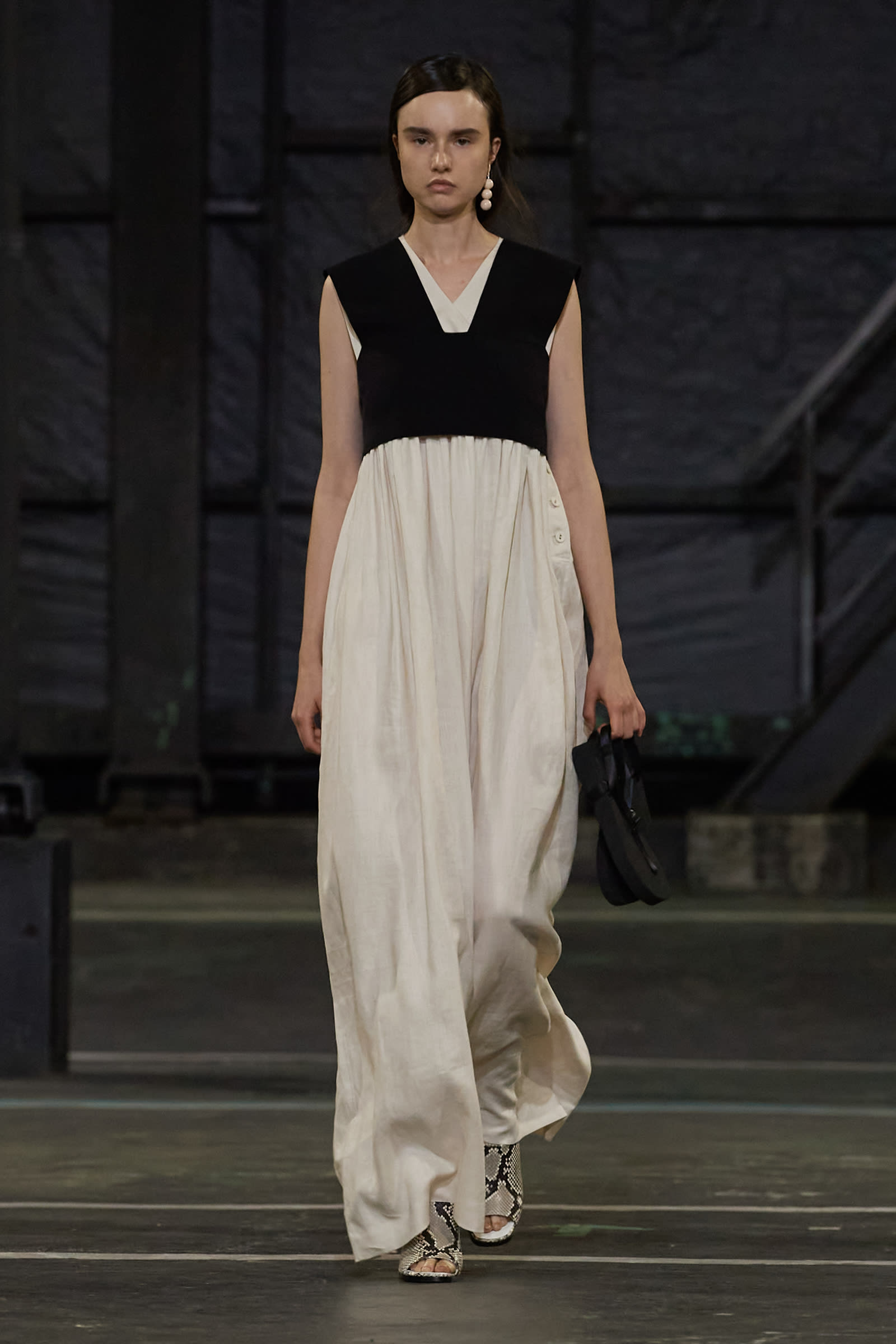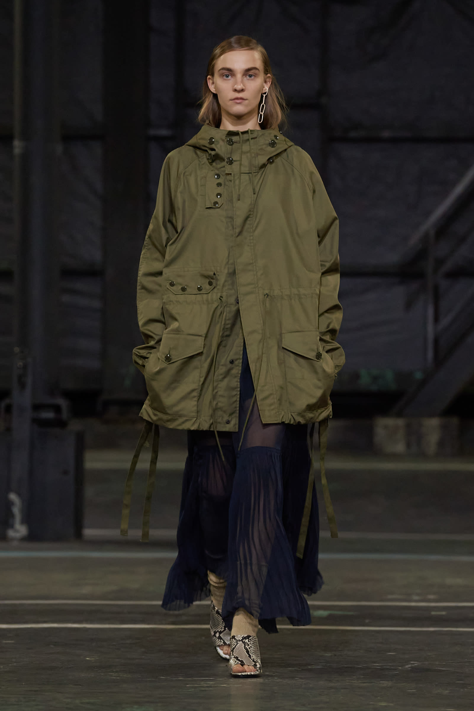 舞台は廃墟のような雰囲気のカートパーク。退廃的なフロアとは対照的な、白いボックス型のゲートからモデルが登場する。ファーストルックはネイビーのロングコート。1940年代の英国軍のデザートストームコートを参照したデザインで、素材は超軽量ナイロンのパーテックスを使用。大振りのバックパックを背負いながらも、風をはらんだテキスタイルがアクセントのグログランリボンと共になびき、ソックスと合わせたベージュのオープントウシューズが上品な印象に仕上げている。
