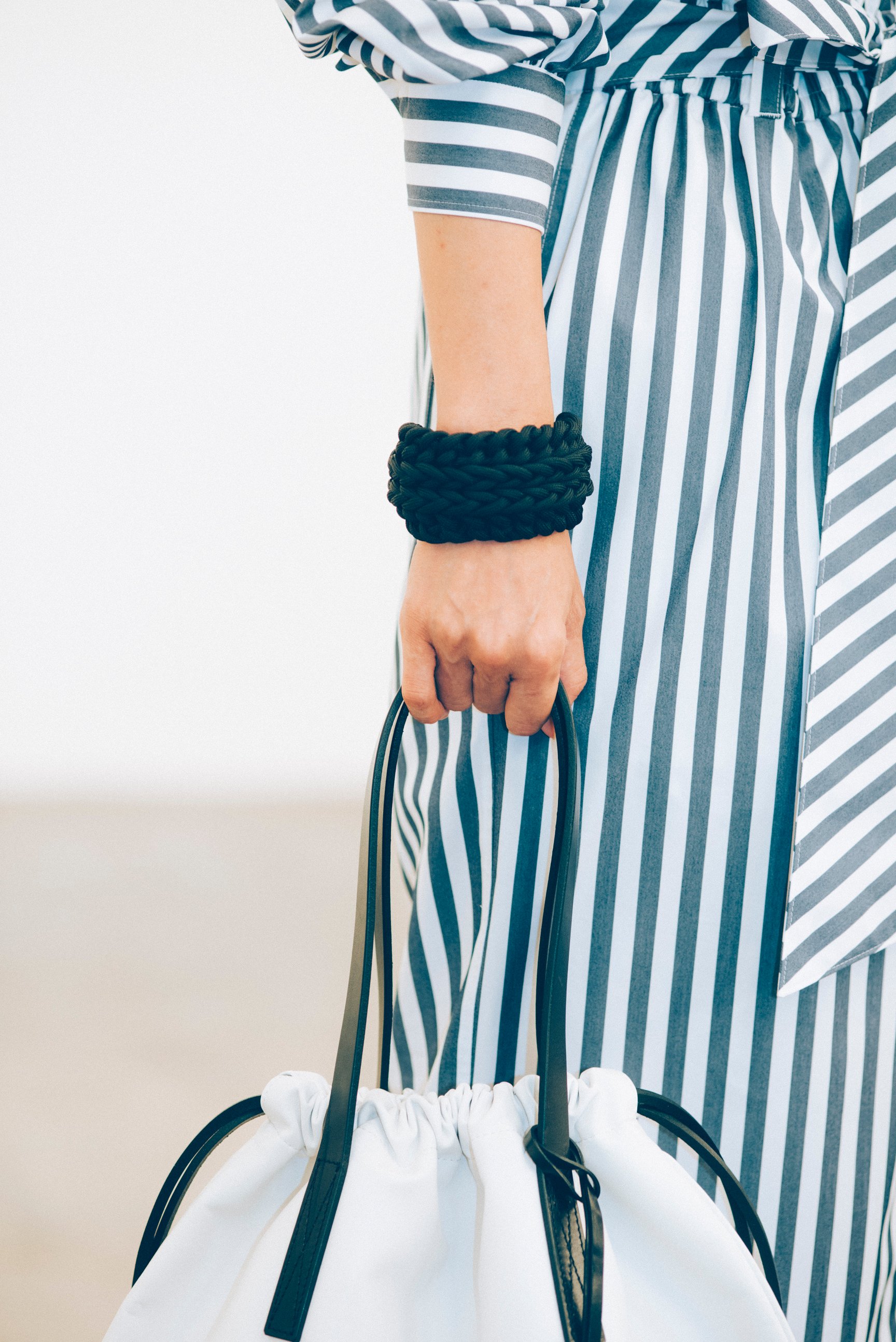今季のキーカラーは、ターコイズからネイビー、ストライプで表現したブルーのグラデーション。スポーティな機能性素材やデニム、麻など、質感の異なるカジュアル素材とドレッシーなシルエット、鮮やかな色の組み合わせで、唯一無二のスタイルを作り上げた。