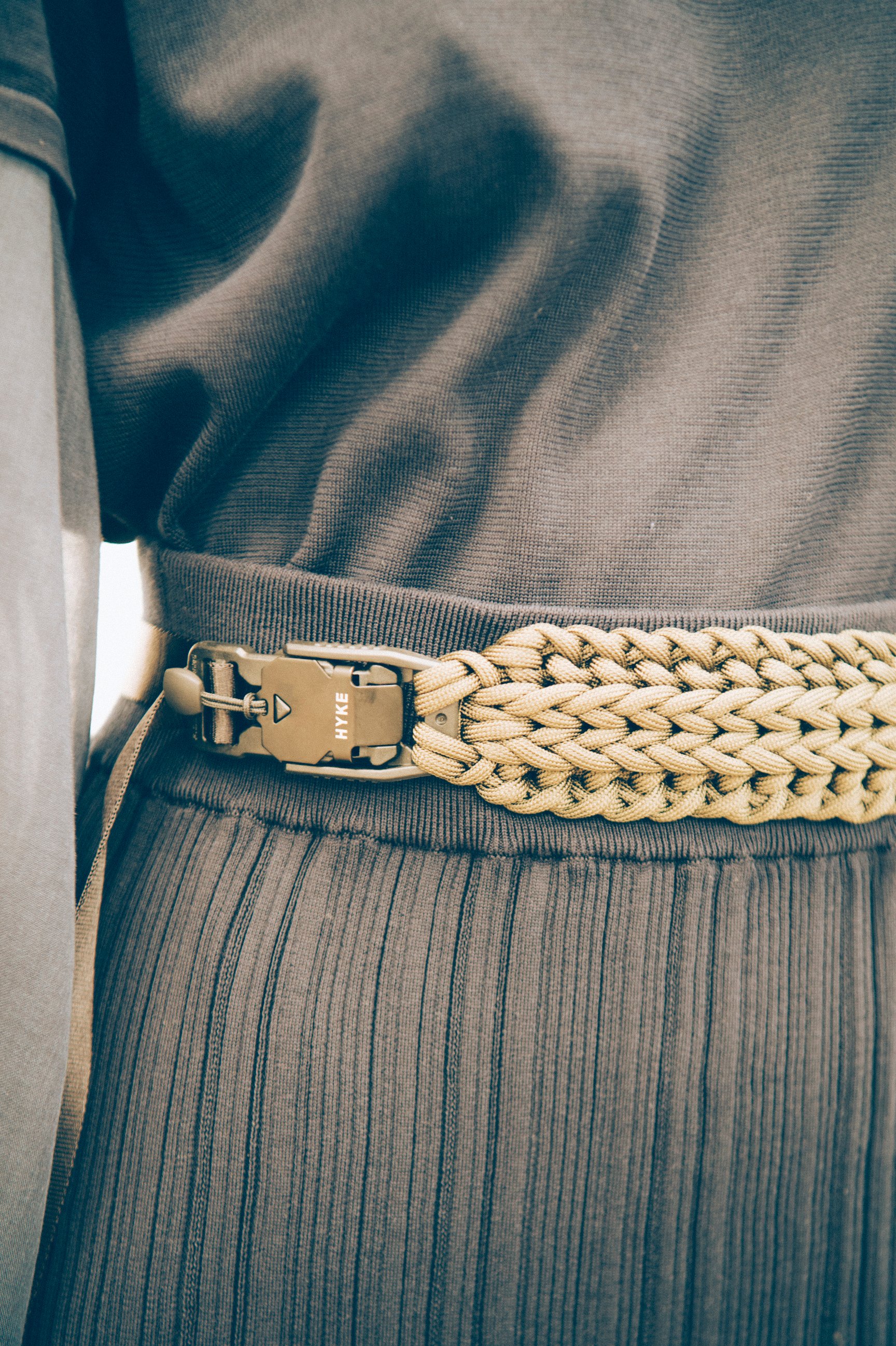登山やキャンプで多用途に使う“パラコード”から着想したブレスレットやベルトなどのオリジナルアクセサリーも、スタイリングのアクセントになっている。