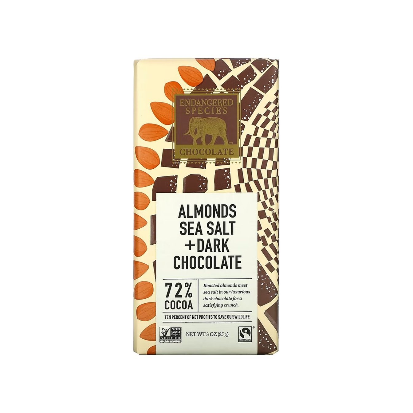 Endangered Species Chocolate(エンデンジャードスピーシーズチョコレート), アーモンドシーソルト+ダークチョコレート、カカオ72%、85g(3オンス) ¥418(関税・消費税込)