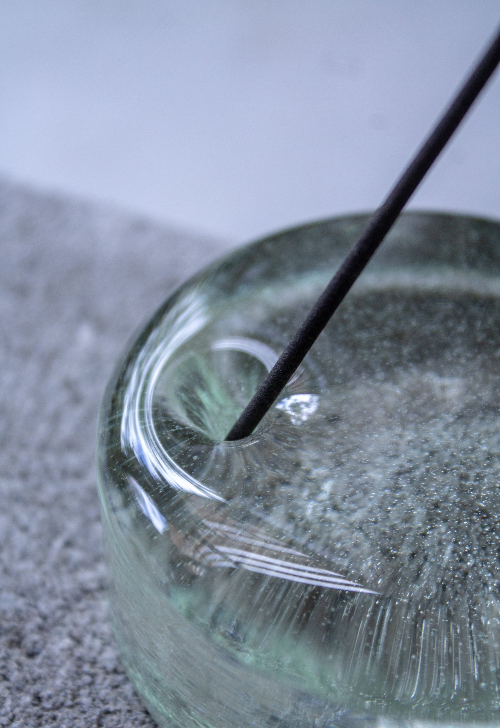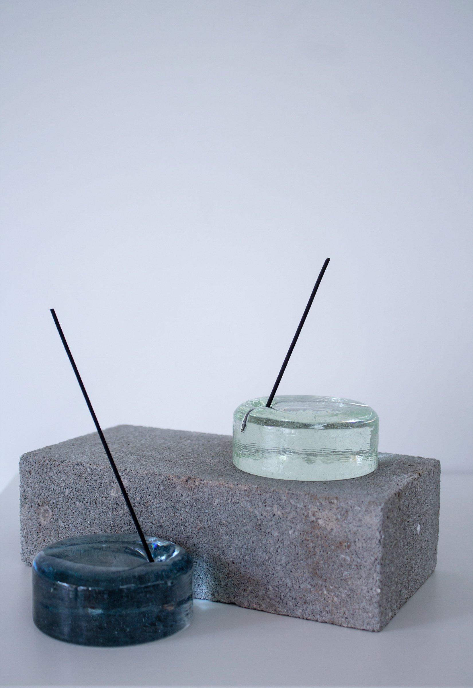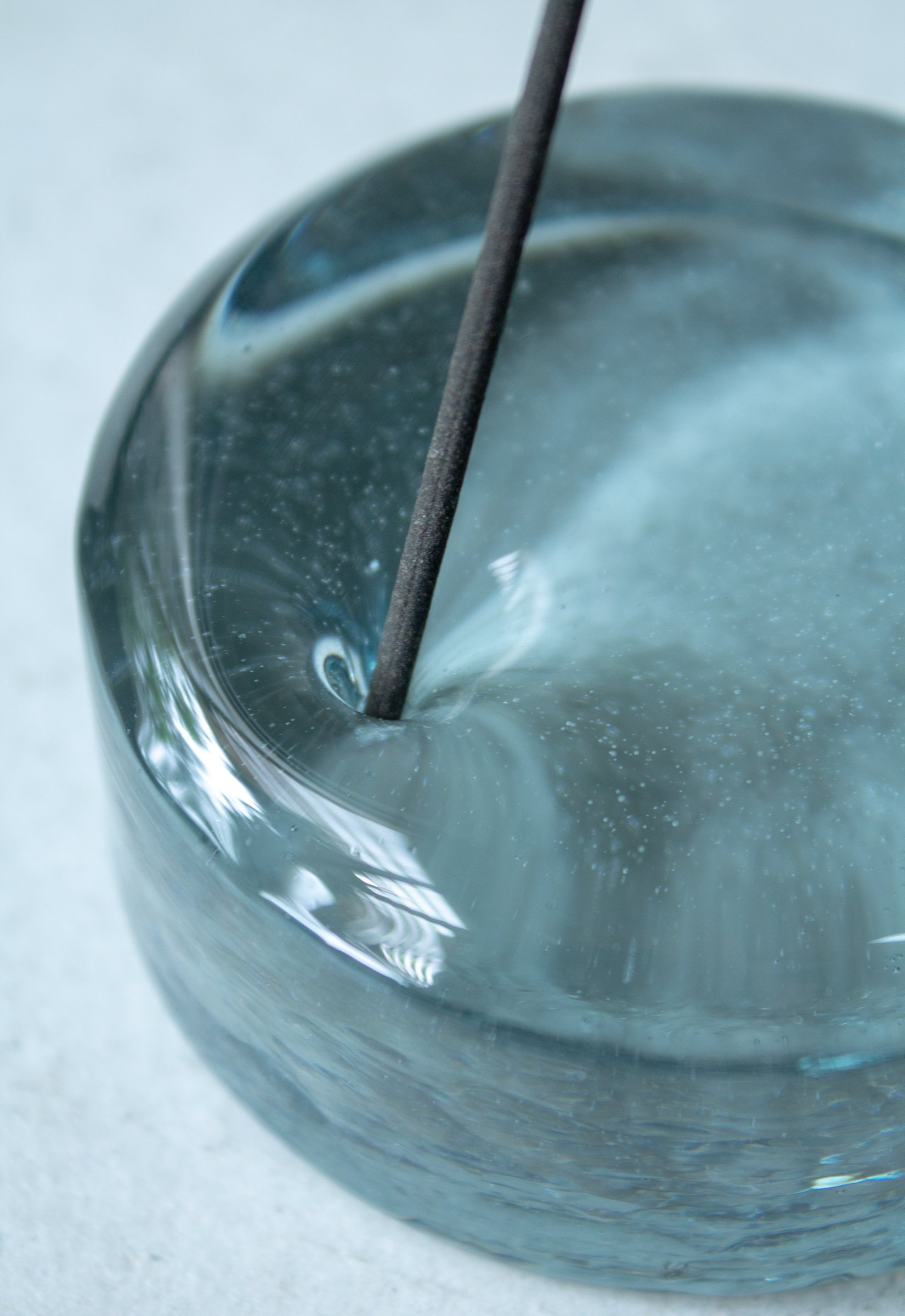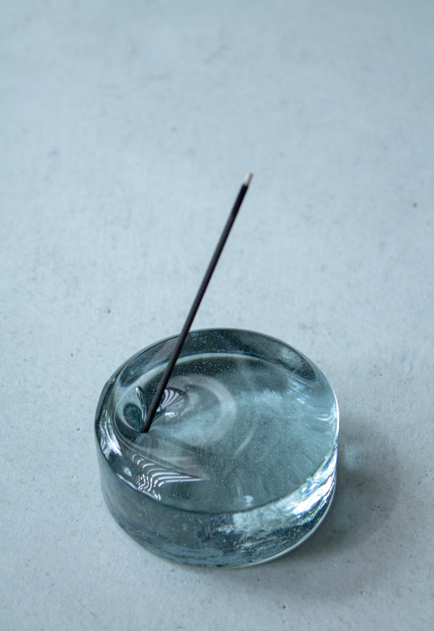 蛍光灯やブラウン管テレビの液晶からリサイクルした再生ガラスを使用した香立て。手作業で成形しているため、気泡の入り方などに個体差があるため一点モノです。ガラス特有の涼しげな透明感やしっとりとした質感が特徴。コンパクトな作りで、長さ9cmのお香に対応。全2色展開。
