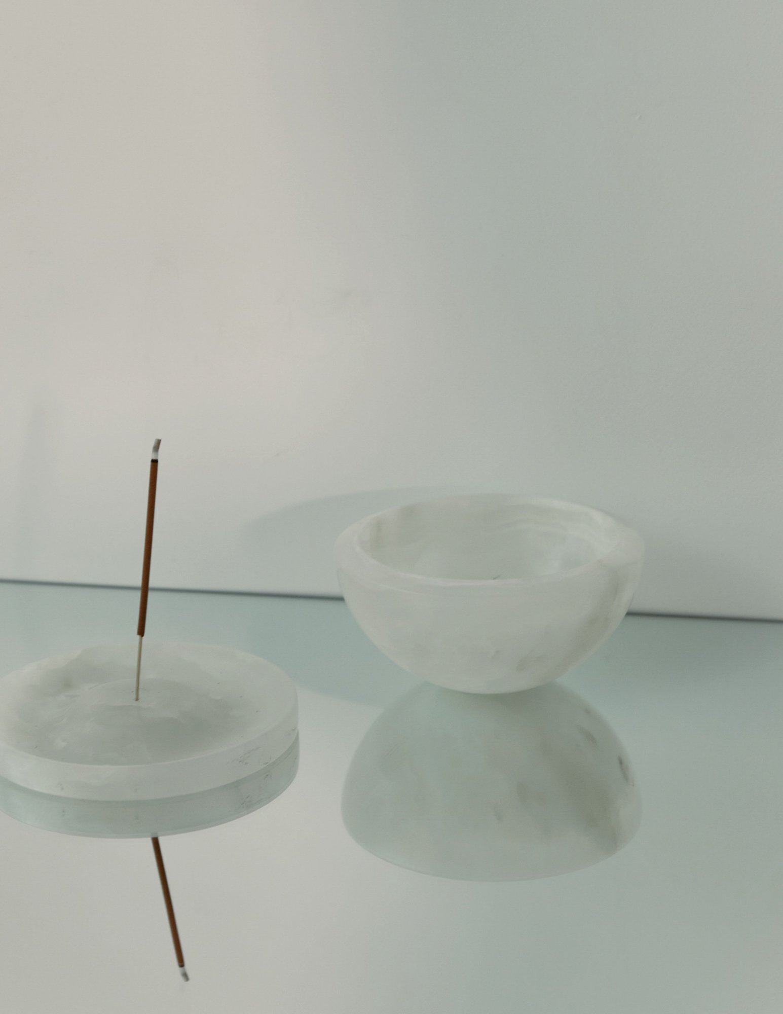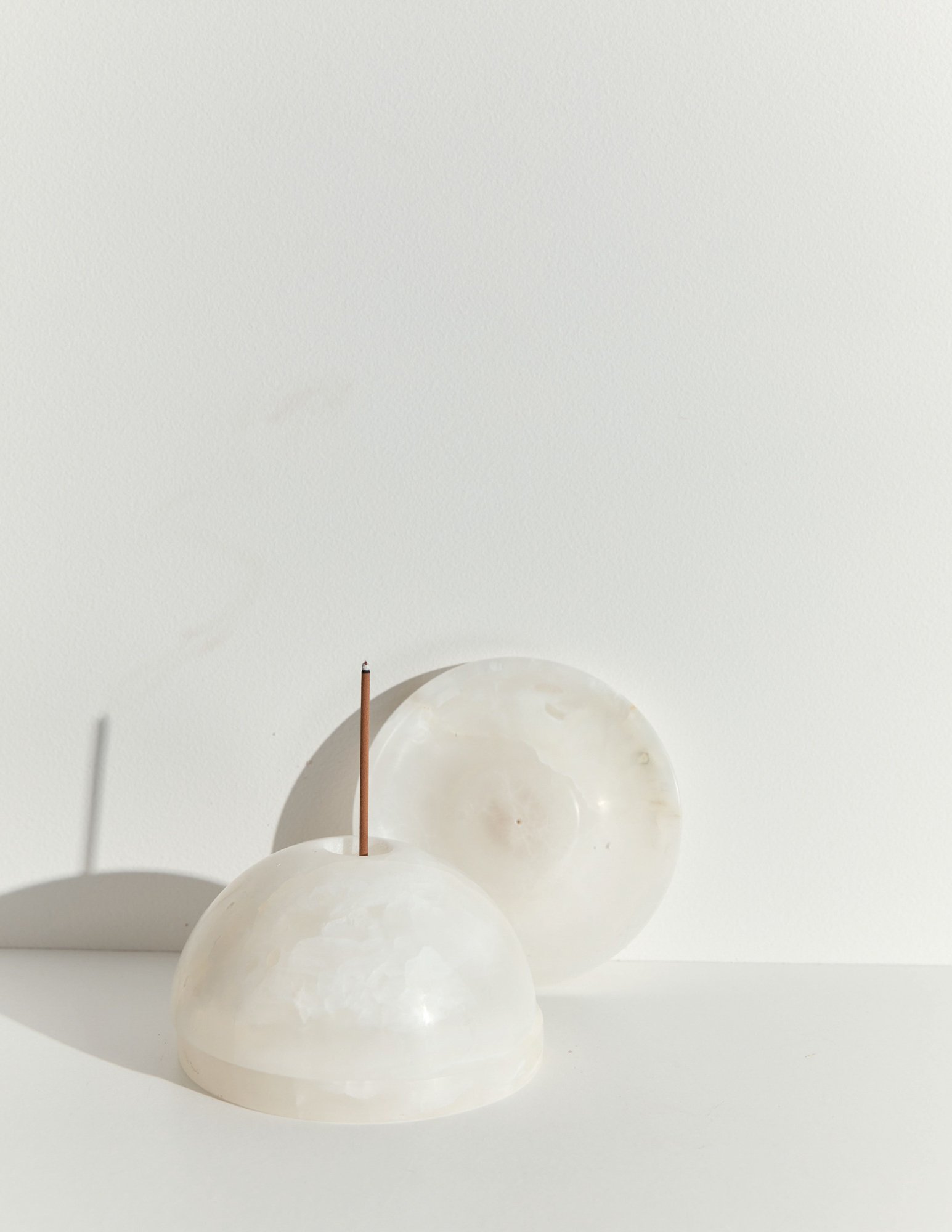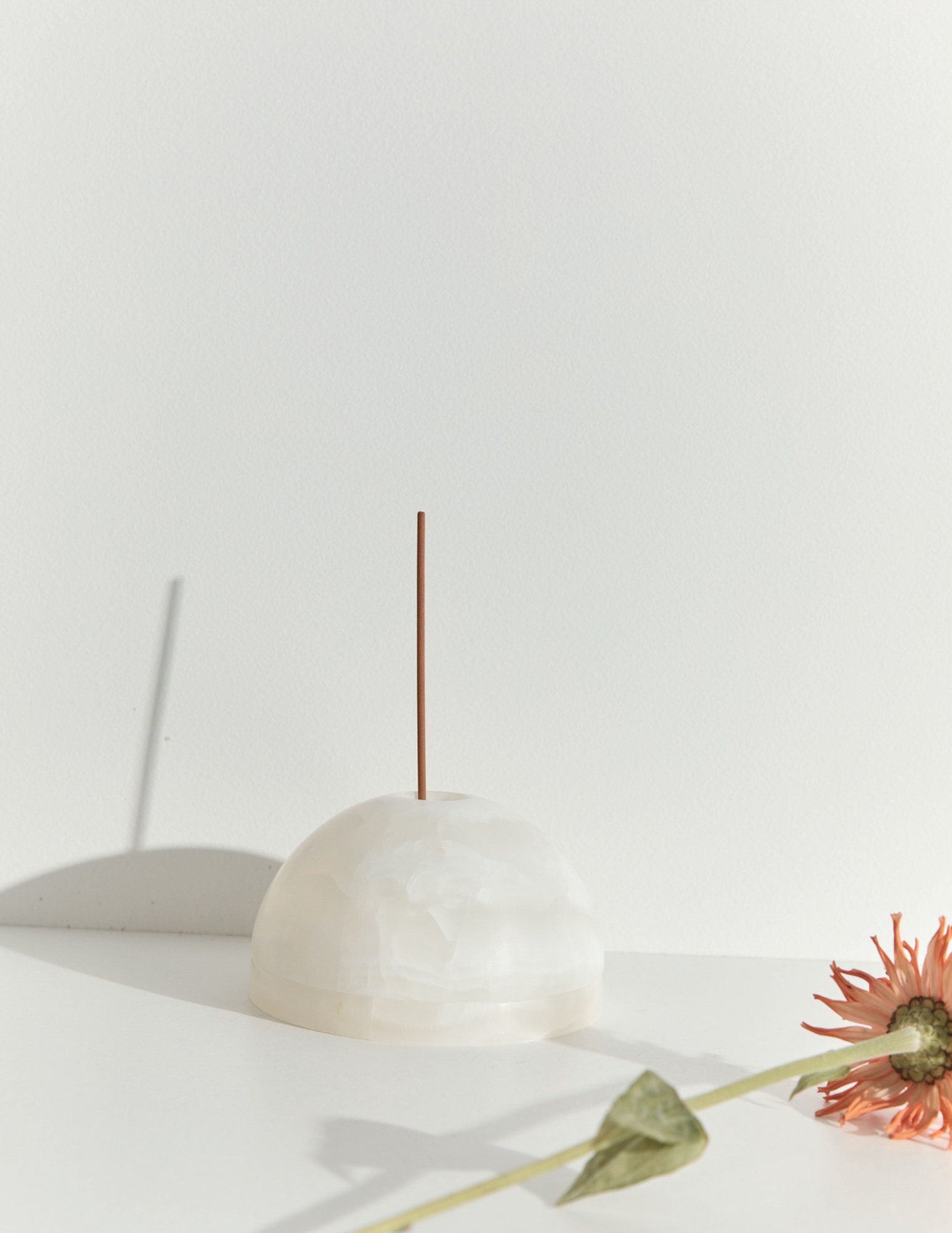 天然石の一種であるホワイトオニキスから削り出した香立て。ドーム状のフォルムは、水平線から昇る太陽をイメージしてデザインしたという。ドーム部分を外して底の受け皿だけで使うことも可能です。