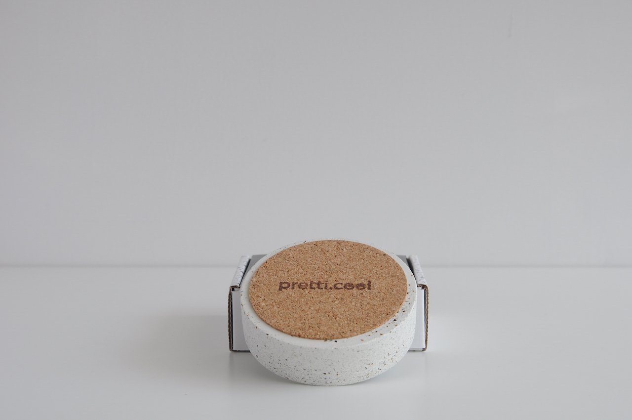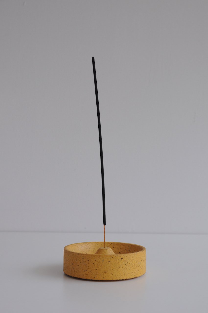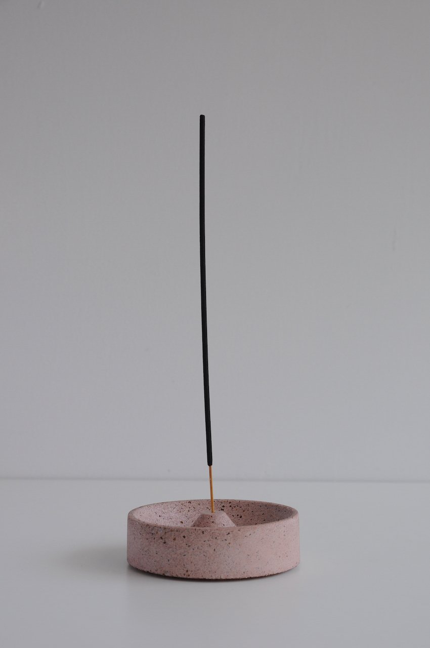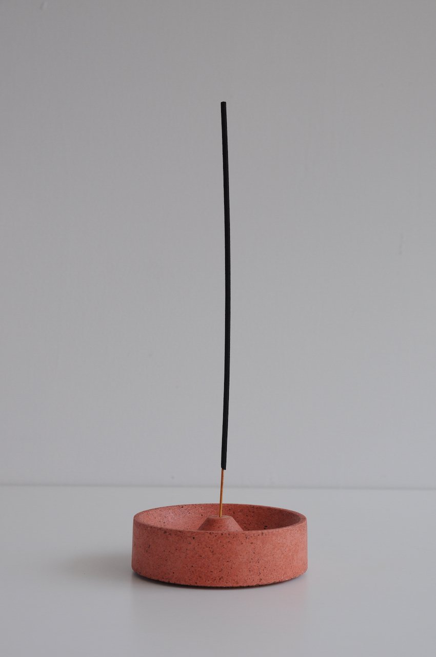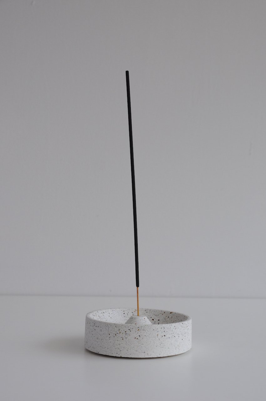 アメリカ・ヒューストンを拠点に、アートや建築、写真、デザインなどの異なる背景をもつチームで立ち上げたブランド。ミニマルなデザインの香立ては、リサイクルガラスをコンクリートに混ぜたテラゾー(人工大理石)を使用しています。素材そのものの模様が活きるシンプルなフォルムと、ずっしりとした重みが特徴。置き場所を傷つけないよう底面にはコルクシートが付いています。全4色。