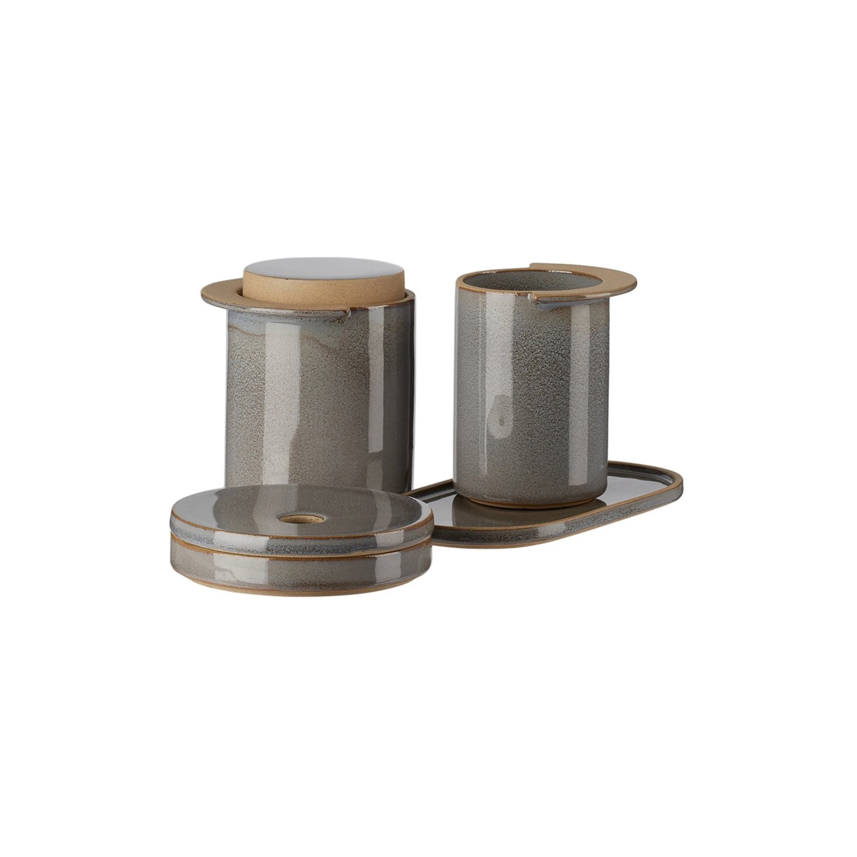 歯ブラシスタンド、ソープディッシュ、トレイ、小物入れがセットに。これを手に入れるだけで、バスルームに統一感が生まれ、こなれた印象が叶います。