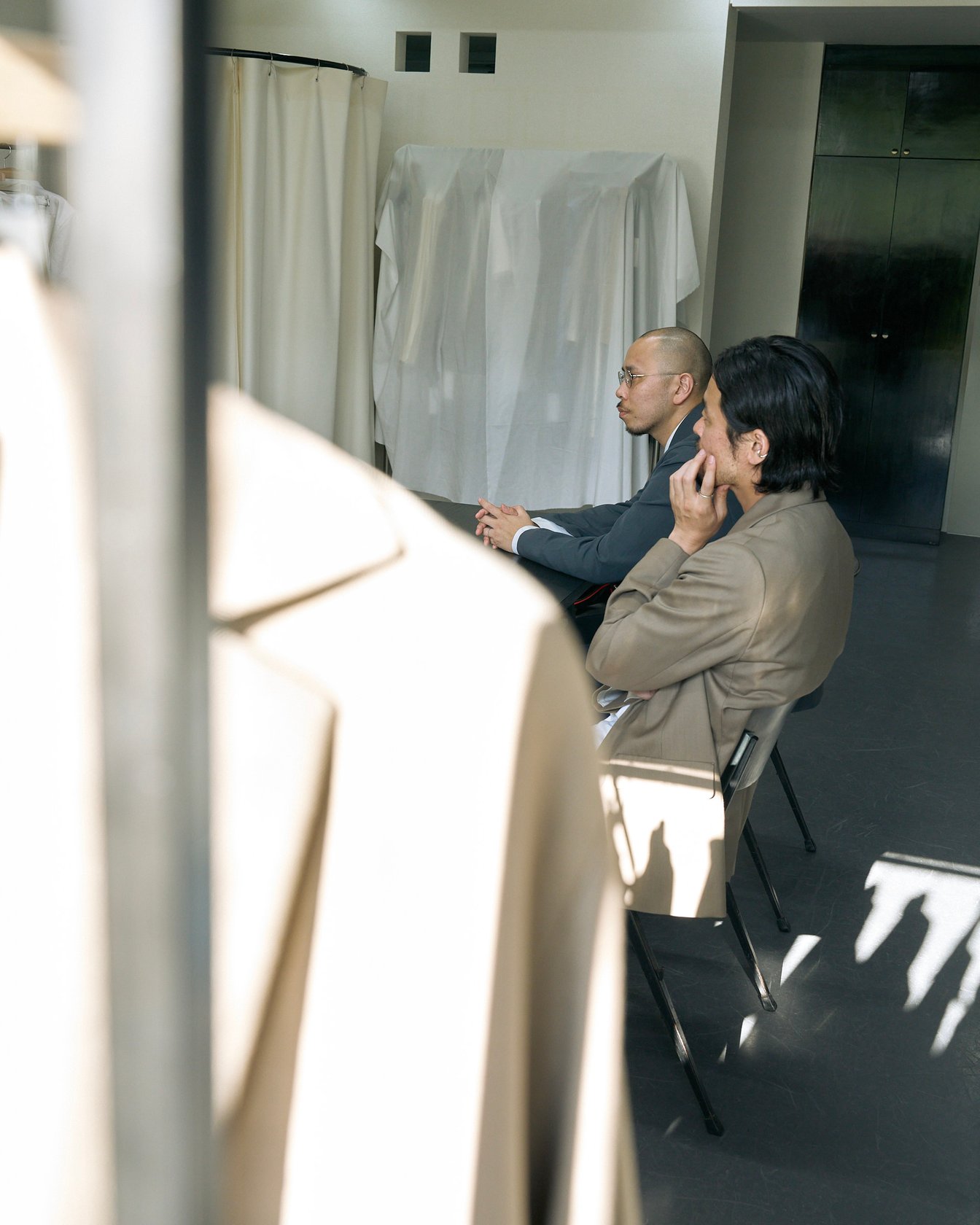 小林祐と安倍悠治が2021年秋冬シーズンに設立した「イレニサ(IRENISA)」は、デビュー翌年の2022年に「TOKYO FASHION AWARD」を受賞し、2025年春夏シーズンからはウィメンズラインもスタートするなど、発表を重ねるたびに注目度を高めてきた。小林は「ヨウジヤマモト(Yohji Yamamoto)」、安倍は「サポート サーフェス(support surface)」でパターン技術を中心に経験を重ねた服作りのプロフェッショナル。二人が培ったテクニックで仕立てるコートやボトムは、なめらかなシルエットと緻密なディテールワークが冴え渡る。自らを“服飾造形作家”と名乗る小林と安倍は、何からインスピレーションを得て、どのようにコレクションを制作しているのだろうか。二人の創作ストーリーを訊ねる。
