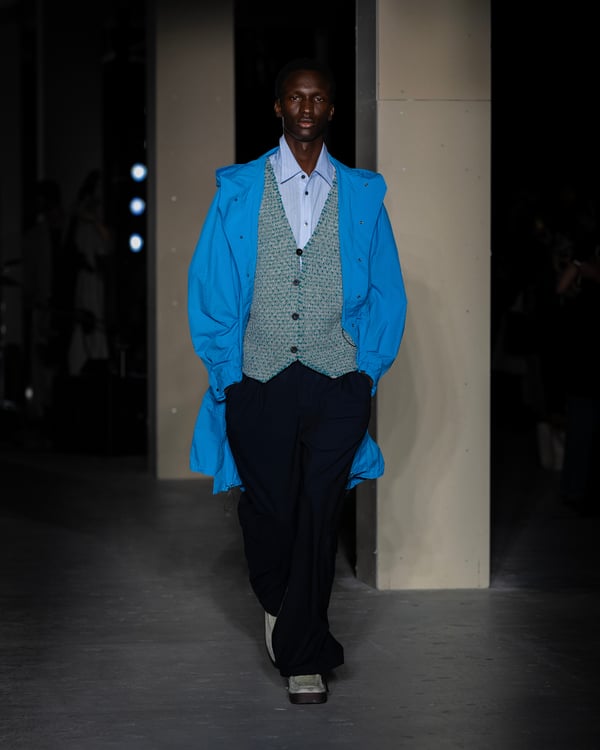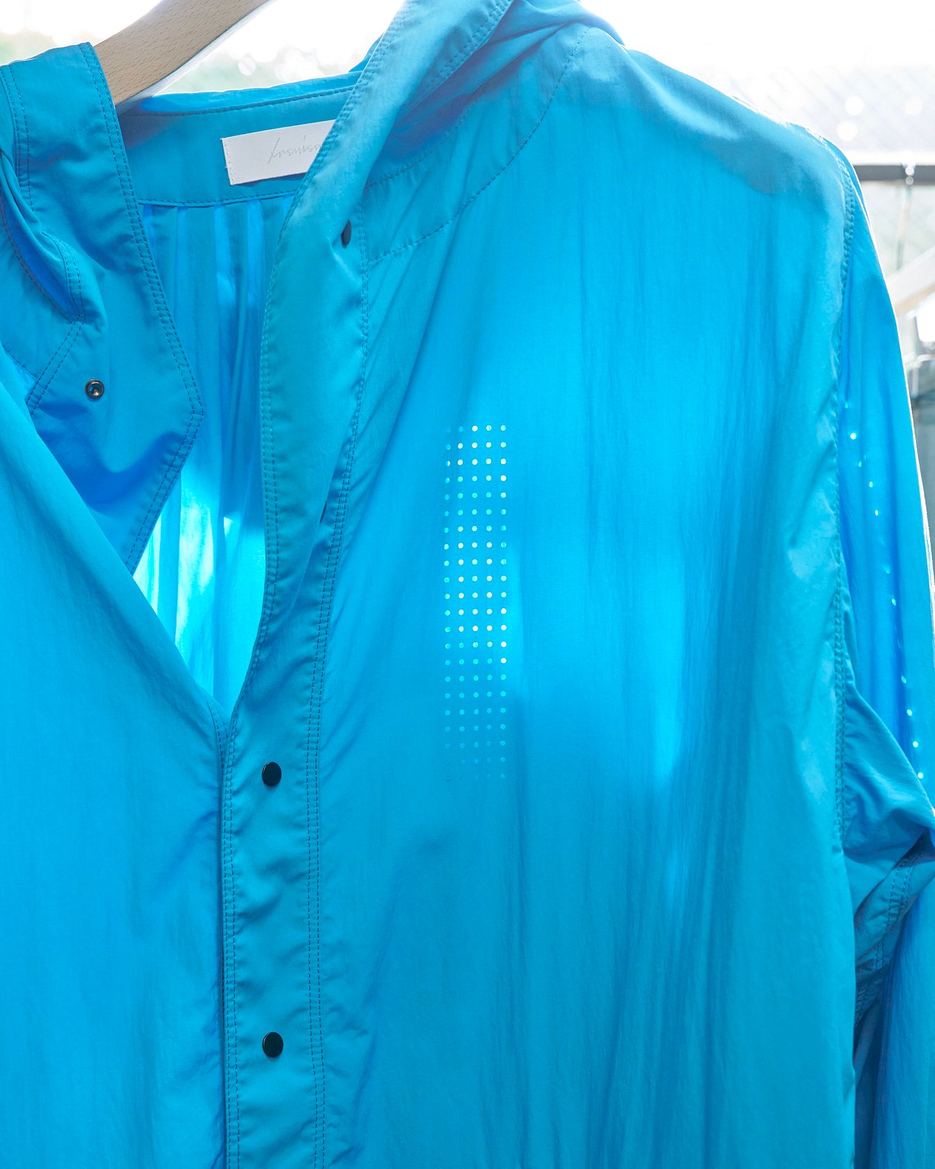 安倍:フォンタナの作品にはドット柄で制作したブルーライトのシリーズがあります。穴から肌が見えるドットのディテールに、フォンタナの要素を取り入れました。今回コートに使ったナイロン素材はそれなりに重さがあるので、穴を開けることでガーメントとしての軽やかさを演出しました。