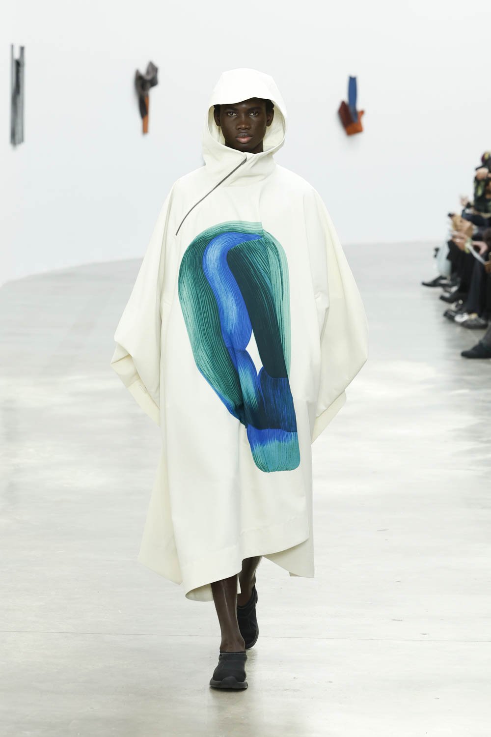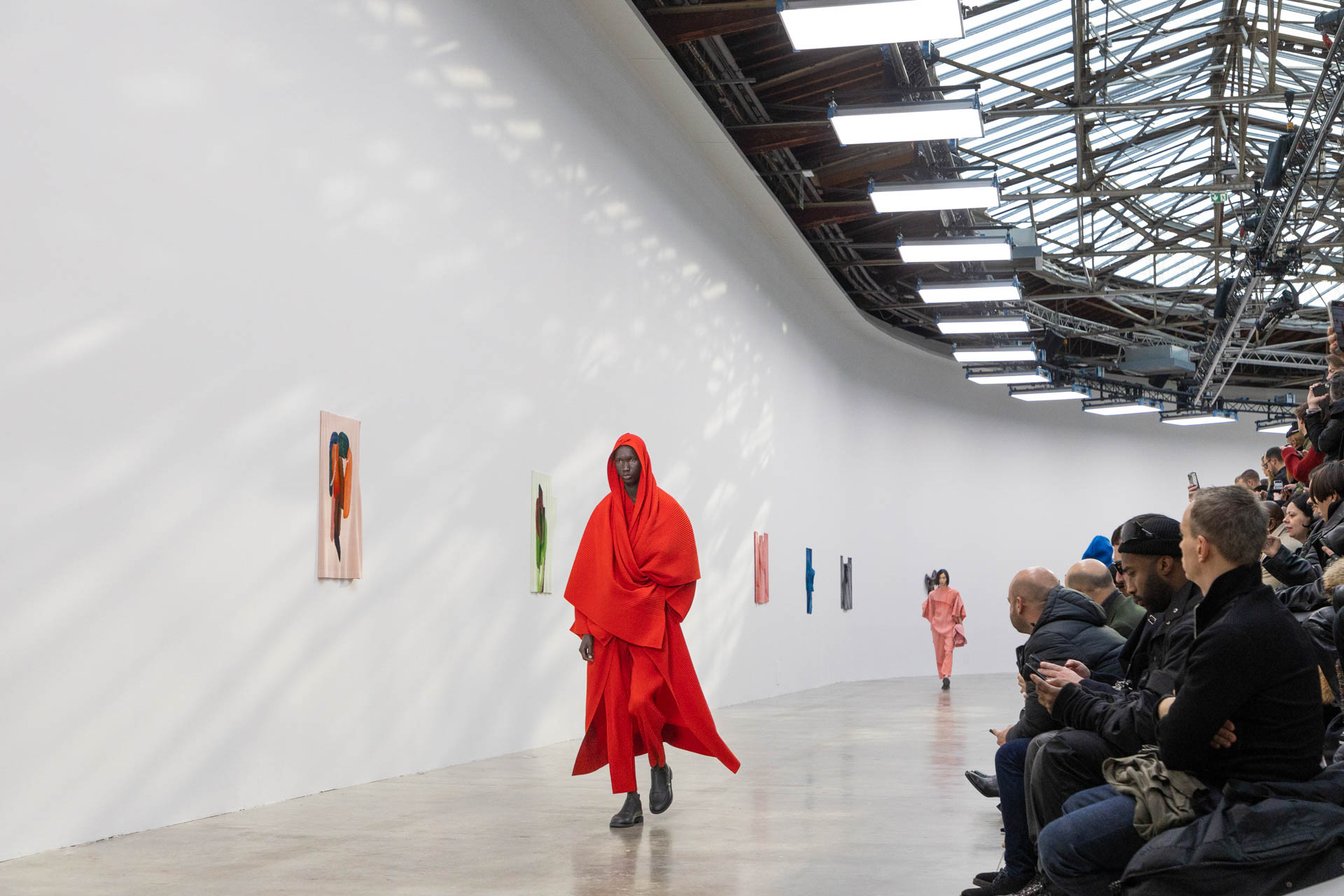 会場はパレ・ド・トーキョー(Palais de Tokyo)。天井から自然光が差し込み、ゆるやかなカーブを描く壁には服がアート作品のように展示されている。ショー冒頭でモデルたちが着用していたのは、ブルレックのライフワークであるドローイングを定番のプリーツ素材に掛け合わせたシリーズ。白の余白が、鮮やかな色彩と生き生きとしたブラシストロークを引き立てていた。