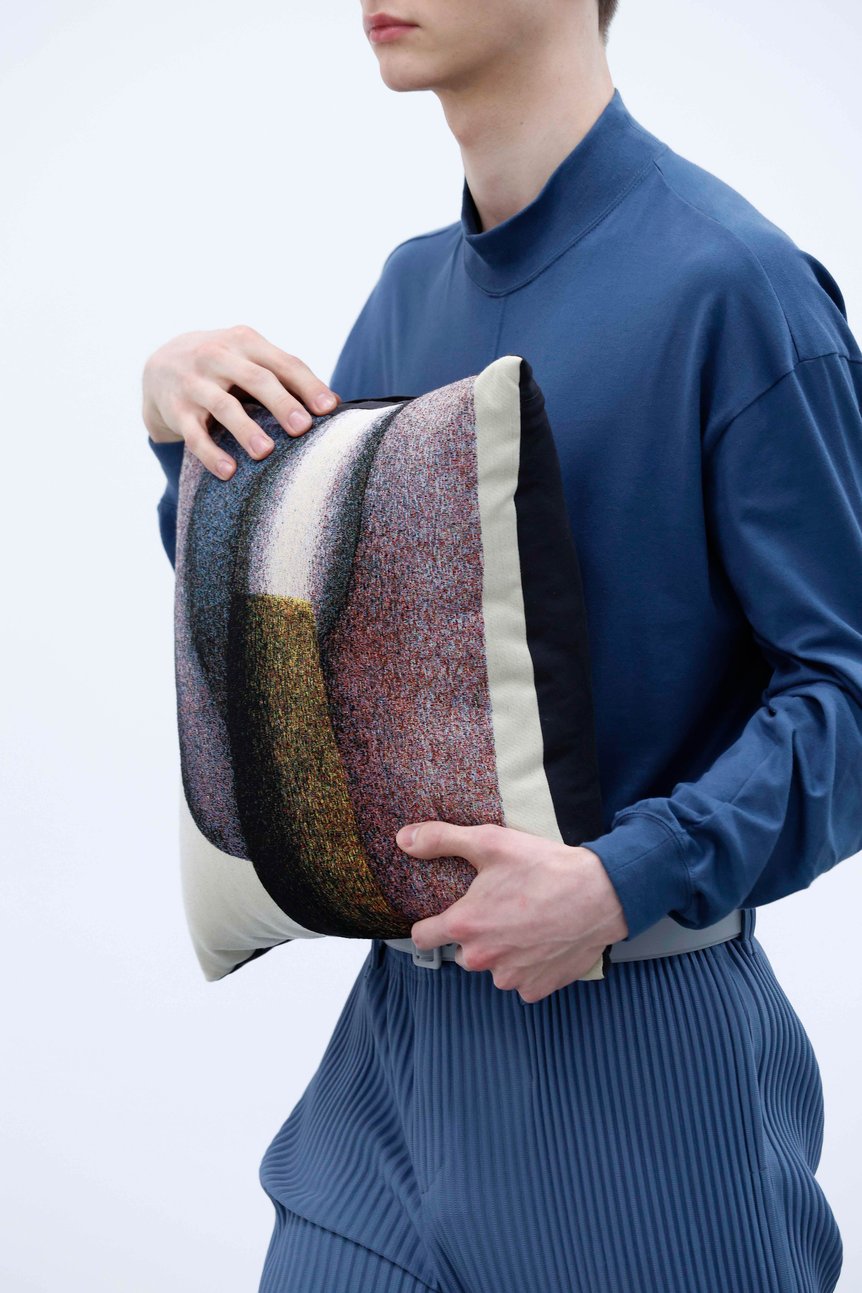 特にユニークだったのは、クッションとして収められるアウター。前身頃のポケットに付いたカバーにコートを入れ込めるパッカブル仕様になっており、クッションとしても使用することができる。クッションとしては作品の色味が原画のままで再現されており、コートとして着用する際には色味が反転し、異なる配色に変化するのもユニークな仕掛け。