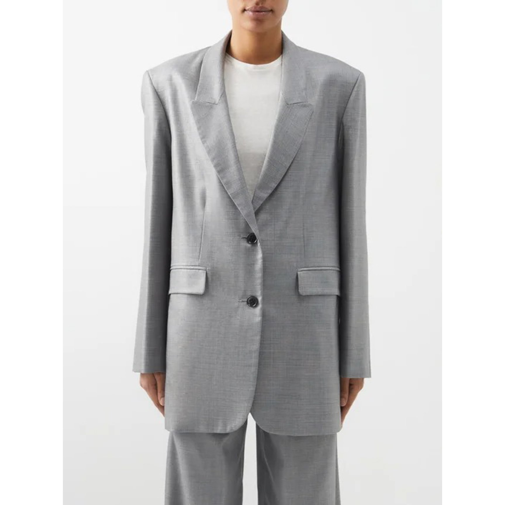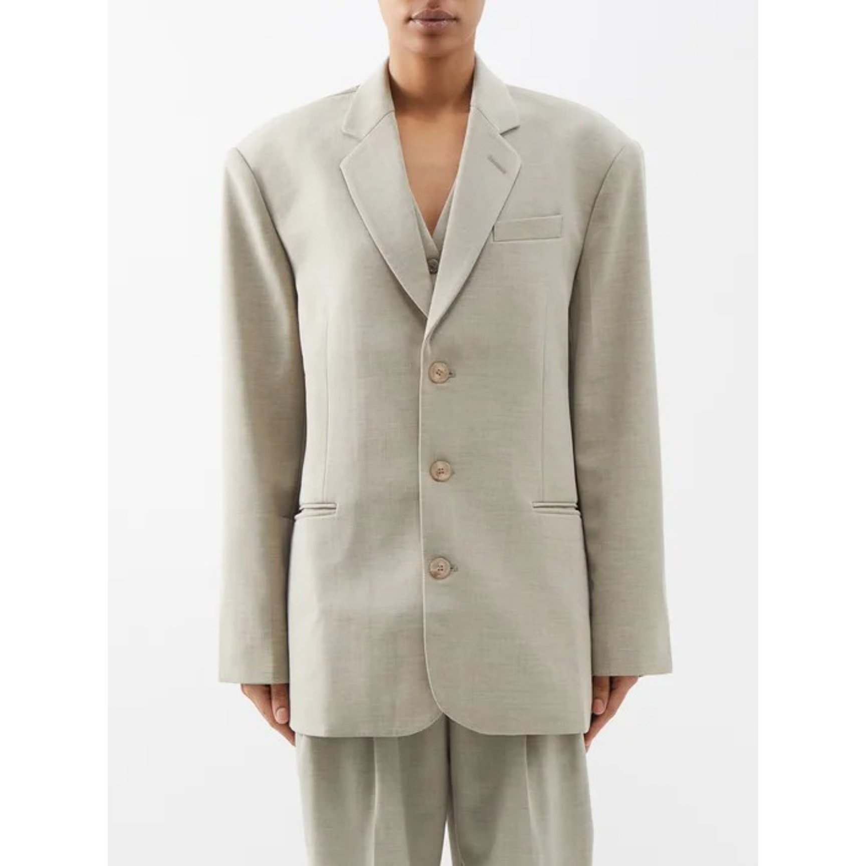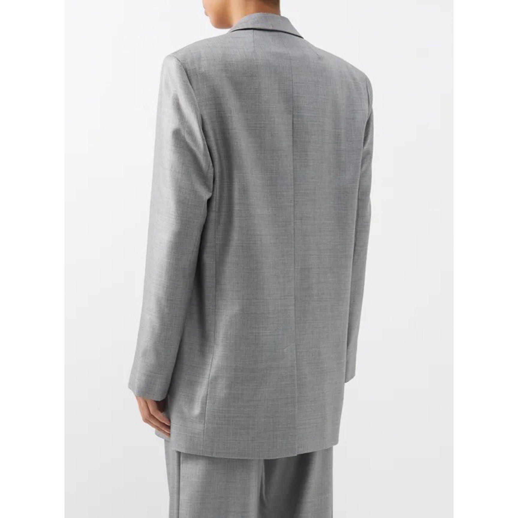 ウールとシルクをブレンドした、やや光沢感のある表情が上品な「レイ(Raey)」のスーツジャケット。ヒップまですっぽり覆うロング丈の一着です。ワイドパンツに合わせて全身オーバーサイズ気味で着こなすのもおすすめです。