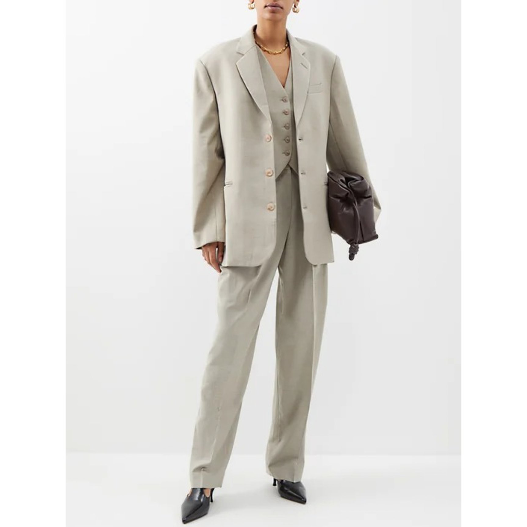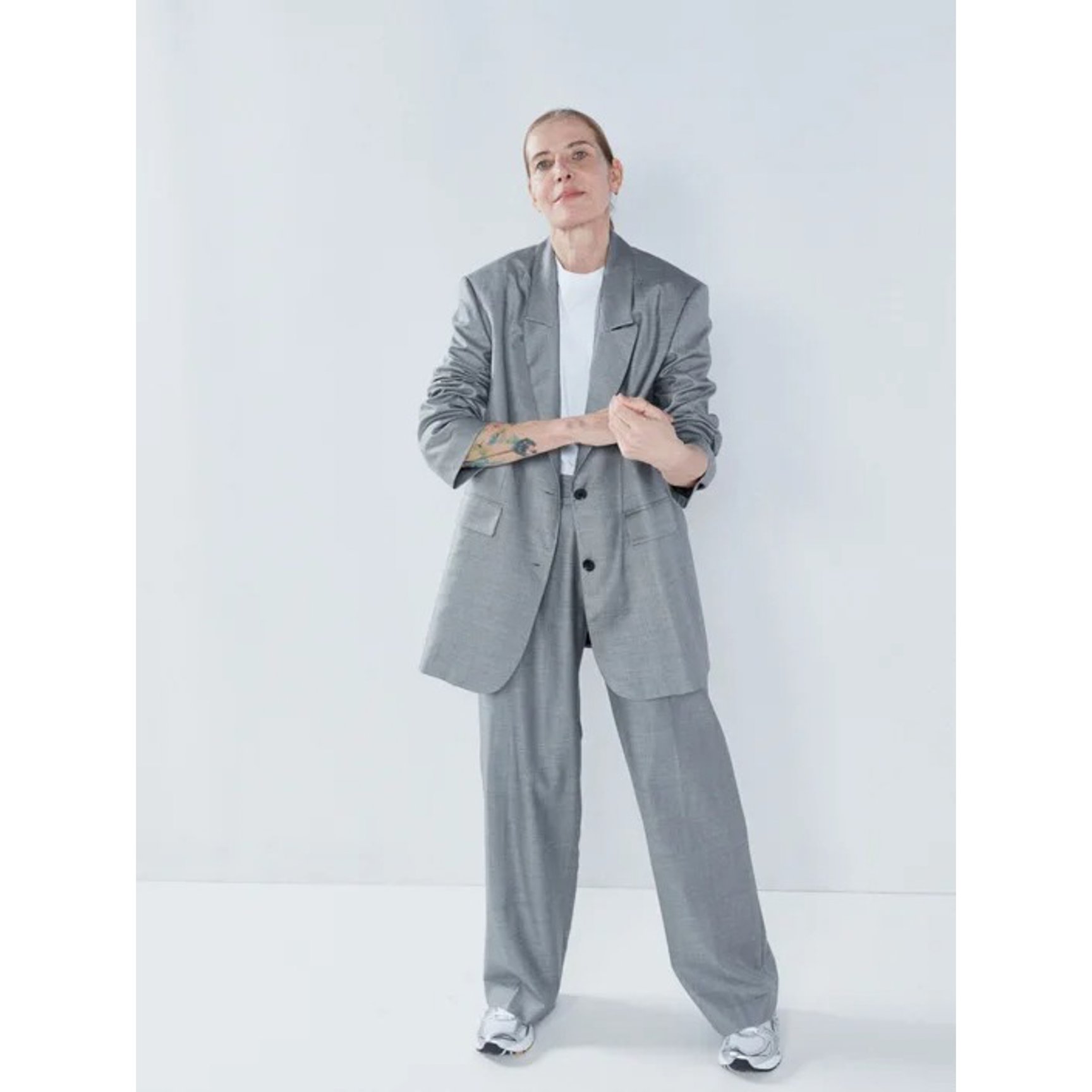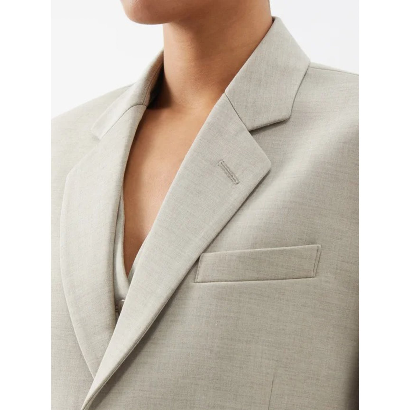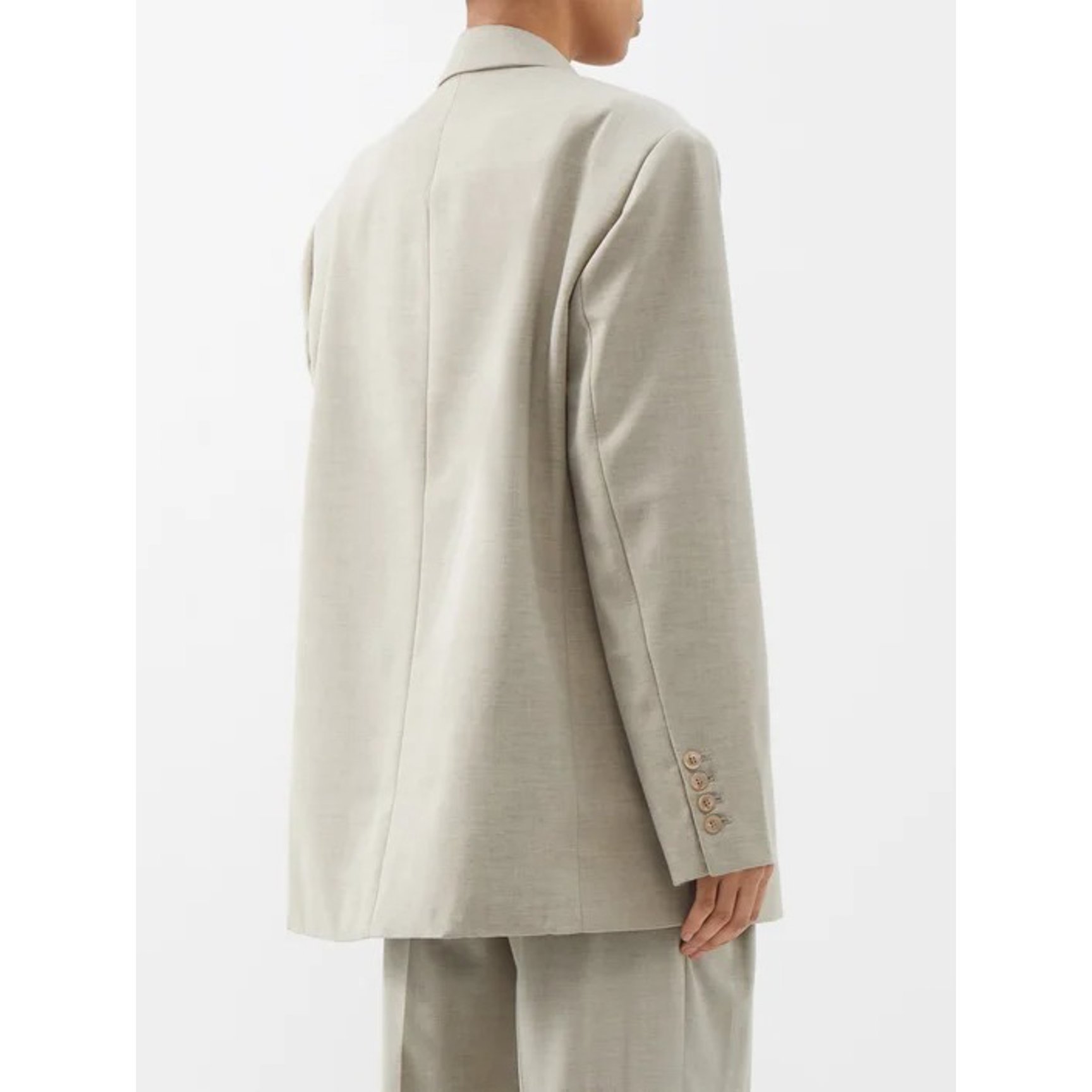 ウールとシルクをブレンドした、やや光沢感のある表情が上品な「レイ(Raey)」のスーツジャケット。ヒップまですっぽり覆うロング丈の一着です。ワイドパンツに合わせて全身オーバーサイズ気味で着こなすのもおすすめです。