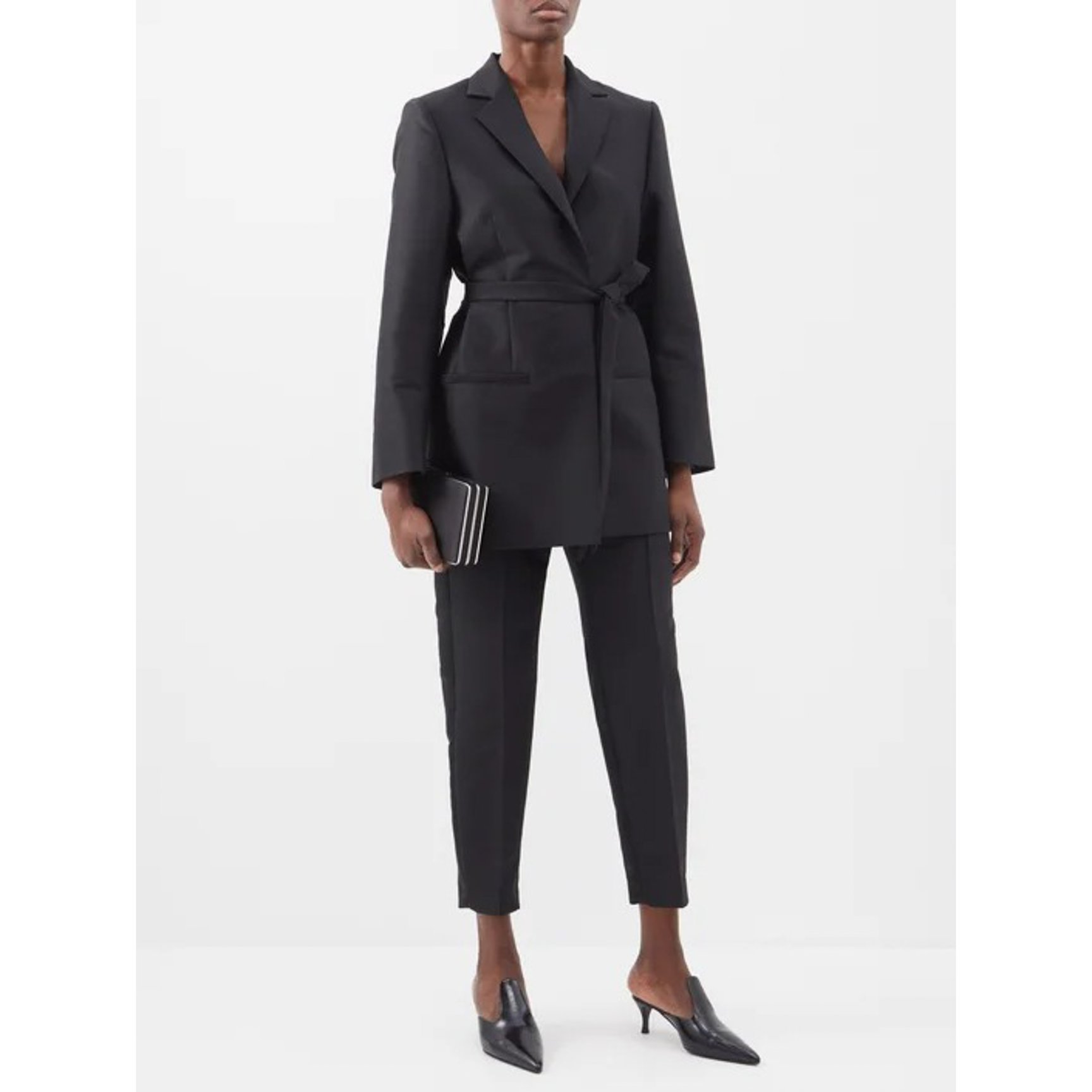 ウール×コットンブレンドの立体感とやや光沢感のある見た目に品が宿る「トーテム(Toteme)」のジャケット。ウエストベルトをきゅっと絞れば印象の違いが楽しめます。