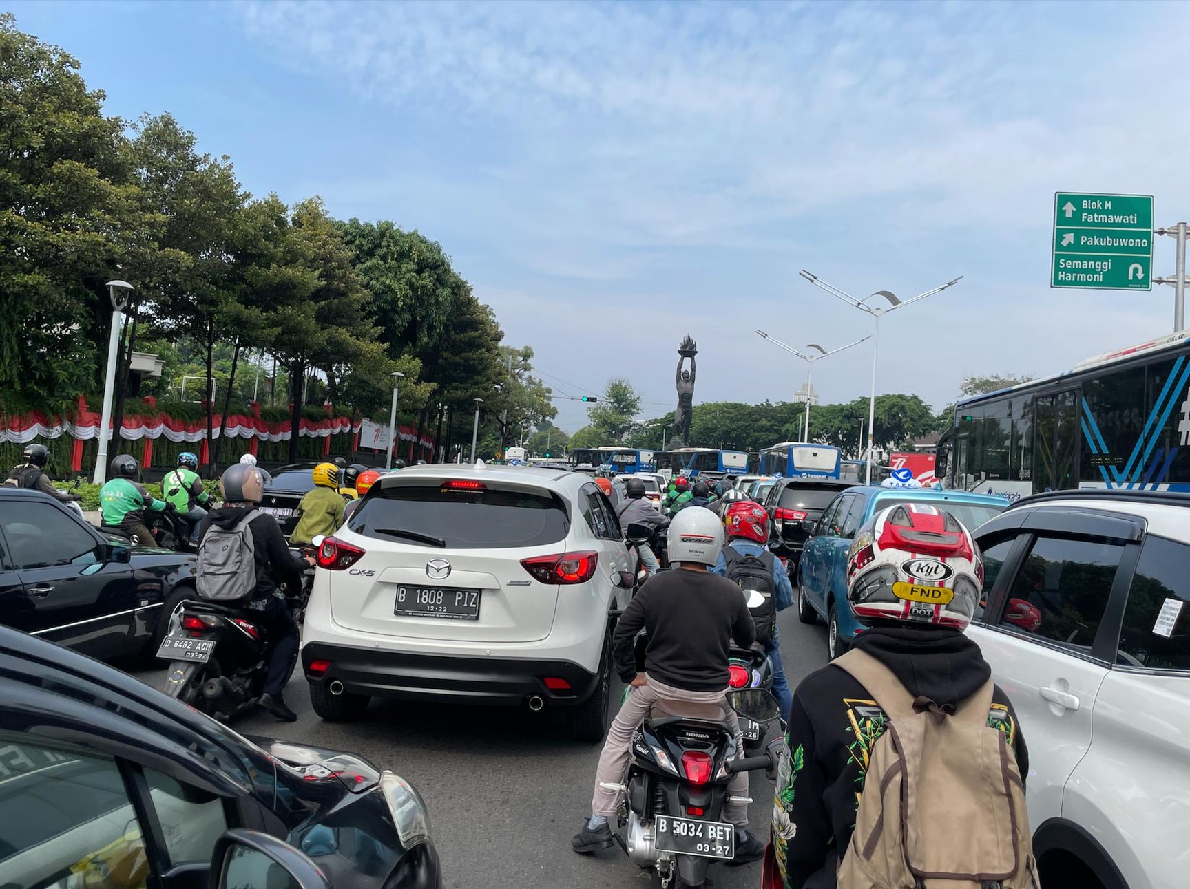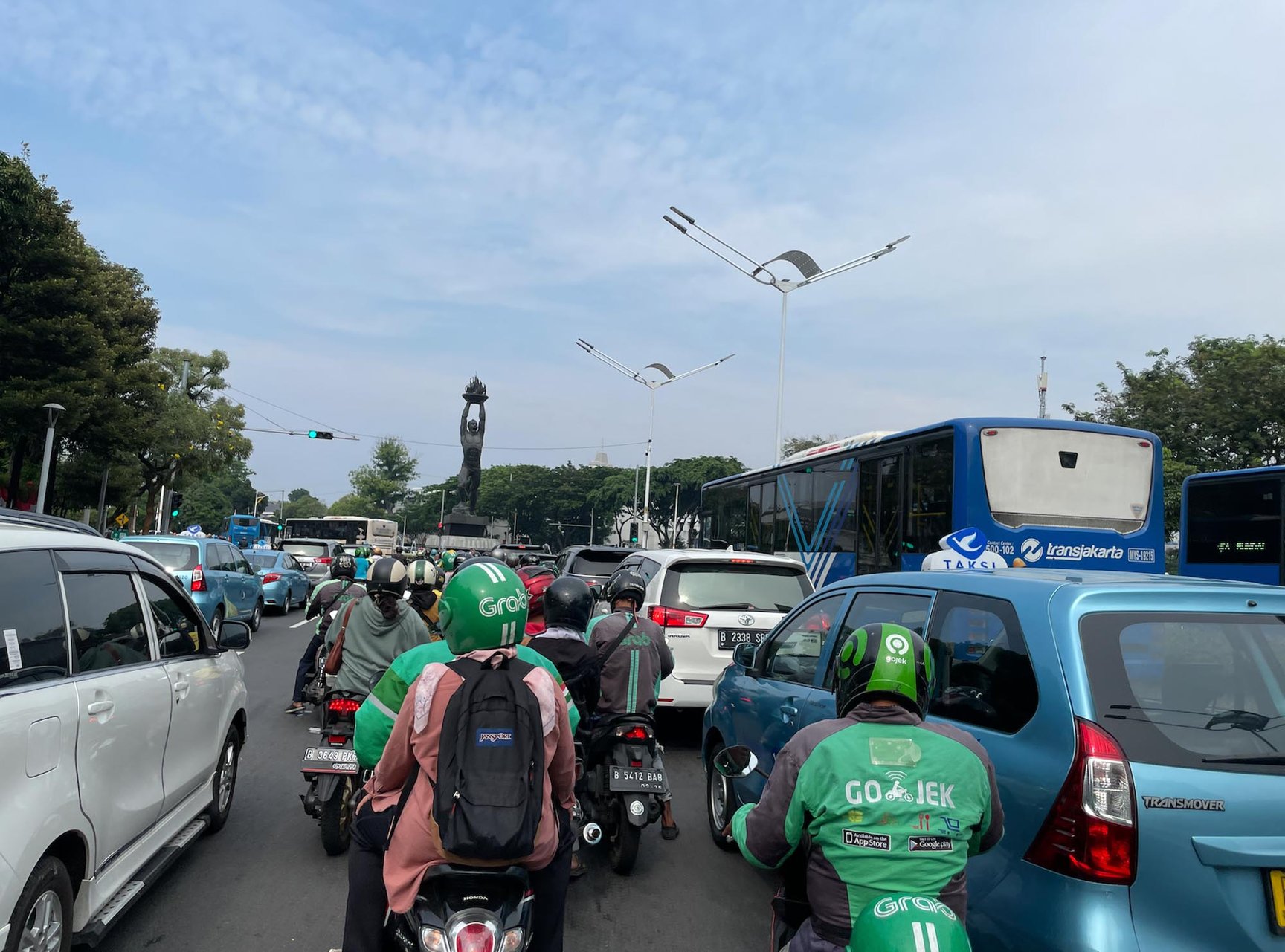 ジャカルタ市内はGojekドライバーだらけなので、街が渋滞しているとこんな感じです。グリーンの上着のバイクドライバーはバイクタクシーです。