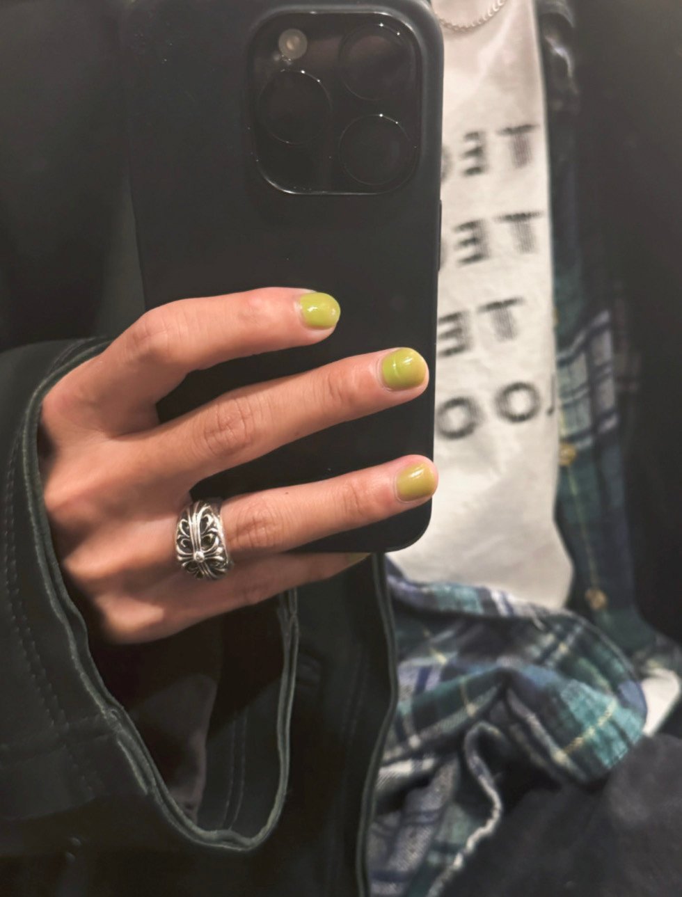 「マニキュリスト(manucurist)」のスプリングコレクションから、「プティポワ」をピックアップ。春らしい鮮やかなライトグリーンを、ダークグリーンのレザージャケットやチェックシャツと合わせてトータルコーディネート。発色が良く速乾性も高いので、時間がない人にもぜひ使ってほしいアイテムです。ワンカラーを美しく仕上げるコツは、剥げやすい先端→中央→左右の順ですばやく塗ること。ベースコートとトップコートも忘れずに!またカラーリングをオフするときは、爪周りの乾燥を防げるアセトンフリーの除光液を使うのがおすすめだそう。