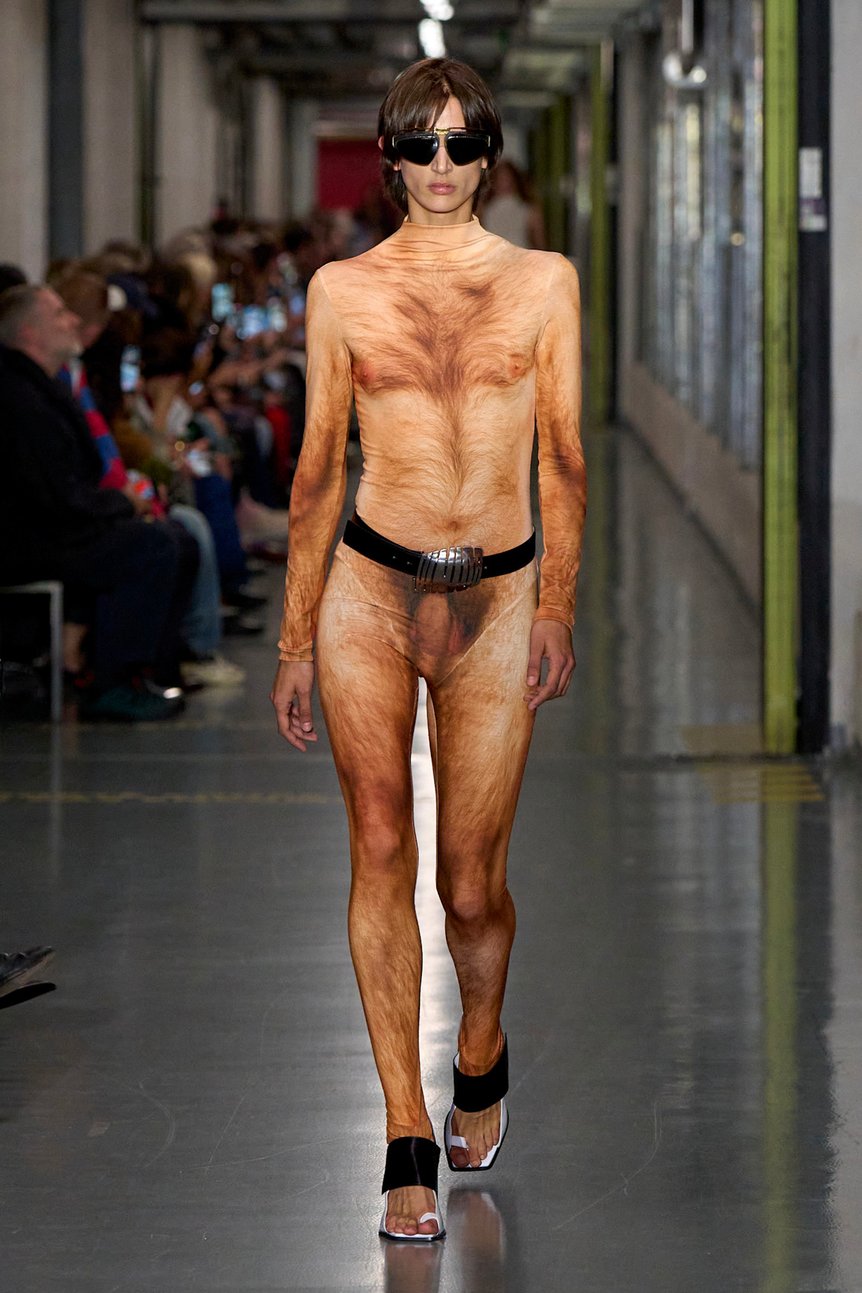 2026年春夏プレタポルテコレクションで、ランティンクはゴルチエの本質を「楽しく、エネルギッシュで、モダンで、緊急性があり、生き生きとしている」と直感的に捉えた。マリニエール・ストライプは目の錯覚を起こすように再解釈され、ゴルチエの代名詞であるタトゥープリントも披露。歪んだシルエットが生み出すスカートは宙を舞い、トロンプ・ルイユ技法で裸体をプリントしたボディスーツのほか、バーガンディや、マスタードイエロー、スカイブルー、グレーといったゴルチエらしい色使いも目を引いた。